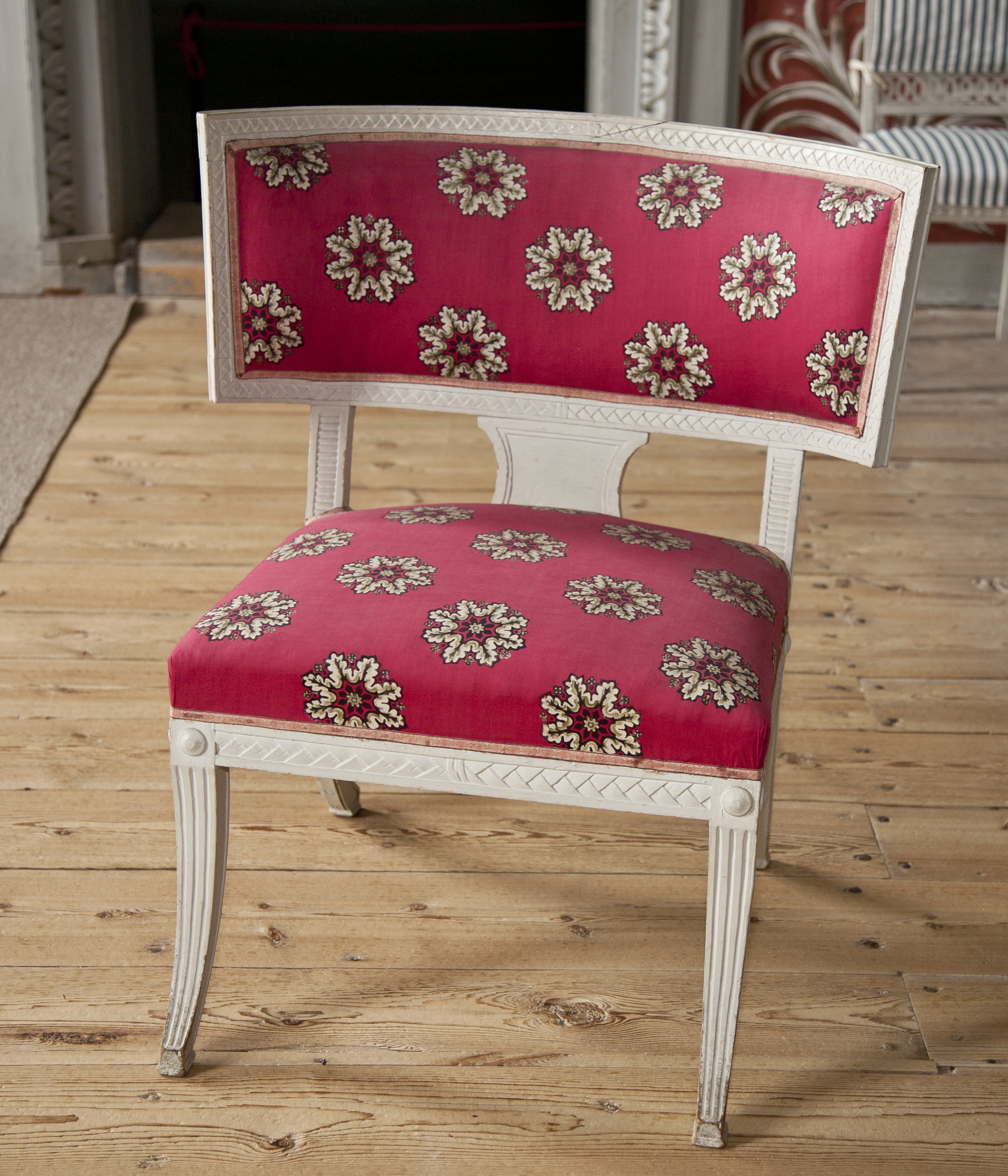 Stor, svängd ryggbricka. I sargen och ryggens ram skuren korgflätning. Klädsel av röd kattun med svart-vita rosetter. Stämplade: "EÖM". Erik Öhrmark, Stockholm, 1777-1813. Tillhörande överdrag av blå och vit randigt linne.