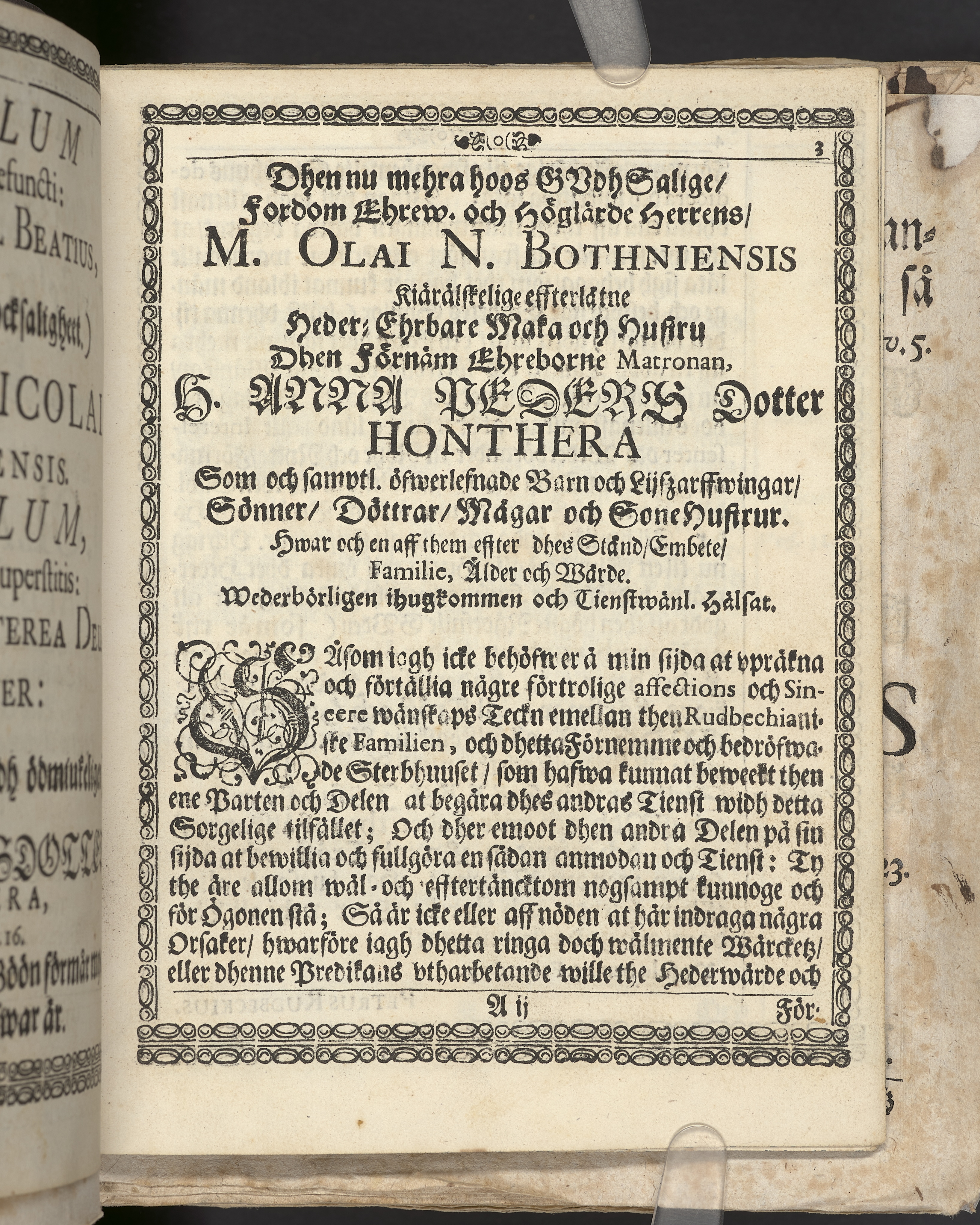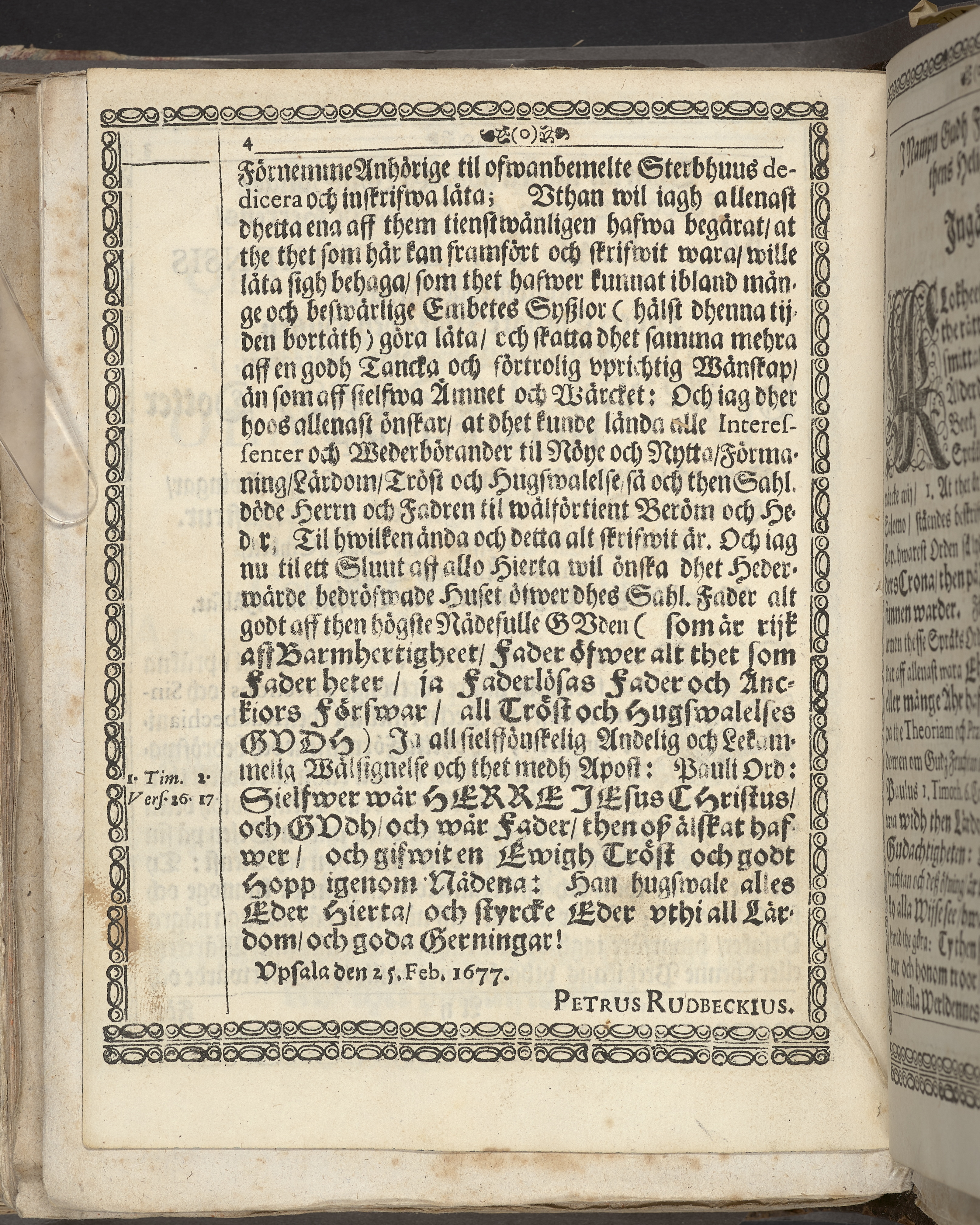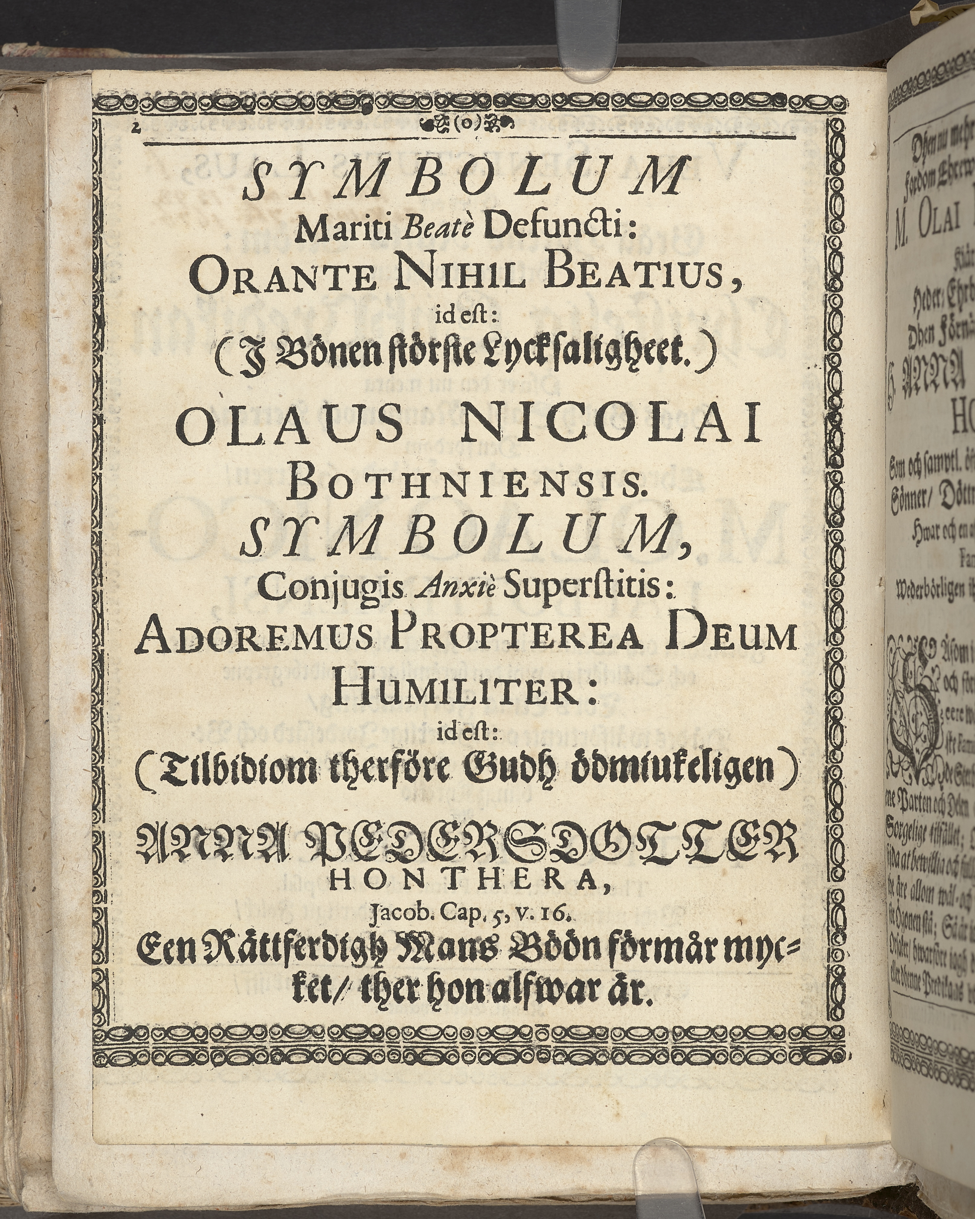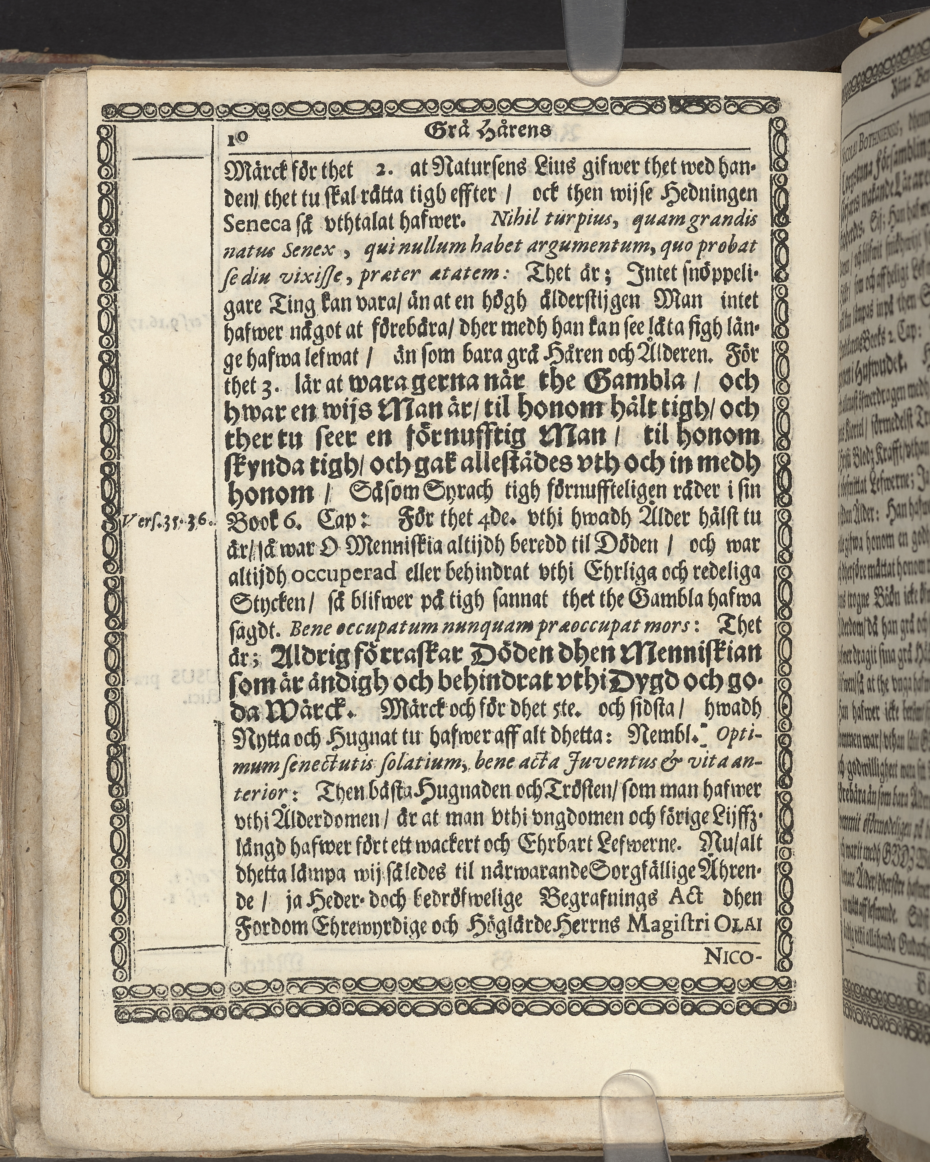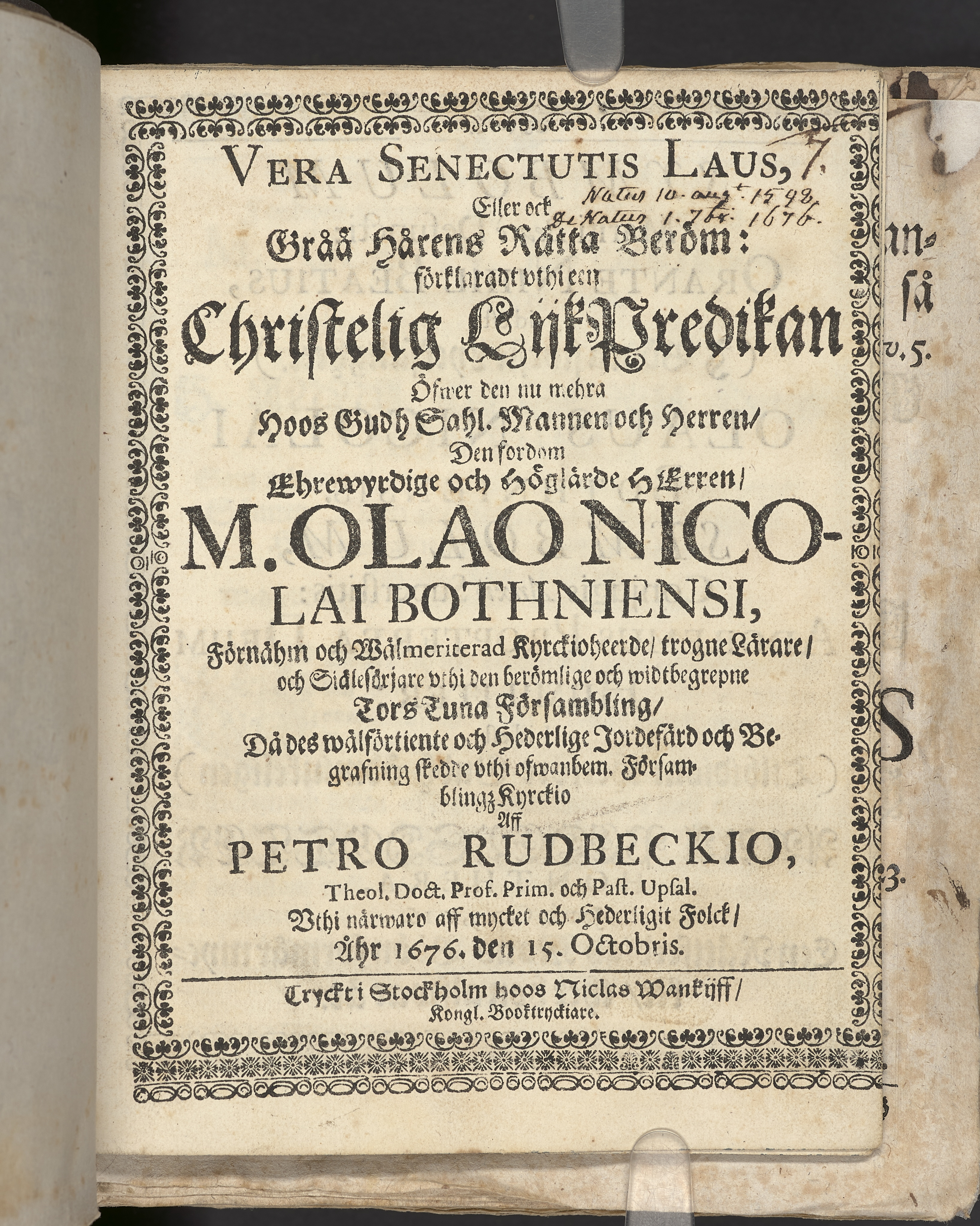 Vera senectutis laus, eller ock gråå hårens rätta beröm: förklaradt vthi een christelig lijkpredikan öfwer ... Olao Nicolai Bothniensi, förnähm och wälmeriterad kyrckioheerde, trogne lärare, och siälesörjare vthi den berömlige och widtbegrepne Tors Tuna försambling, då des wälförtiente och hederlige jordefärd och begrafning skedde vthi ofwanbem. församblingz kyrckio aff Petro Rudbeckio ... åhr 1676. den 15. octobris. Tryckt i Stockholm hoos Niclas Wankijff, kongl. booktryckiare.
