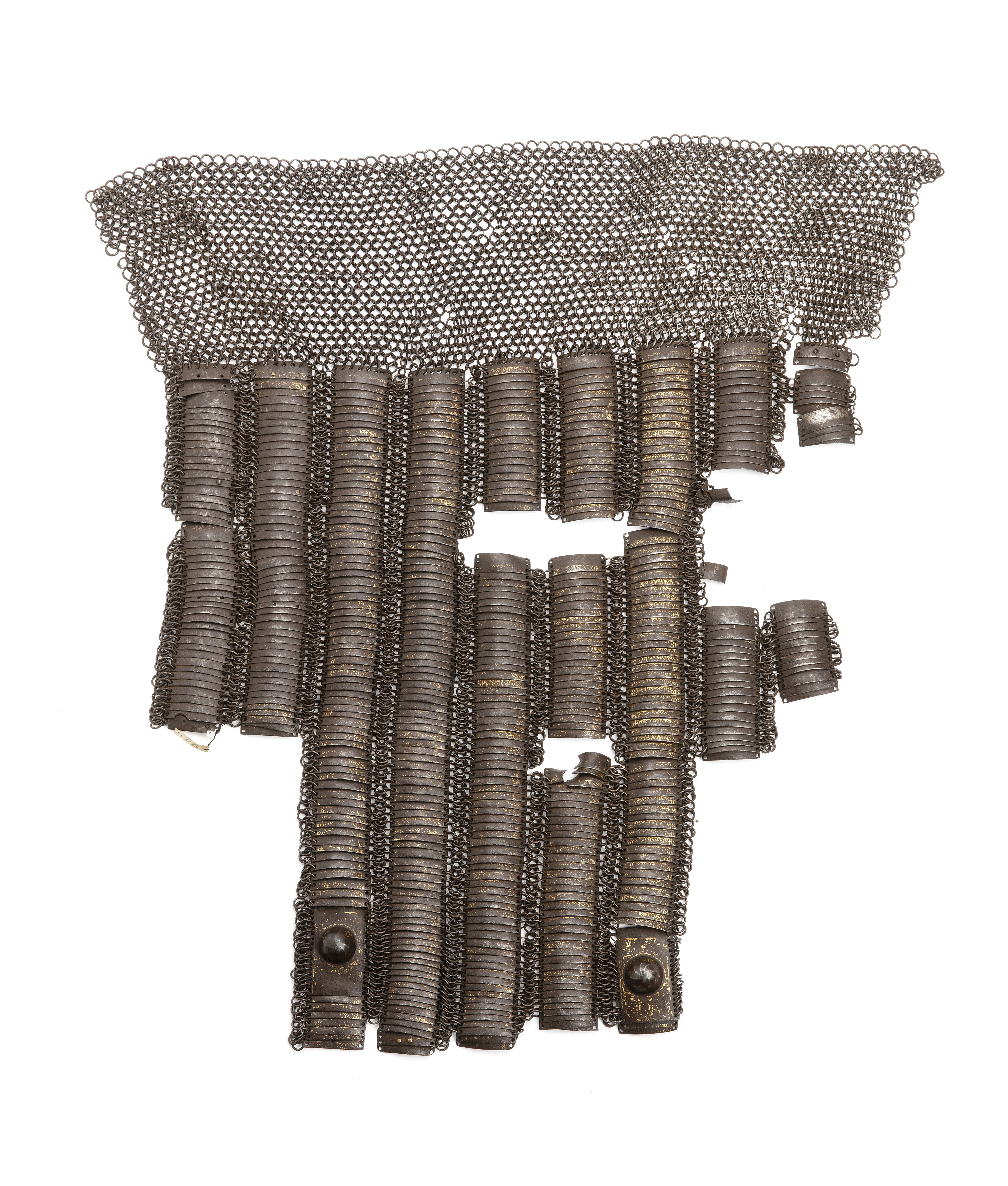 Av järn, bestående av skenor och ringar, de förra 50 mm långa, 15 mm breda, ordnade i 9 vertikala band; varje skena har i motstående smalsidor tre ringhål och är så lagda intill och över varandra, att varje ring dras genom 3 skenor, med den därjämte omfattar 2 dubbelringar, som utgör förmedlingen till nästa rad; de fem mellersta radernas skenor är guldtauscherade i skrift och ornament; de yttersta av dessa fem ha upptill var sin 80 mm hög skena, på mitten utdriven i en spiralformig, räfflad knapp; ringarna är nitade och med 10 mm tvärsnitt; utom de ovan beskrivna bildar de nedtill en 200 mm hög pansarbård. Se 5787:1 - deposition från SHM 1900-04-03. SHM nr 320, avlämnad 1750. Persisk (med blyerts turkisk), 1600-talet.