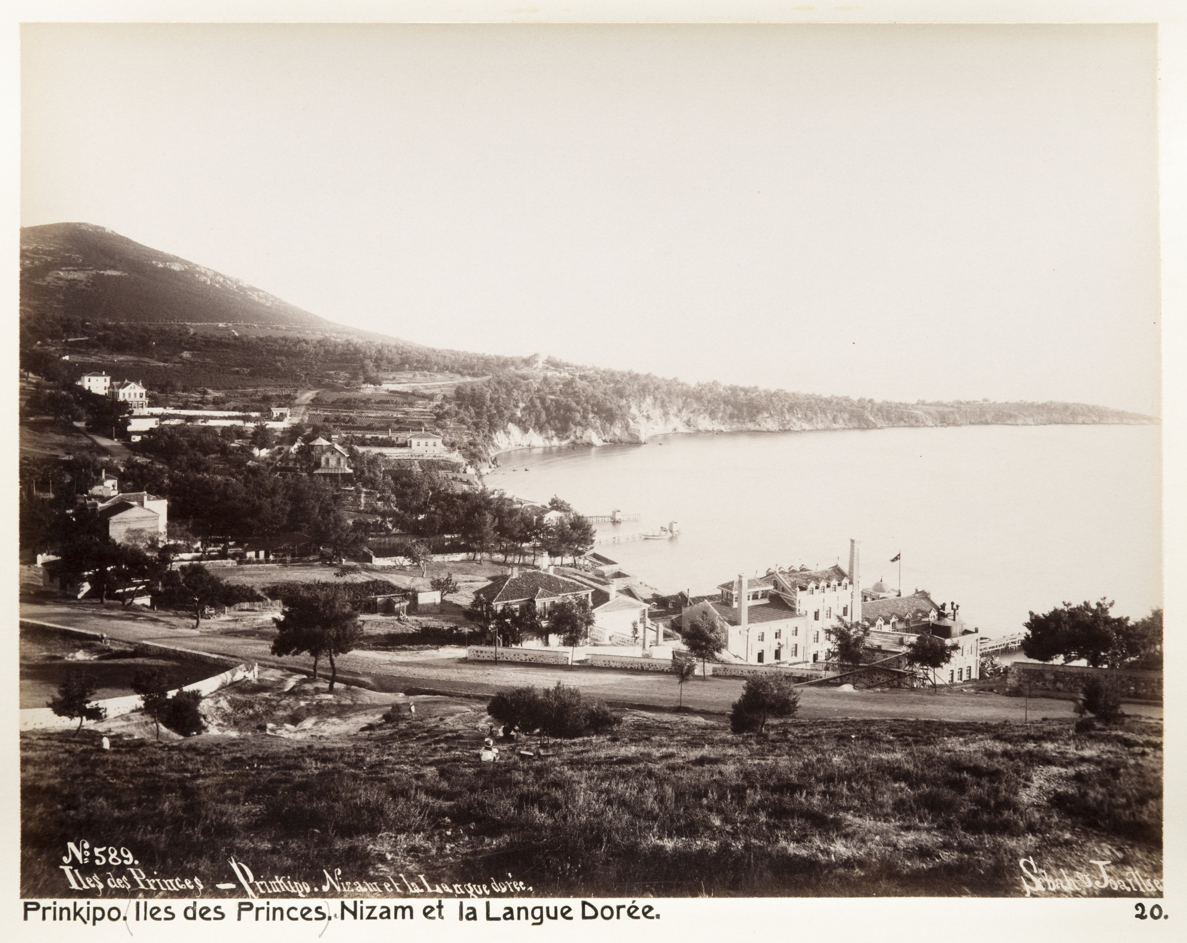 Büyükada (Prinsöarna). Nizam och Gyllene hornet. Text på originalet: "Prinkipo (Iles des Princes). Nizam et la Langue Dorée." Fotografierna LXVI:O.01.-54. kommer från resan till Turkiet och Mindre Asien som Wilhelmina och Walther von Hallwyl gjorde den 27 april - 20 juni 1901. De lämnade Sverige den 5 november 1900 för Egypten, där de stannade till den 28 mars 1901, då de fortsatte till Palestina. Den 27 april fortsatte de till Turkiet och Mindre Asien. Med på resan var Wilhelminas sällskapsdam, fröken Ida Uhse. I Konstantinopel (Istanbul) anslöt sig Wilhelminas mor Johanna Kempe och kusindottern Elma Hök. Fotografierna är inköpta av Wilhelmina i Konstantinopel (Istanbul) och Brussa. Alla uppgifter kommer från Ida Uhses reseanteckningar.
