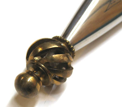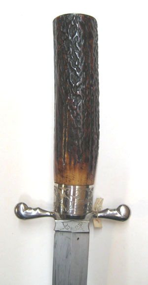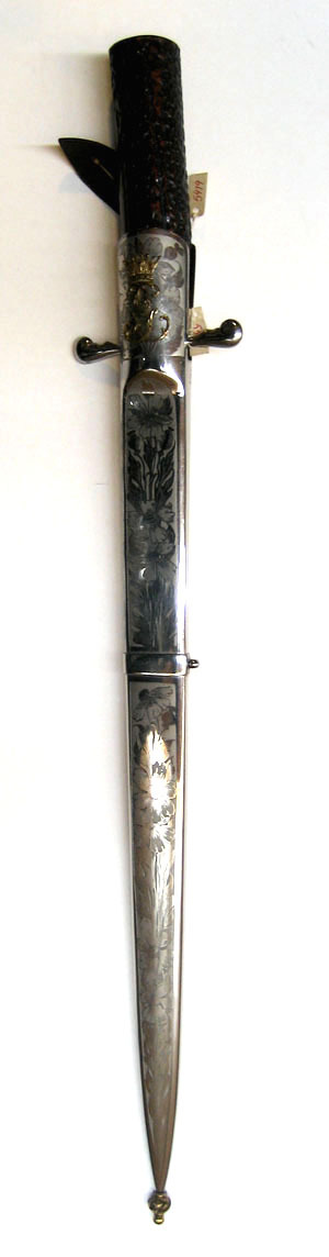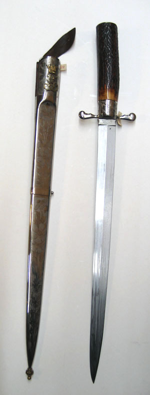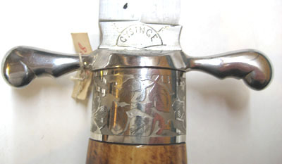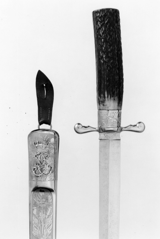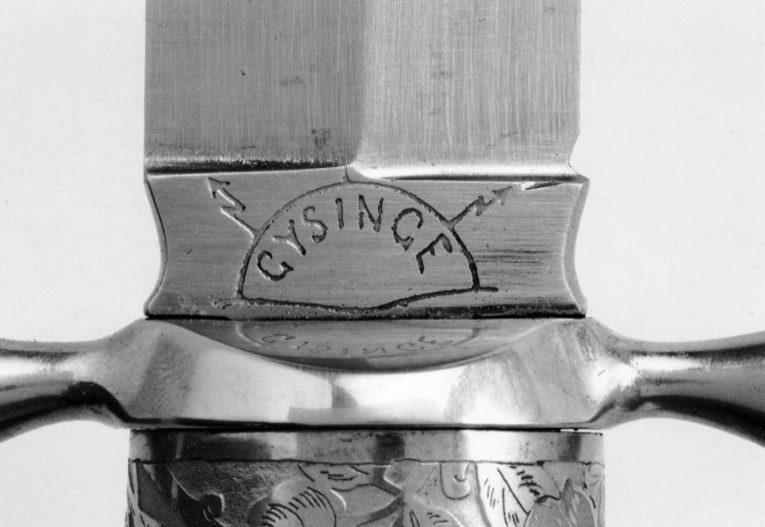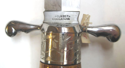 Fäste av brunt horn, upptill en plan, rund stålplatta med etsad dekor av blommor och blad, allt mot matt bakgrund. Nedtill på fästet ett 21 mm högt beslag av stål med samma ornering som på fästets övre beslag. Korta, raka parerstänger med hjärtformigt vidgade ändar. Klinga rak, eneggad med mötande skär, ryggen avsmalnande ca 58 mm från spetsen. 19 mm lång ricasso med insvängda sidor och etsad text, på utsidan: "GYSINGE" inom en halvsfär samt snett utåtriktade blixtar, på insidan: "P. HOLMBERG ESKILSTUNA".