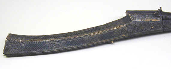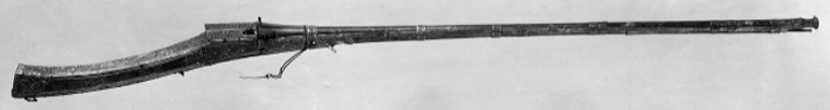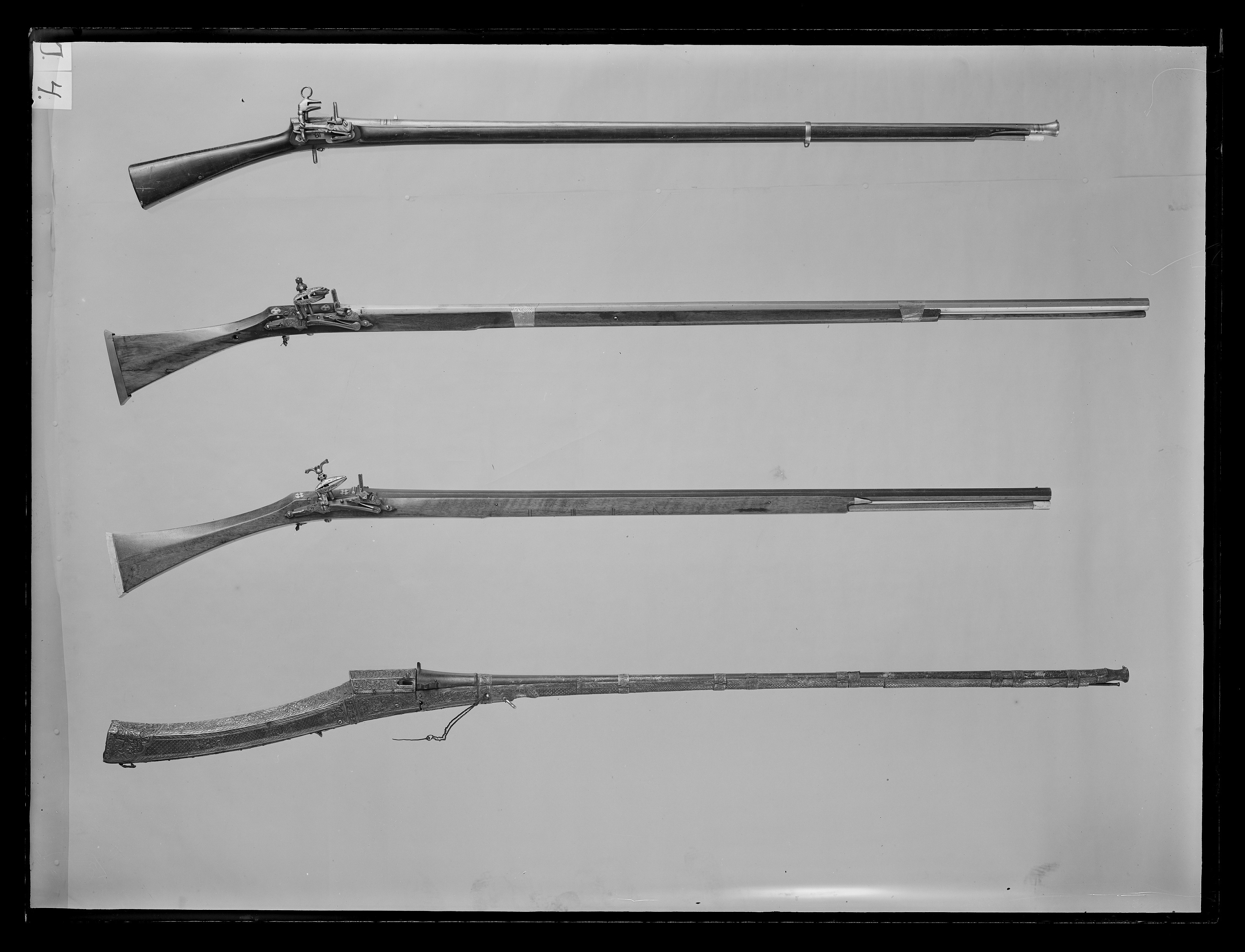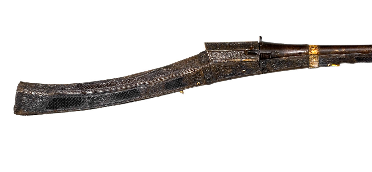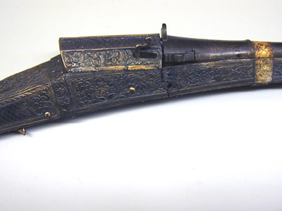 Rund, slätborrad pipa av stål, på ovansidan rester av påslaget guld. Mynningen något timglasformig med längs- och tvärgående tunna räfflor. På höger sida fäst fängpanna med kraftigt profilerad utsida, locket saknas. Riktmedel: Ståndsikte av stål på pipbasen, knoppkorn av förgyllt stål. Fästning: Pipan fäst med 10 stycken parvis placerade pipband av silver. Invändigt luntlås med synlig förgylld luntklämma. Helstock av trä, helt täckt av tunn, driven och graverad silverplåt med dekor av rankor, blommor och fjäll och spår av förgyllning och mörkanlöpning. Kolv smal, utdragen svagt uppåtböjd med åsad rygg baktill med två nedanför varandra ställda hål. På pipans undersida vid kammaren en liten förgylld bygel för bäranordning. I det första pipbandet en liten ring med kedja av silver i vilken rensnål av förgyllt stål är fästad.