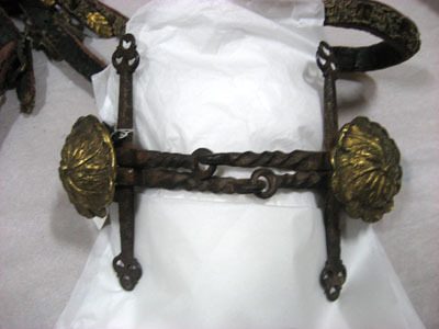 Tränsbett med förgyllda parerstänger och förgyllning en bit in på munstycket. Dubbla munstycken, tvådelade med omlott liggande leder. Skarpa munstycken av vridna fyrkantiga stålstänger. Parerstängerna rundade, i änden utplattade och utsmidda i en treklöverliknande form med genombruten dekor. Fästen för buckla i tygelbyglarna. Rund buktig buckla med diameter 58 mm, förgylld metall med från mitten utstrålande akantusmönster. Munstyckenas längd 126 mm, diameter 7-8 mm.