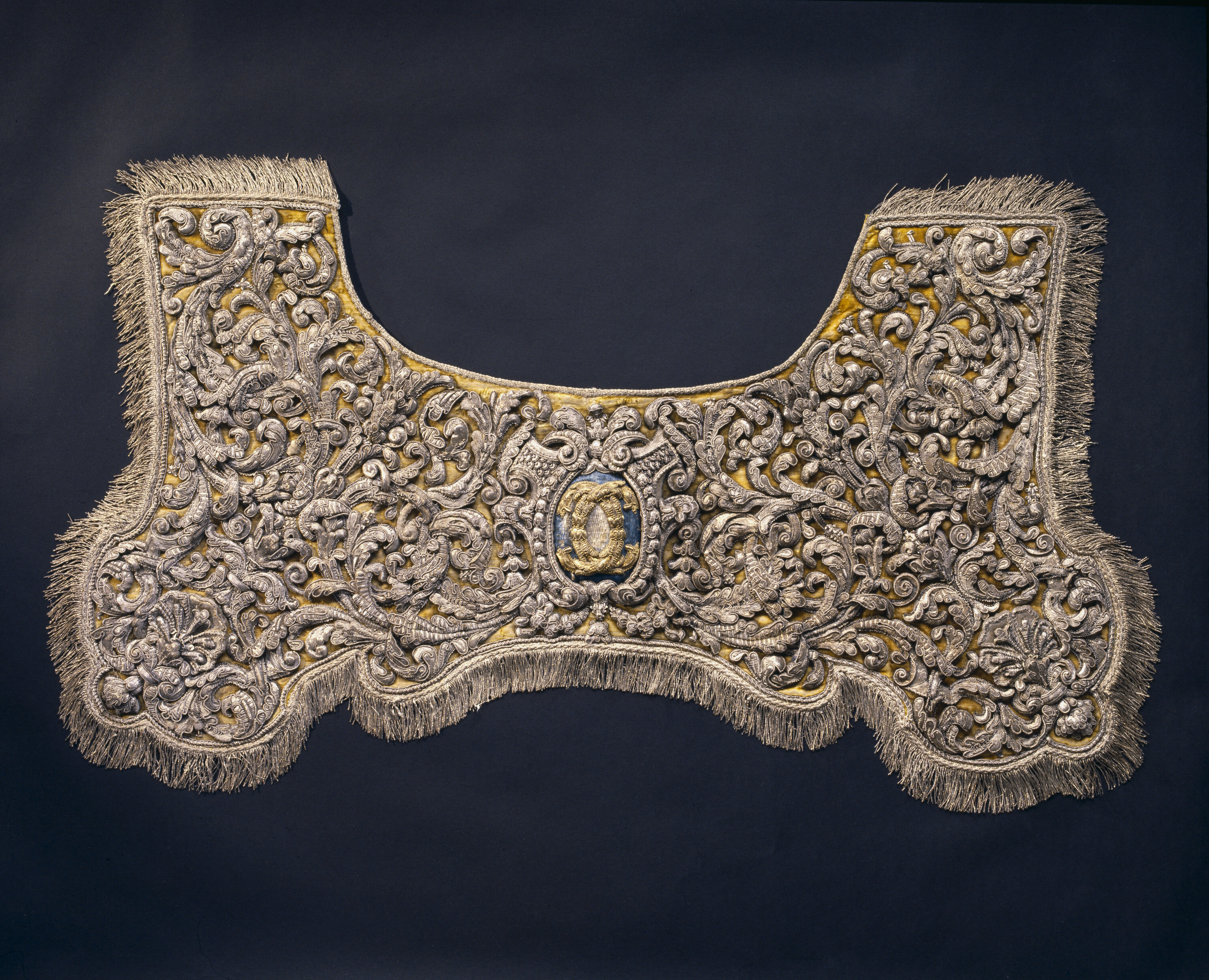 Ingående i franska gåvan till Karl XI 1673, avsedd för häst nr 10, Le Frontinaux. Schabrak av ursprungligen citrongul sammet med yttäckande silverbroderi i relief. Mitt på ryggen Karl XI:s namnchiffer ett dubbelt C - i guldbroderi på en botten av blått silke och silvertråd. Utmed kanten en 50 mm bred silverfrans. Foder av gul ylle.