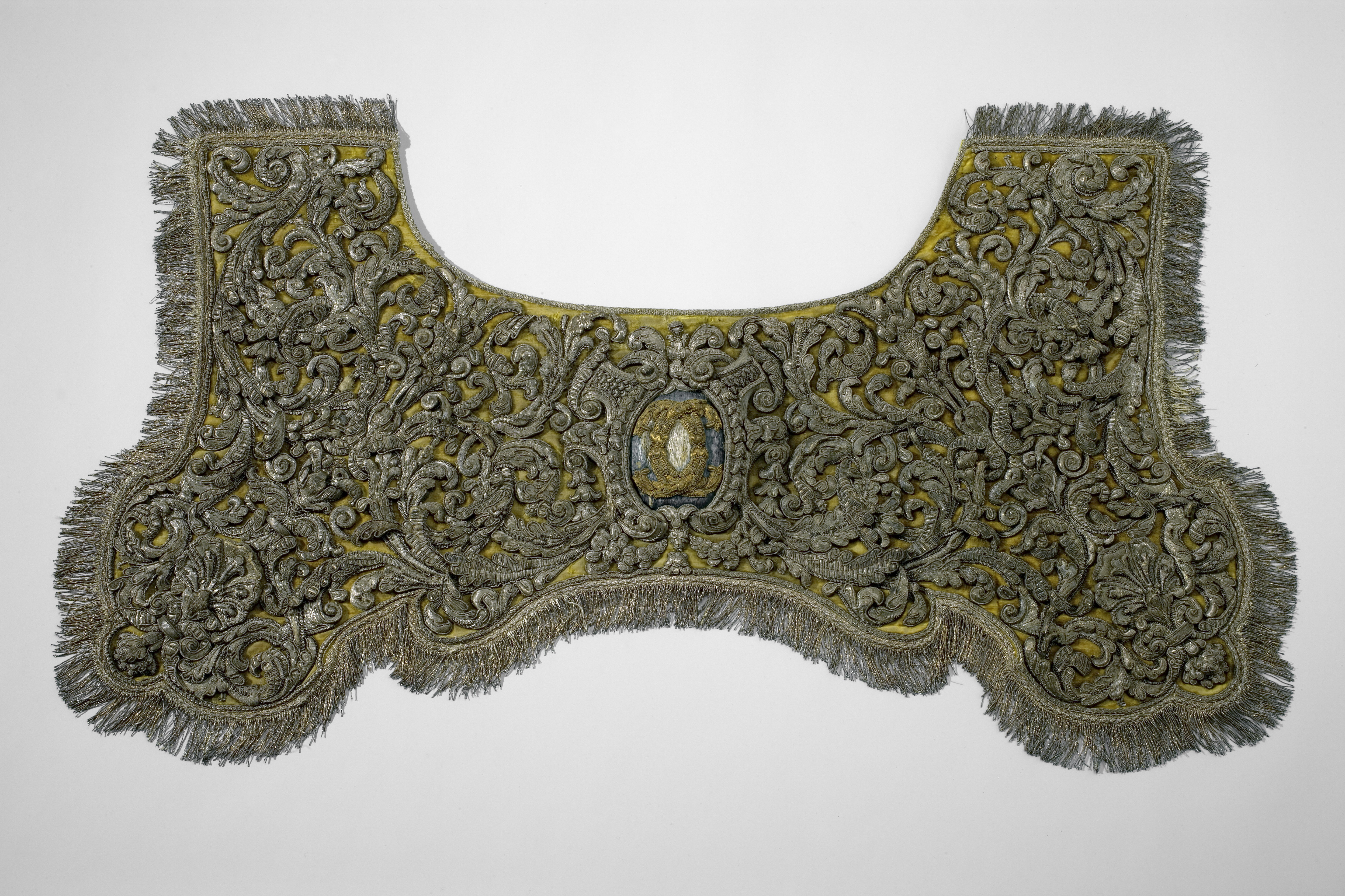 1 st Sadel af gult Sammet med en Silwer Lisqvard med Silfver Brodderi (2 st Tennlikor samt en tenlika på Ryggstycket felas)