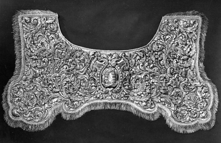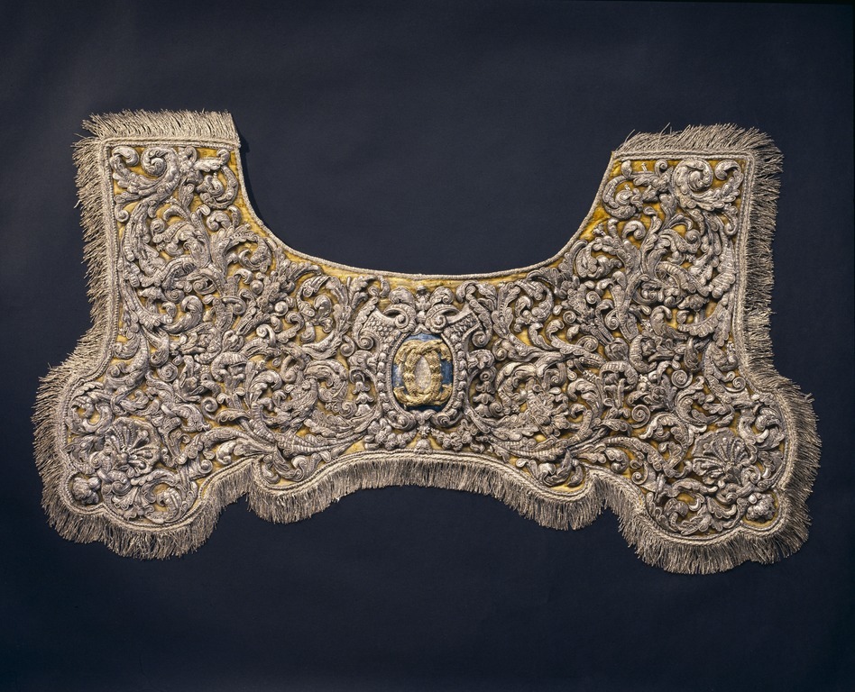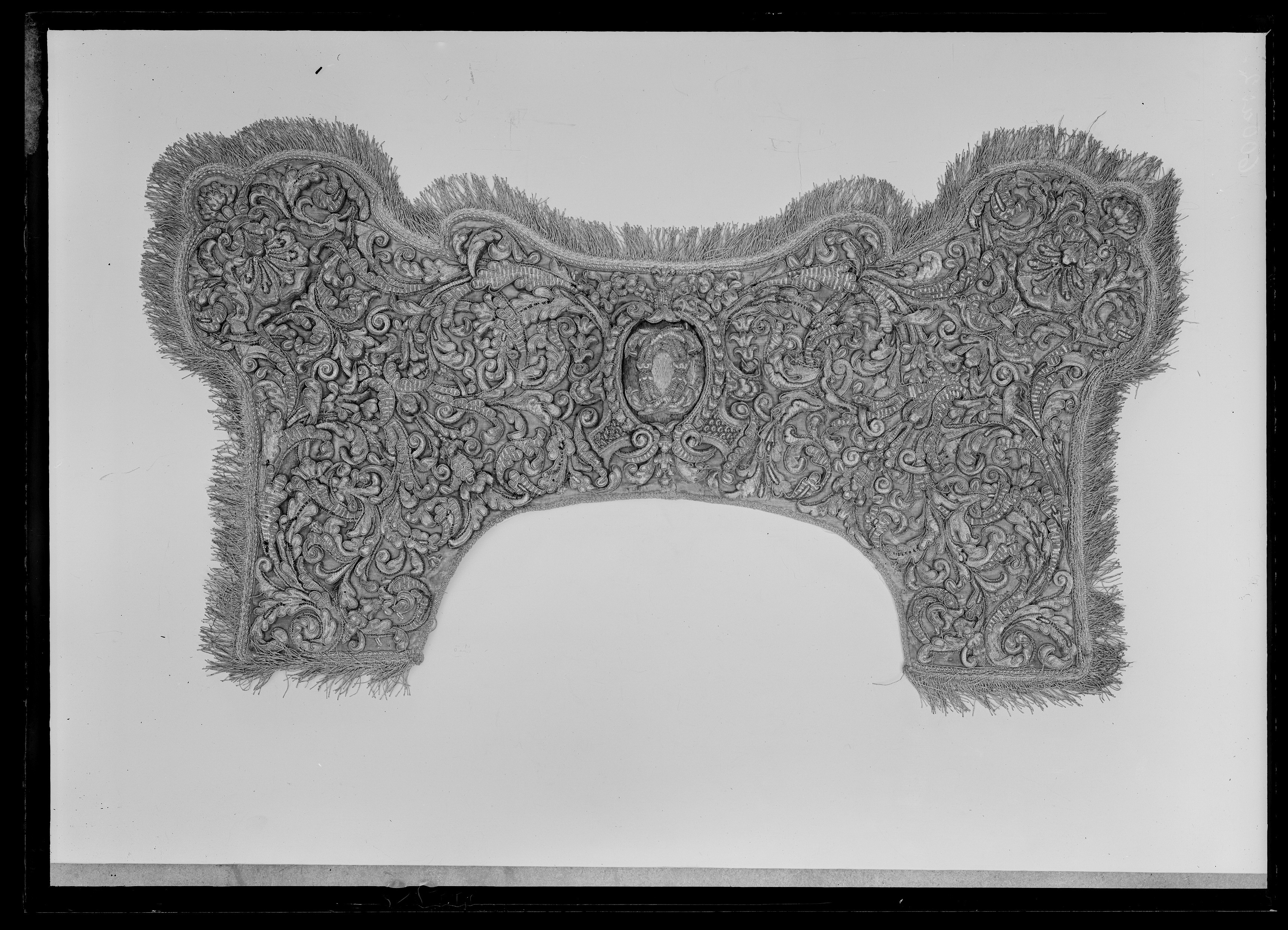 1 Sadel af citronfärgadt sammet; sadelkåpan, hölsterkappore och eschabraquet broderade af upphöjdt silfver, på eschabraquet dubbel C, broderadt på guld med blomerant....