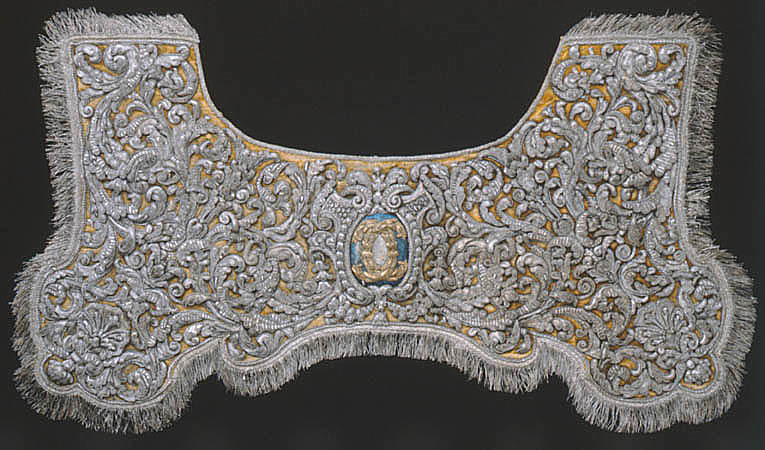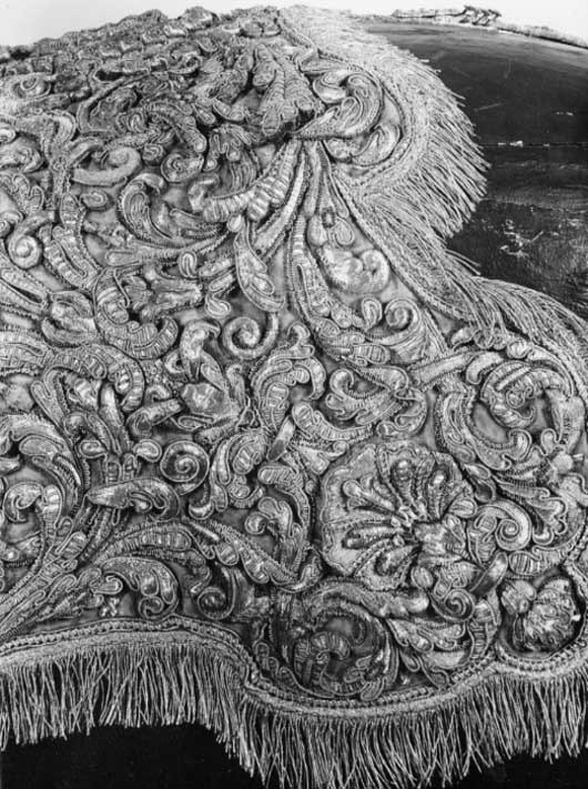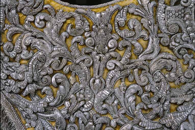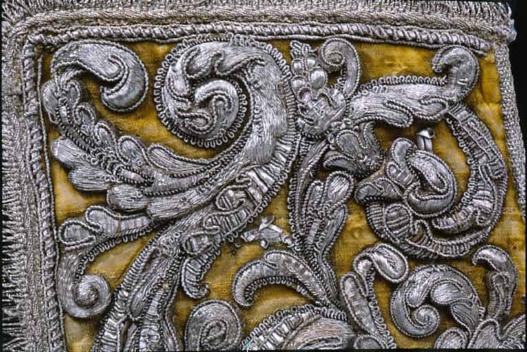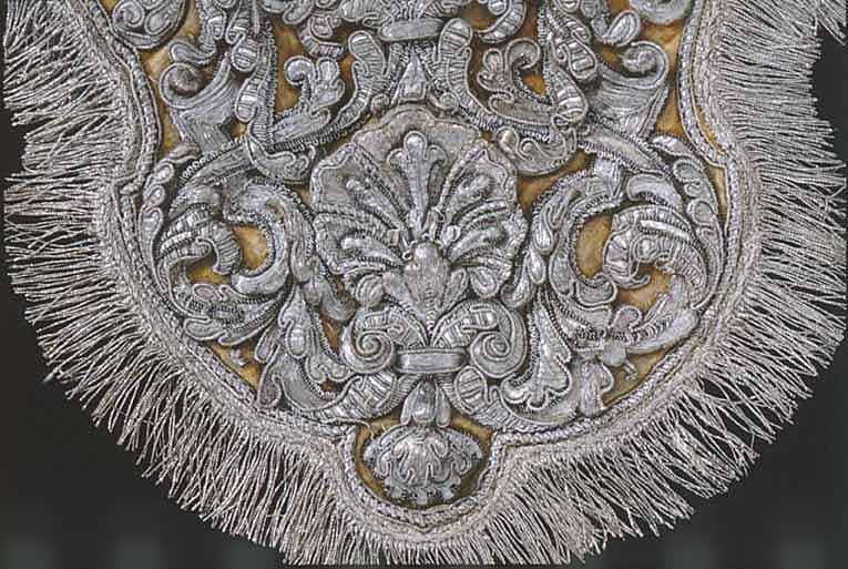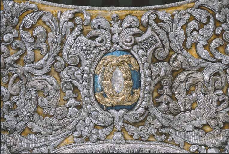 Hölstren af guld saffian beslagne med silfver; Remmar och söljor af silfver. Husen af citronfärgad moire med en stor silfverfrans omkring