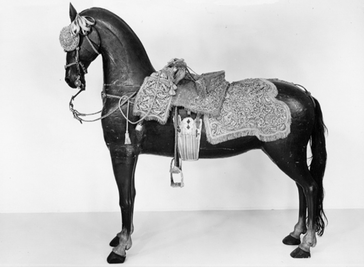 En ny Sadell, af Citronferga Sammet, Sätet är stickat med en grann Guld-Litzqward, Sadellkåpan och Höllster-Kapporne med Eschabraquet brodderade af uphögdt Sölfwer. På Eschabraquet Hans Kongl. Maijstts namn Brodderat, med Guld på blomerant , Sadelen, Eschabraquet och Höllster-Kapporne runt omkring med Sölfwer-Frantsar besatte. Sadelknappen med en Sleiff utarbetad af rent Silfwer sammaledes finnes fram och bak på Sadelen inslagne 41 st Tänglickor af massift Sölfwer med uphöfna hufwuedne.