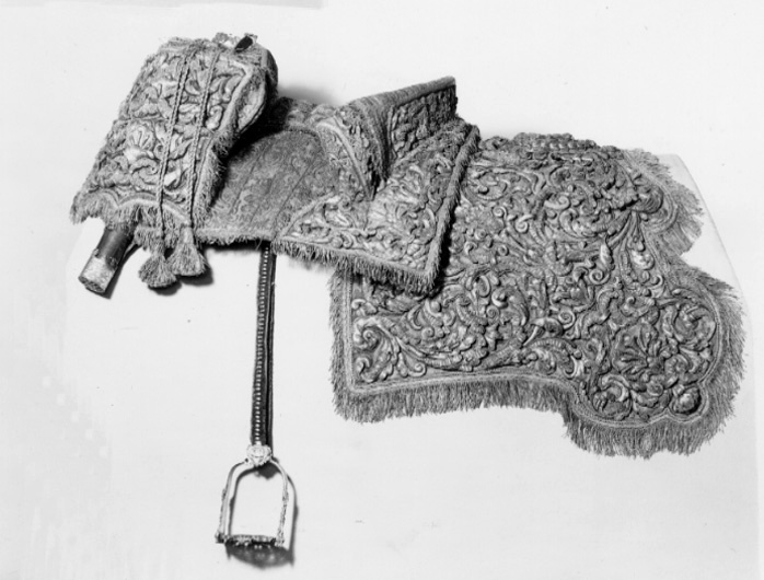 Sadel af citronfärgadt sammet med sadelkåpa, hölsterkappor och schabrak ornerade och broderade i silfver med med silfverfransar och tofsar; på schabraket dubbelt C broderadt i guld; sadelknappen med en sleif af rent silfver, och på sadeln tennlickor af samma metall; förbygeln af gult saffian med en silfvergalon och beslagen med silfverstifter, pucklor och söljor af drivet arbete; ryggstycket lika med förbygeln och beslaget af en defekt silfvergalon, beslaget som utgöres af gult saffian, beslagne med utarbetadt silfver; remmar med söljor af silfver; husen öfver pistolkapporna af citronfärgadt moiré med en silfverfrans; hufvudstället och tygeln lika med förbygeln - beslaget af silfver -; 4 st. pannkedjor; betselstängerna försilfrade med 2 buketter af silfver; 1 par runda pistolhufvuden (tillskrivet med blyerts: blindor) i samma broderi som sadeln; remmarne af gult saffian med söljor och styfter af silfver (saknas); handtygeln saknas och på stigläderna äro 39 tennlickor bortfallna. (Förärad från Frankrike.)