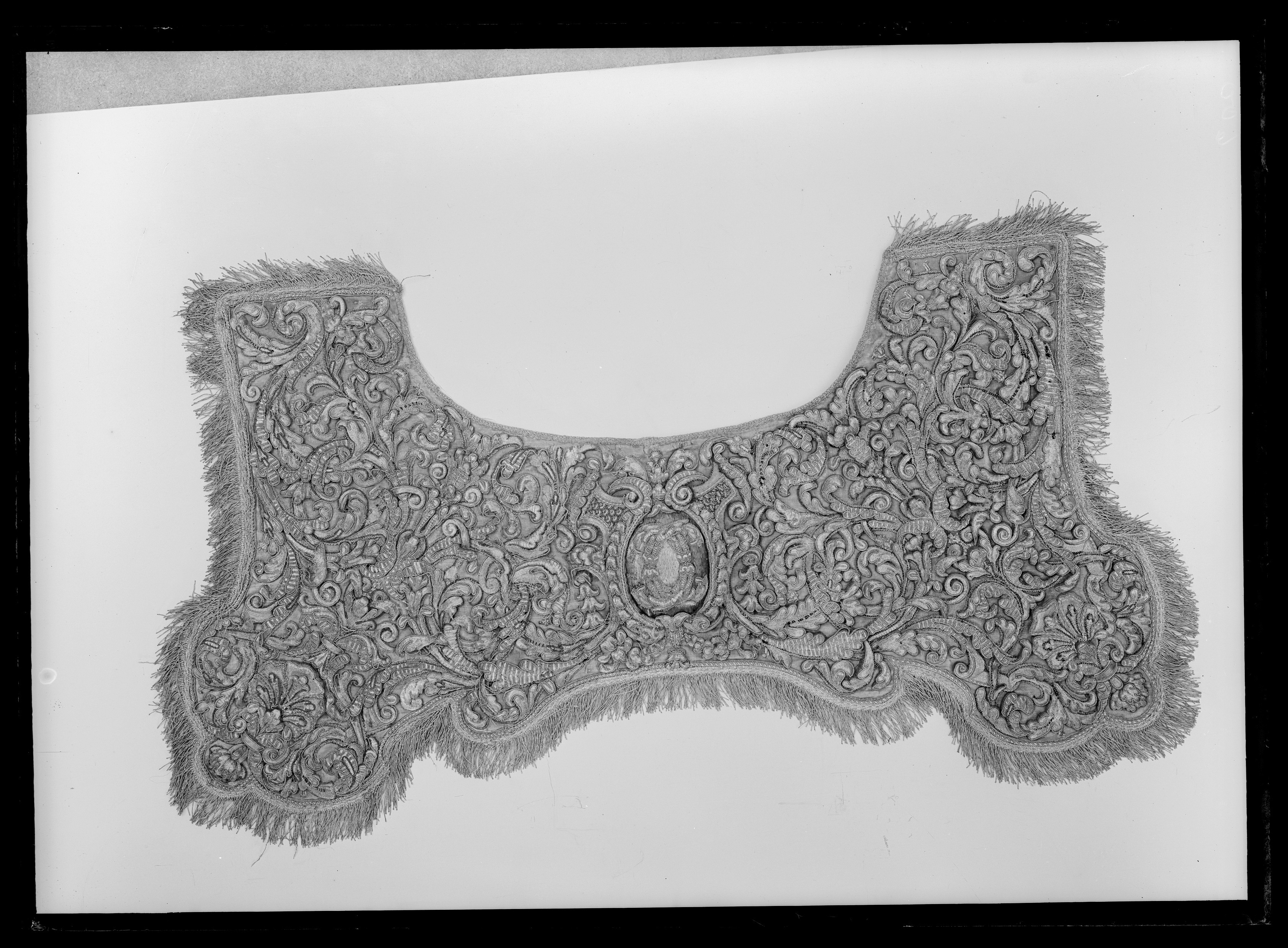 1 Sadel af citronfärgadt sammet; sadelkåpan, hölsterkåporne med eschabraquet broderade af upphöjdt silfver; på eschabraquet Konung Carl XI:s namn broderadt på guld med blomerant. Sadel, Eschabraque och Hölsterkåpor med silfverfransar.