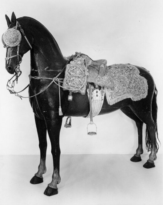 Sadelknappen med en Sleiff, utarbetad af rent Silfver, sammaledes finnes fram och bak på Sadelen inslagne 41 st Tänglikor af massivt Silfver med upphöfne hufvuden.