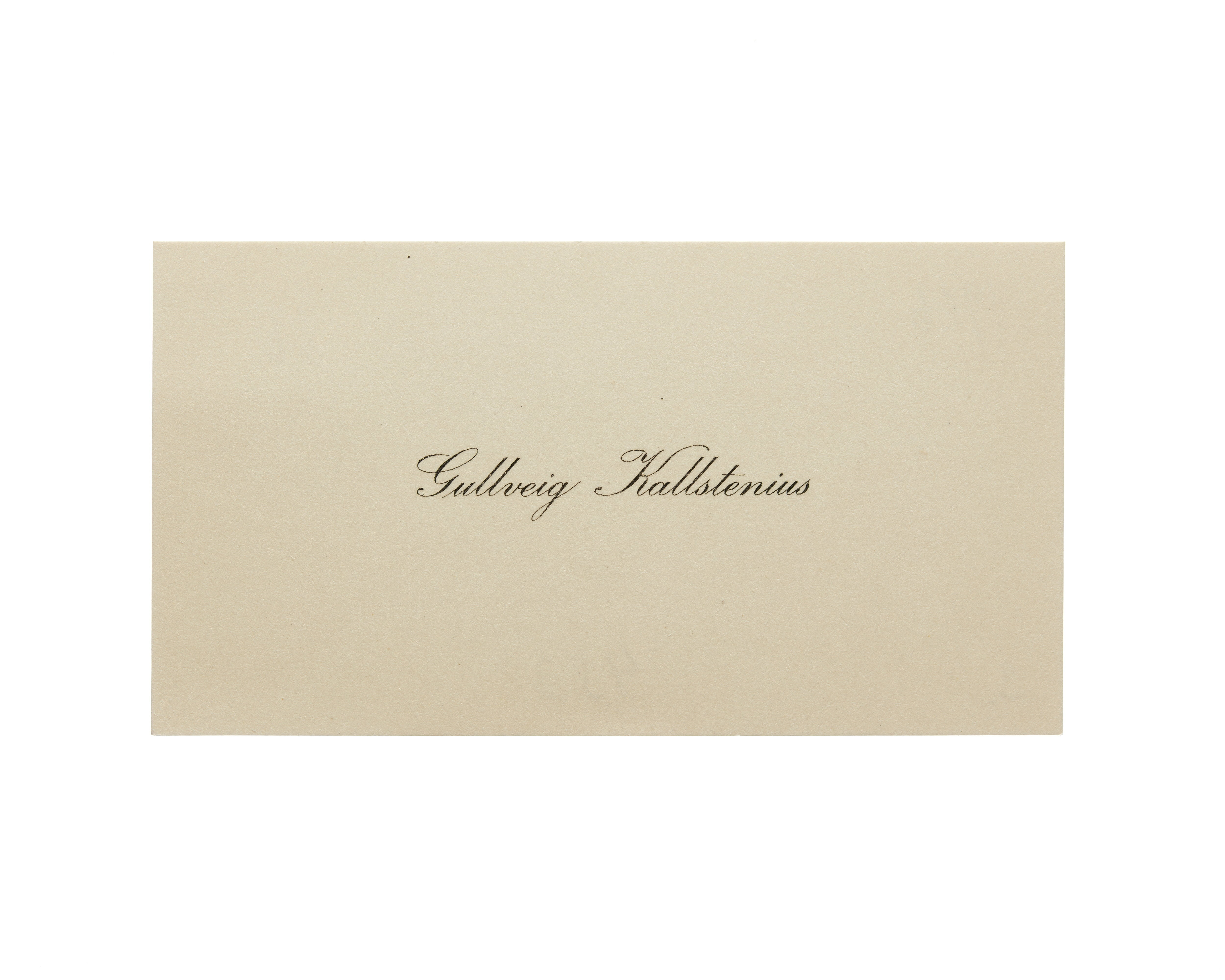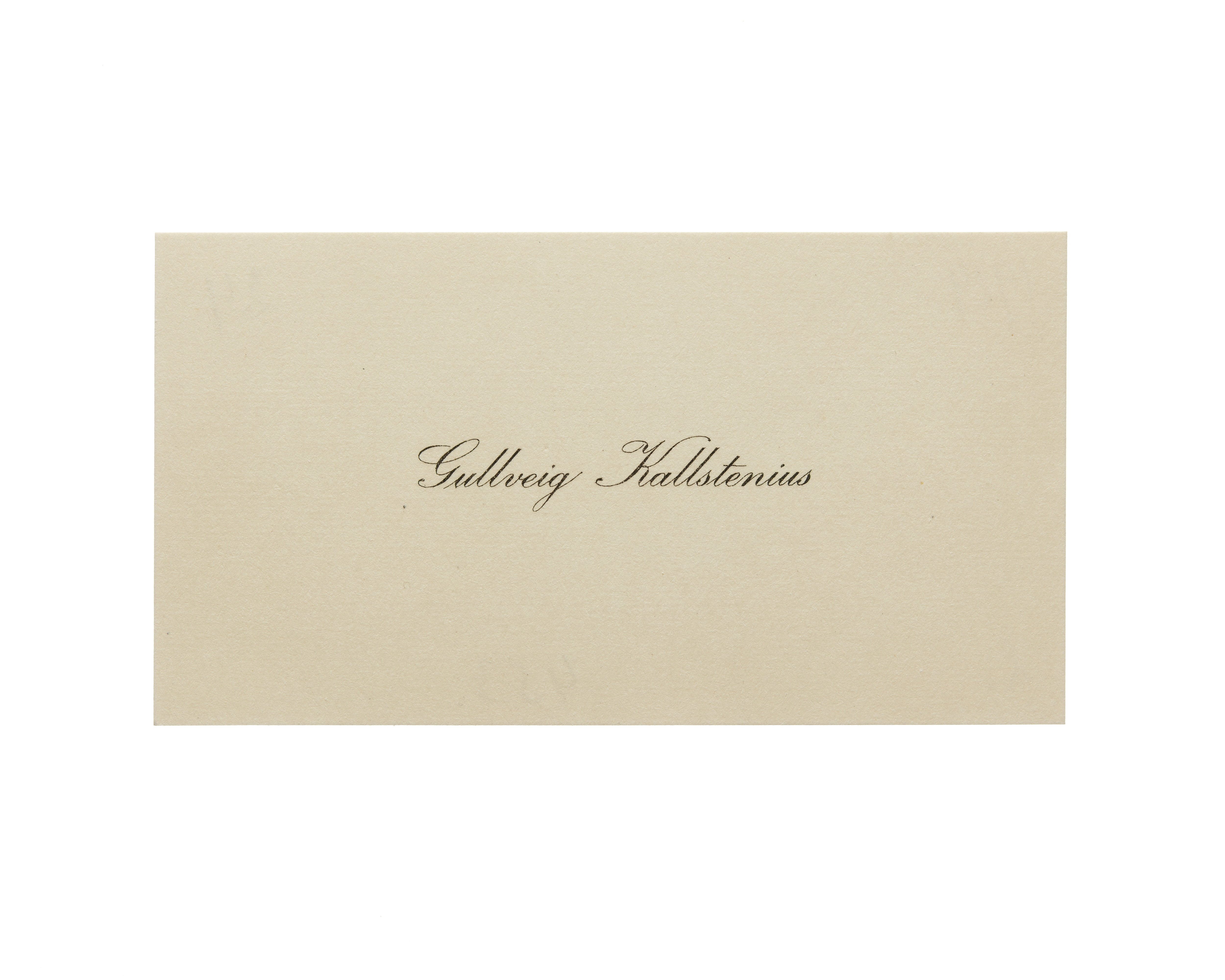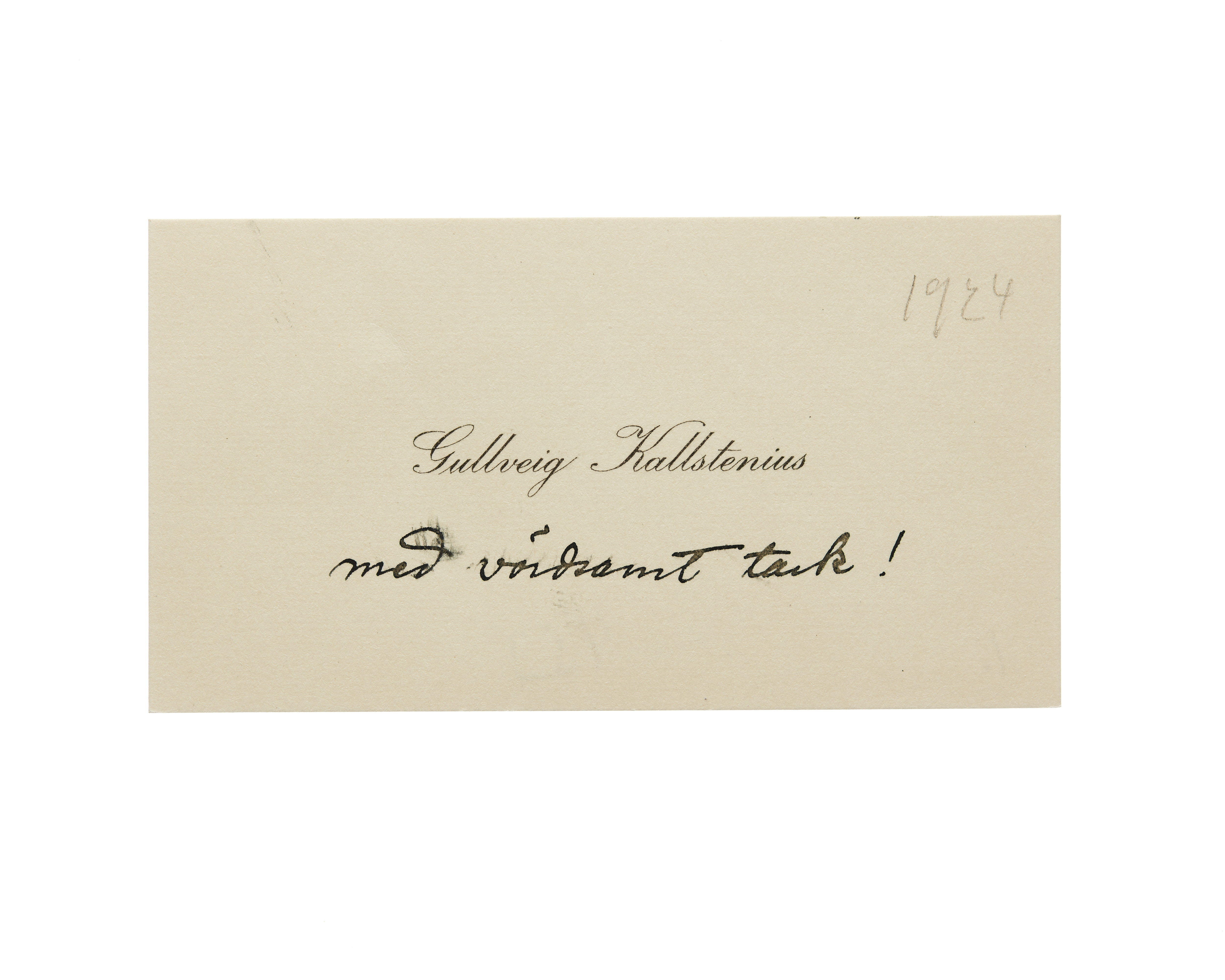 Tre visitkort från Gullveig Kallstenius. Första kortet daterat 1924 Handskrift "Med vördsamt tack". Andra kortet daterat 1924. Tredje kortet daterat 1926.