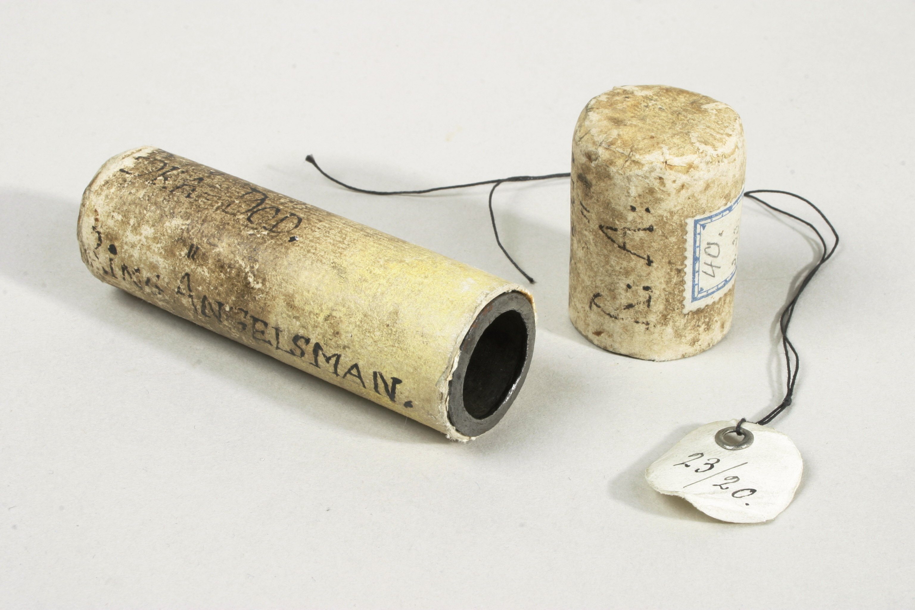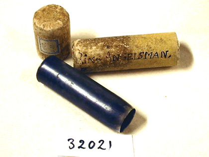 Cylinderformad huggpipa av stål, något avsmalnande nedtill. Pipans diameter 25 mm respektive 20 mm. Den nedre kanten är slipad med egg. Fodral med påträtt lock i papp i samma form som pipan. På fodralet påskrift i bläck: "BRÅ DÖD. RING ÄNGELSMAN" samt på locket: "BR: DÖDÖ. R: A: ". (Jmf inskription på pipan till bössa nr 16021: "-- Bråddöd är mitt namn -") Inuti fodralet, lindat kring huggpipan, avriven papperslapp, med bläckpåskrift, enligt rubriken troligen skriven 1819. På utsidan av pappret textat kring pipan "[Rin]g Ängelsman Brå Döden".