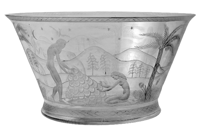 SKÅL. Rund, avsmalnande nedåt med svagt utsvängd brädd samt snett utåtfallande bottenparti med, i mitten, något insänkt botten. Dekor: Graverad. Kring utsidan en framställning av dansande kvinnor i ett landskap, genom palmer delad i tre scener. Kring bräddens utsida samt bottenpartiet en bård med rombiskt rutmönster mot mattslipad botten. I mitten av bottnens utsida en strålande sol. Höjd: 10,7 cm, diameter: 20,3 cm. Från 1925. Orrefors glasbruk i Hälleberga socken, Kronobergs län, tillhör Orrefors Bruks Aktiebolag, bildad 1897. Gåva till WILHELMINA VON HALLWYL, från hennes dotter IRMA INGEBORG MATHILDA och svärsonen WILHELM GUSTAF VON GEIJER