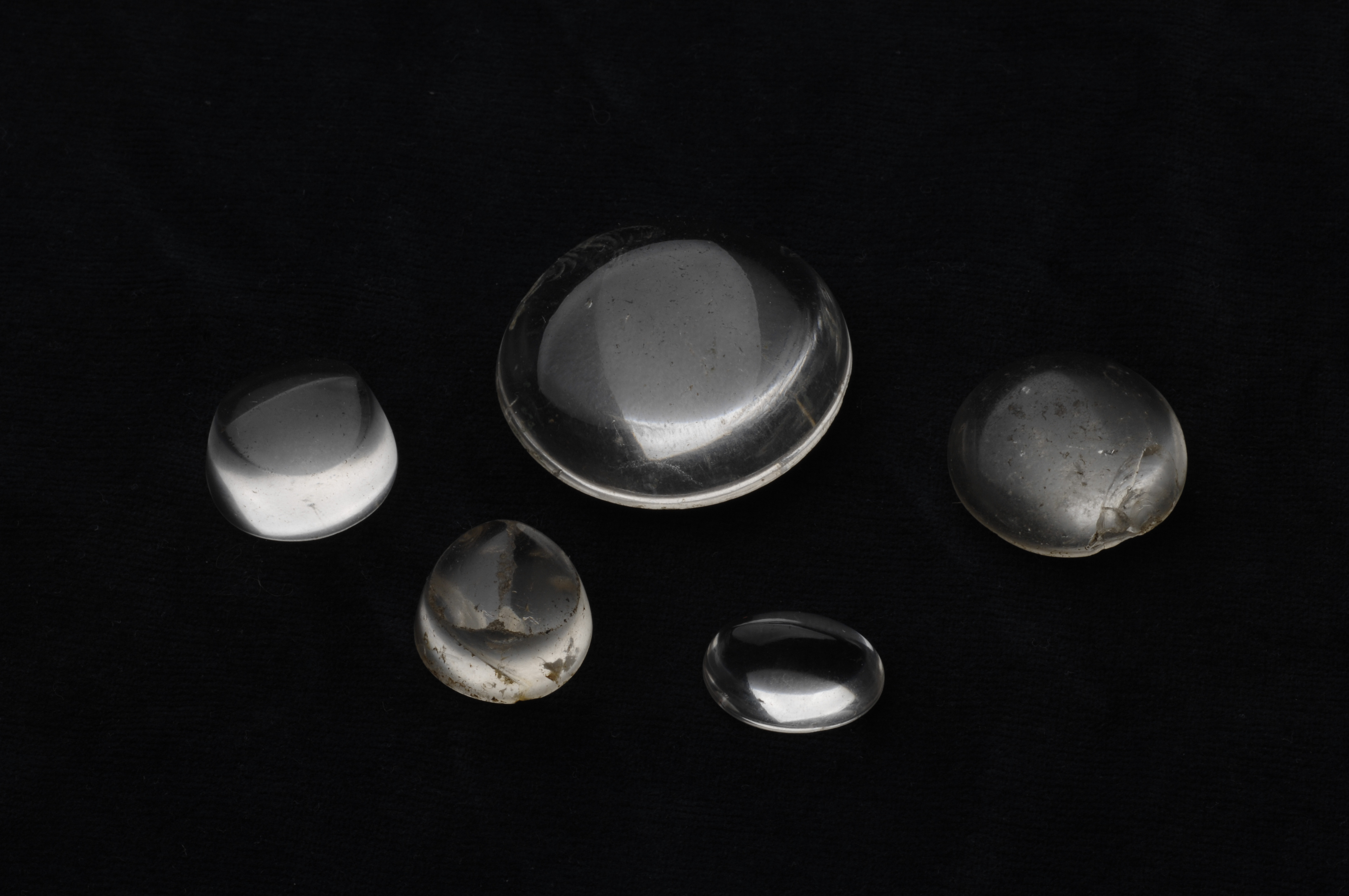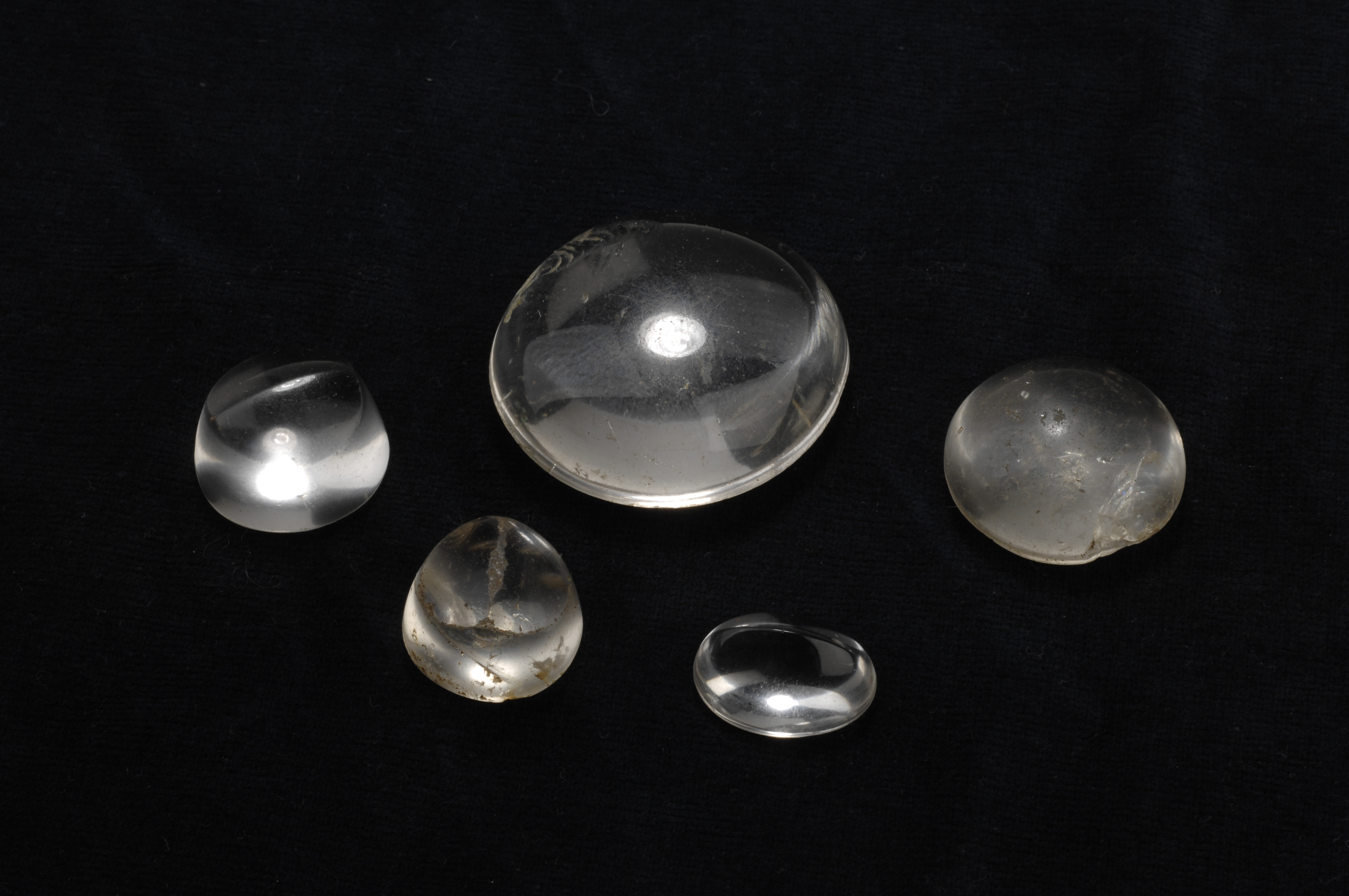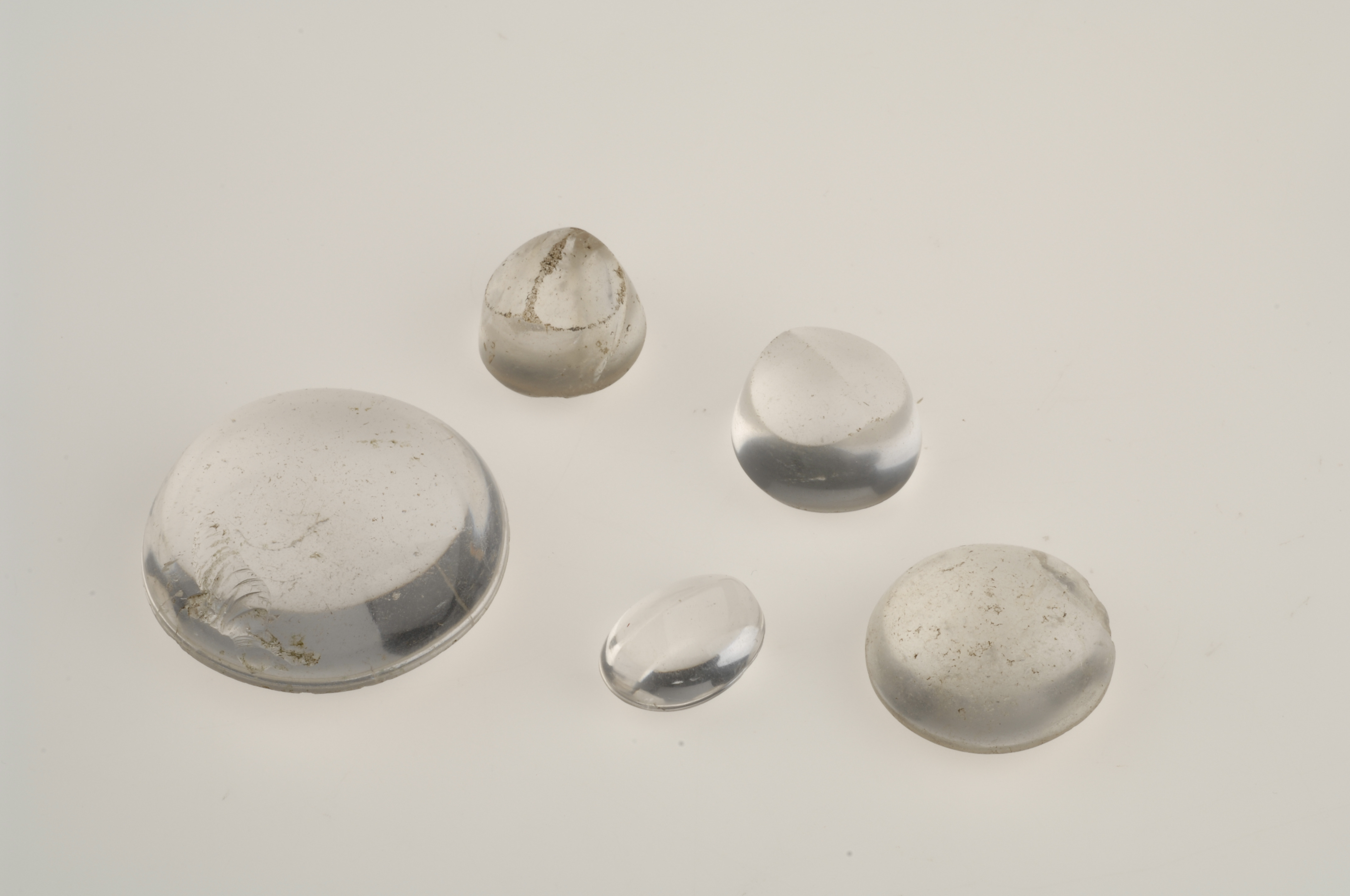 3 ämnen (påbörjade slipade linser, alt. infattningsstenar) samt 2 mer eller mindre färdigslipade linser. Den största 47 mm i diameter.