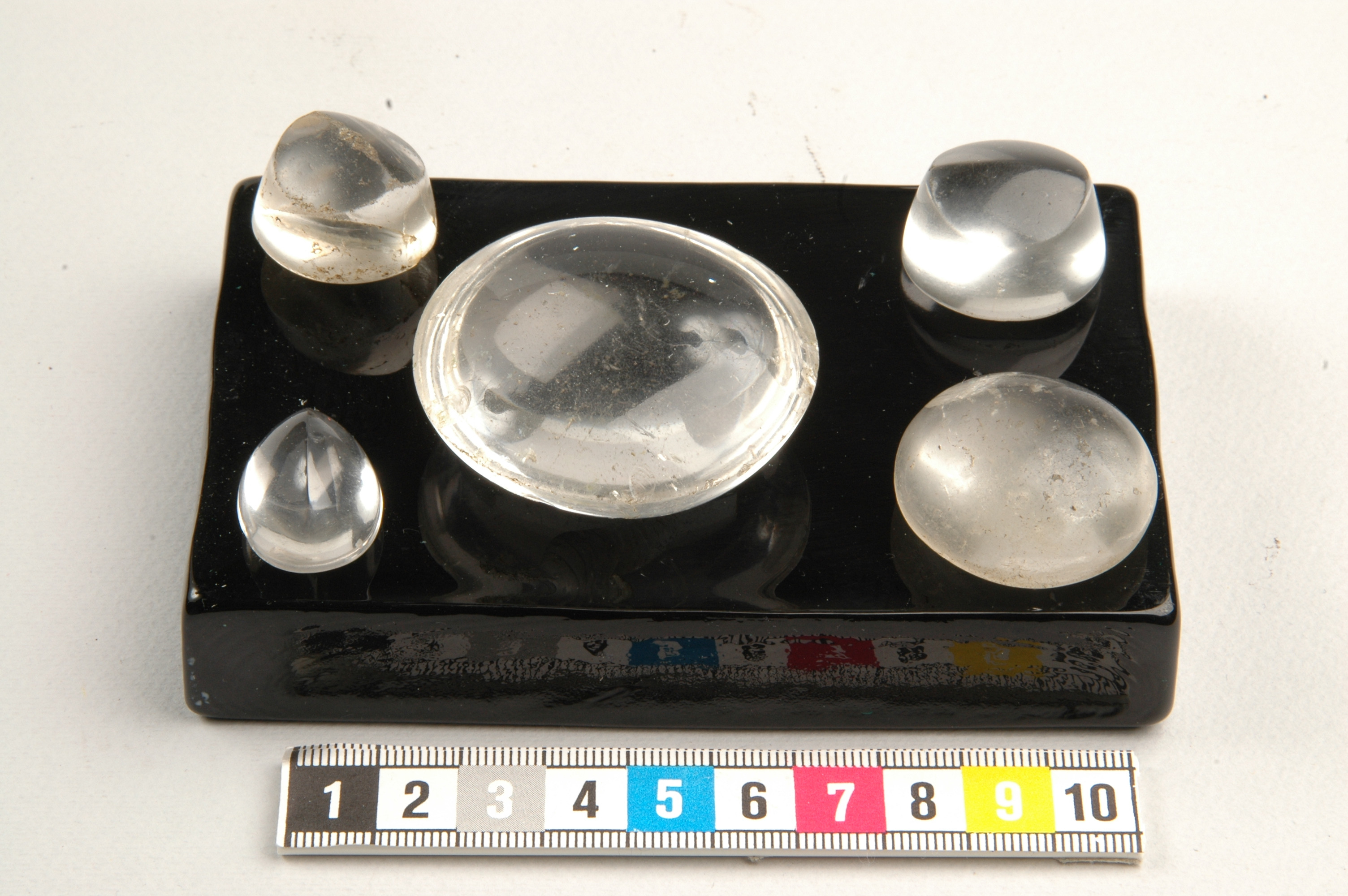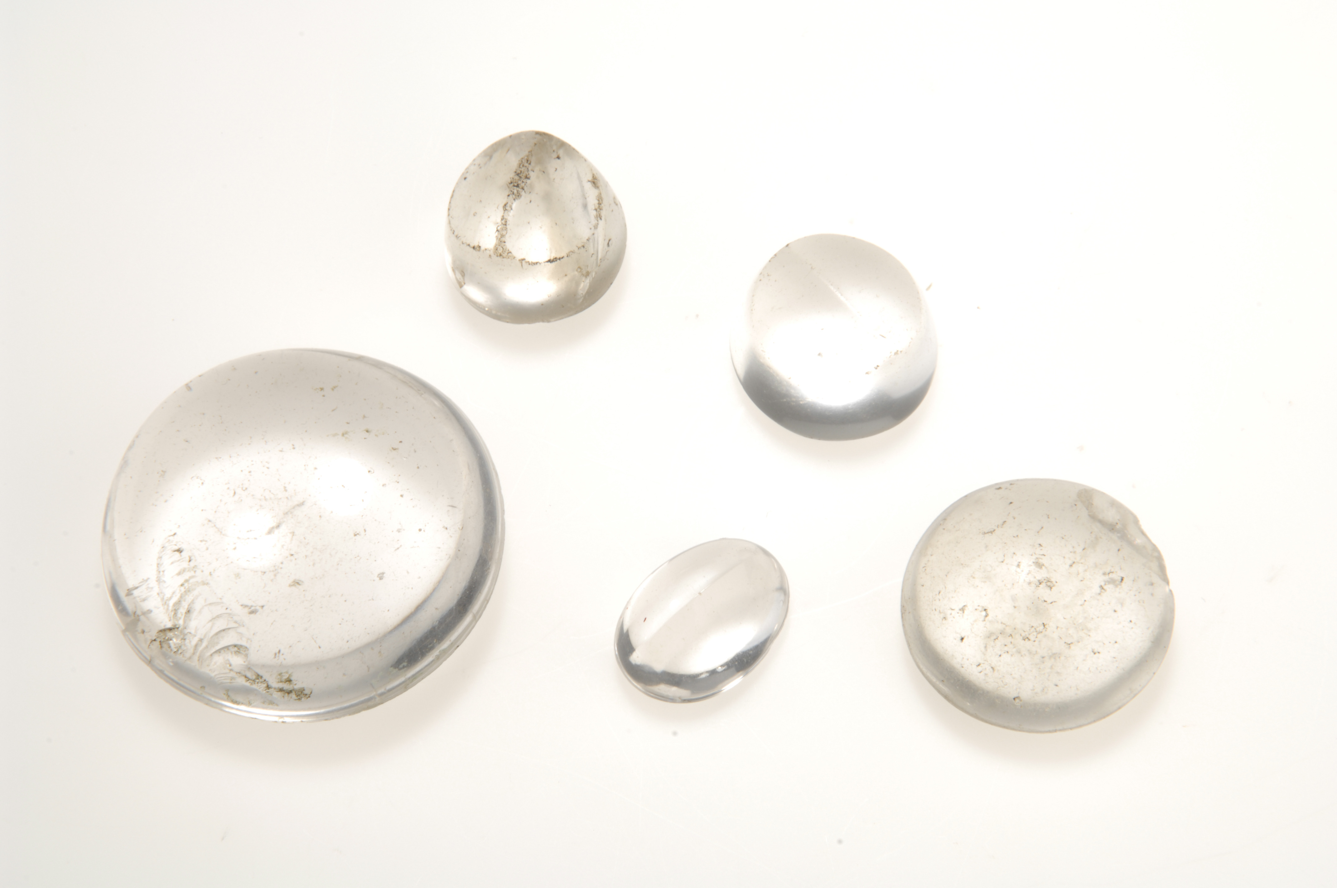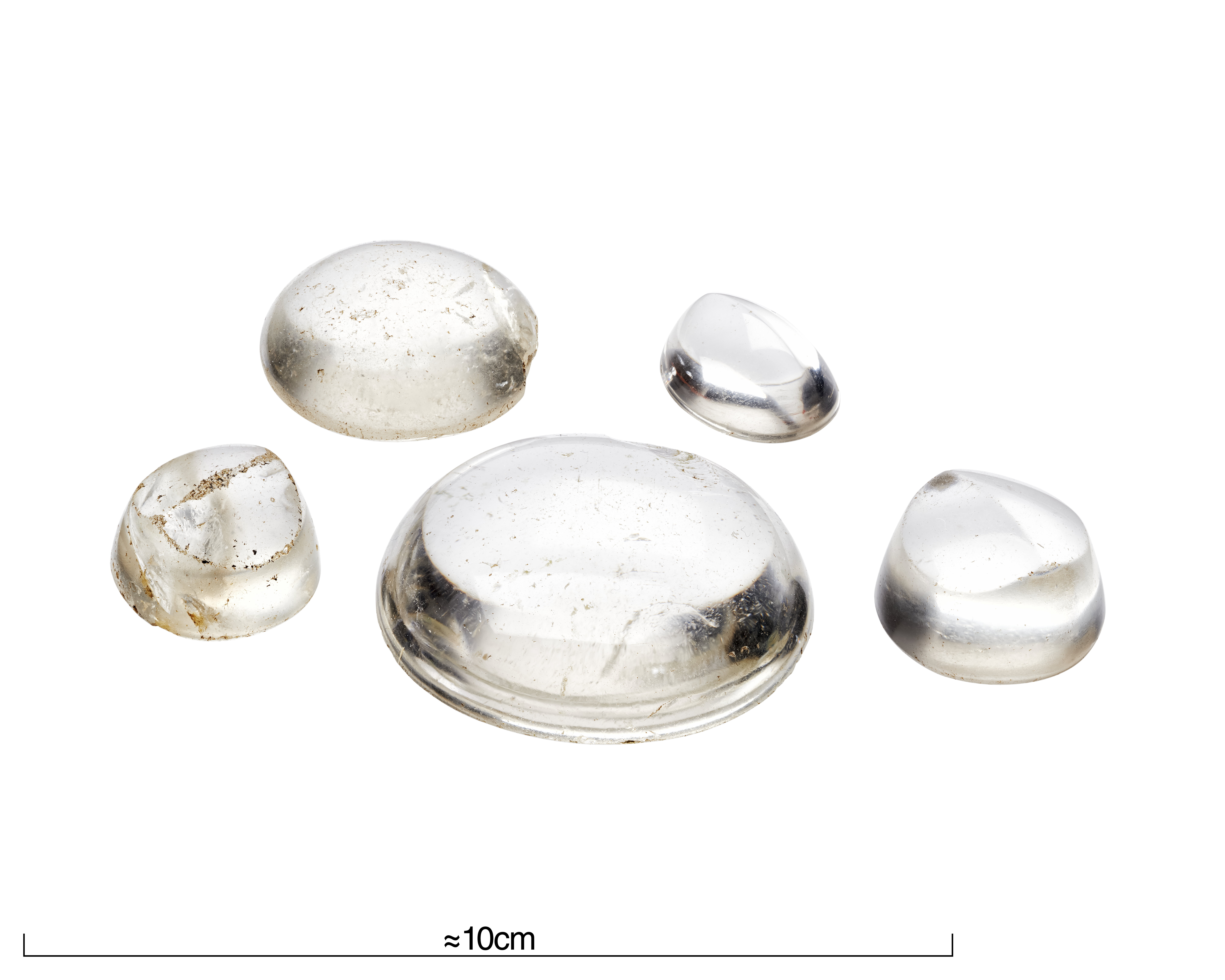 3 ämnen (påbörjade slipade linser, alt. infattningsstenar) samt 2 mer eller mindre färdigslipade linser. Den största 47 mm i diameter.