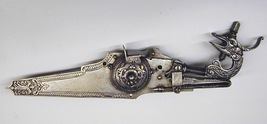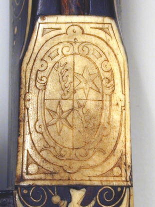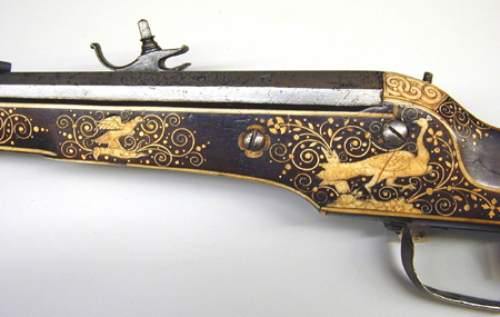 Hjullåsstudsare, pipa av Georg Müller, lås Caspar Spät?, stock Hieronimus Borstorffer, München ca 1625-1650.