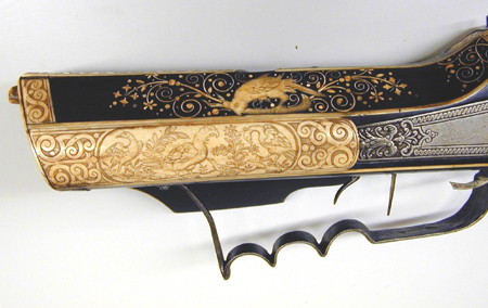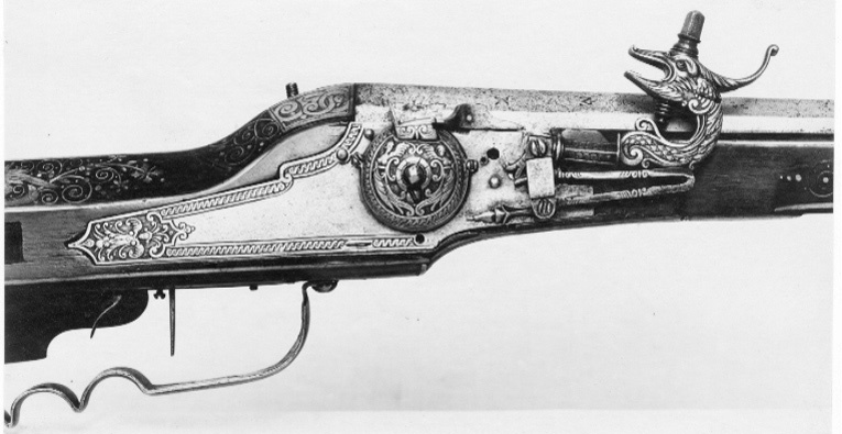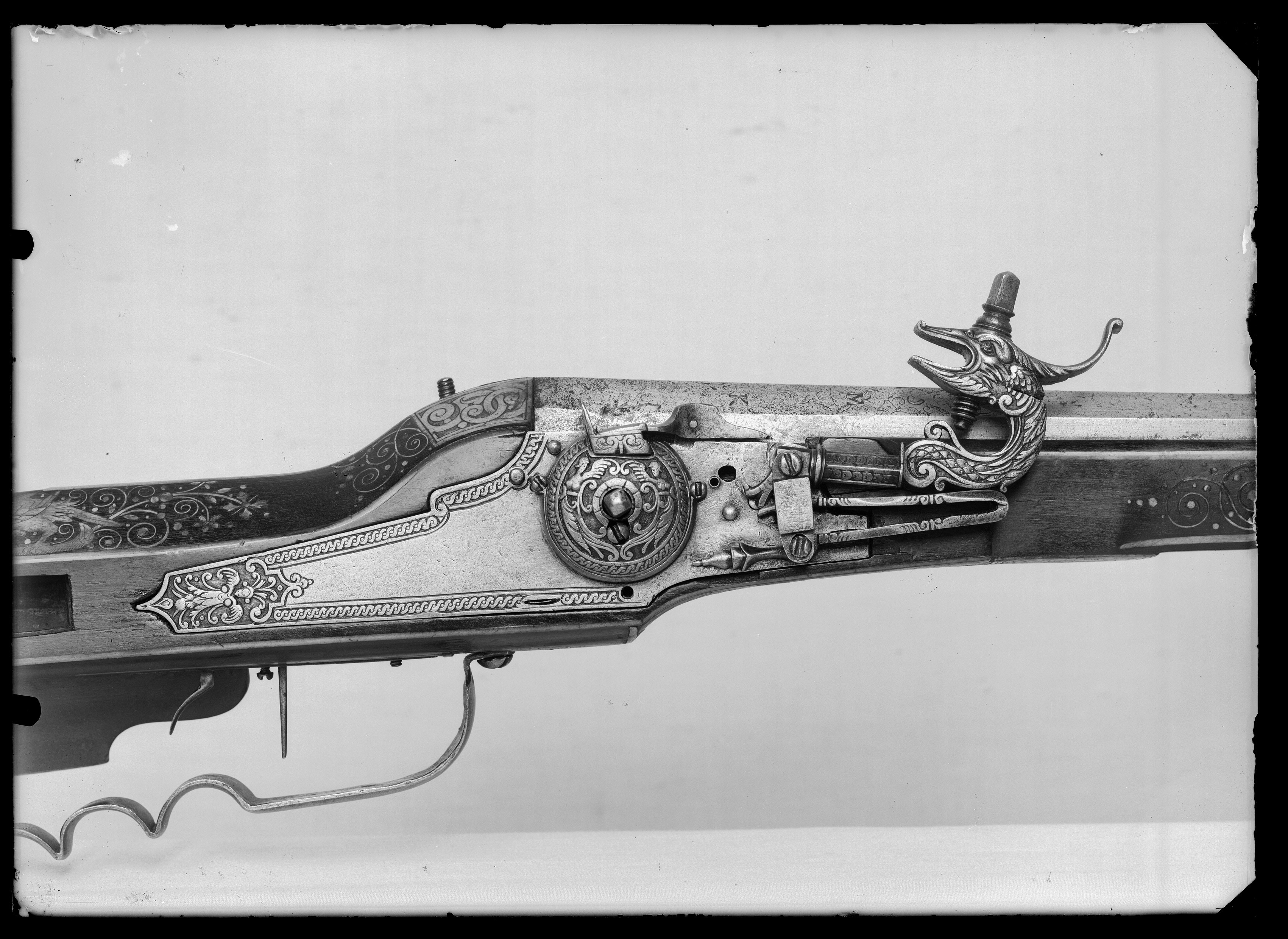 Åttsidig, räfflad pipa, 8 räfflor, 210 mm från mynningen förskjuts sidorna så att pipans främre del har svinrygg, ytorna går framåt-bakåt i spetsar. På kammarens ovansida 40 mm från pipbasen en oval stämpel med en trumpet (LRK vägl. 1921: 258), 60 mm därframför en sköldformig stämpel med en rundel (1921:304). Runt denna stämpel på de tre övre faserna ett fint graverat lövverk, på mittaxeln framför stämpeln snett inslaget N, på sidofaserna något bakom stämpeln stämplade bokstäver: G M, mellan dekorfältet och trumpetstämpeln på sidofaserna stämplat: A K. Mittpå pipan ett liknande dekorfält med en mittoval med en graverad örn (delvis bortsliten), vid mynningen ytterligare ett dekorfält. Kort, nedåböjt, baktill tvärt avskuret svansskruvblad. Riktmedel: Siktskåra på svansskruvblad-pipbas, klaffsikte med en klaff (ena vingen avbruten), stolpkorn av mässing. Fästning: Tre häften. Pipan fäst med krysskruv (främre varbygelskruven), två pipstift av ben samt däremellan främre rembygelns skruv. Hjullås med plant låsbleck baktill utdraget i en spets. Fint utförd dekor i stålsnitt, kantbård med löpande hund, i varje bukt en punkt. Vid bakänden rankdekor, övergående i en bevingad kvinnofigur. Utvändigt hjul täckt med välvd hjulkapsel med liknande dekor, två kvinnofigurer, fästskruvar 3 o 9. Fängpanna med svagt svängd gavel, bladdekor, låg, rak krutskärm. Fängpannelock med rörlig arm (ursprungligt ?, slätt, ingen dekor), tryckknappen saknas. Hane med rak, kropp med triangulärt tvärsnitt, dekor av delvis överlappande plattor. Hals-huvud i form av en drake i stålsnitt, lös överkäke, uppsvängt fingergrepp avslutad med vulst. Käkskruv med nedtill balusterformigt, upptill fyrsidigt huvud. Hanfjäder med delvis fasade kanter, bladdekor, profilerat fjäderlöv. Ej ursprunglig hanstudel i form av slät, oval platta, försänkt för skruvarna. Fästning: Två låsskruvar. Avtryckare med snälltryck på rektangulärt avtryckarbleck, fäst med två spikar. Helstock av ebenholts (?), signerad på platta bakom svansskruven H B (ligatur, Hieronimus Borstorffer). Rak kolv av tysk typ med vinge med volut och kolvlåda. Beslag, kantlister och inläggningar av högklassigt graverat ben. Bakplåt med endast dubbel kantlinje, stödkula av ben. Kolvlådelock täckt av benplatta med fint graverad dekor med ovalt fält, fyra fåglar. Ovanför kolvlådan rankverk och papegoja som biter om pinne. Plan kolvrygge med nedskuret tumläge, därbakom en benplatta med blom- och banddekor. På vingen och längs bakkanten ytterligare benplattor, på anslaget rankverk och örn sittande på gren (jfr örnen på pipan). Vid låsskruvarna rankverk och påfågel. På kolvens undersida rankverk på två ställen med plattor för krysskruv-varbygelskruv, benplatta vid kolvänden, ram runt avtryckarblecket, på övergången till framstocken i rankverk en fågel med utbredda vingar, sittande på pinne. Spetsrörka i form av benplatta med graverad oval vapensköld på kartusch, kvadrerad sköld, fält 1 o 4 hjorthorn, fält 2 o 3 sexuddig, fasetterad stjärna (Seehofer). På framstocken blomformiga pipstiftbrickor omgivna av rankverk och däremellan papegojliknande fåglar, likaså i rankverk, tre på v sida, två på h. Näsband-stödplatta för laddstocken med dekor i form av en dubbel oval på vardera sidan vid mynningen och därbakom graverade kulbårder ner till laddstocksnoten. Varbygel av stål med tre fingerlägen. Tillbehör: Laddstock av trä (ursprunglig?), l: 960 mm, upptill benskoning, l: 40 mm med två hornringar. Nertill stålrör (i ytteränden instucket pinne).