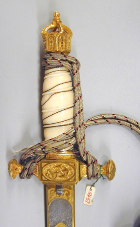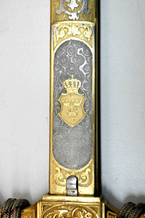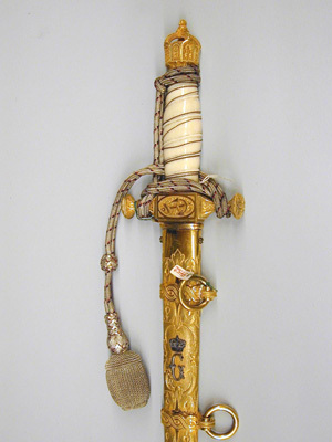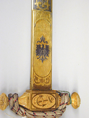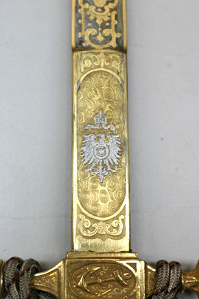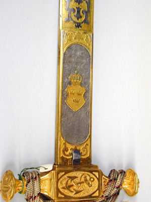Fäste av förgylld mässing med knapp i form av tyska kejsarkronan med något uppåt-utåtriktade sidor. Raka, profilerade paerstånger med vidgade, runda, plana ytterändar, yttäckande ornering av gjutna och punsade, stiliserade blommor och blad. Stort kryss med på båda sidor en oval med liggande ankare. Kavel av elfenben med snidade spiralgående räfflor, lindad med dubbel, tvinnad silvertråd. Klinga rak, tvåeggad med 78 mm lång ricasso och etsad rosendamaskering. Ricasson helt förgylld, på utsidan en i förgyllningen utsparad oval med en förgylld, krönt trekronorssköld, därefter i stålet utsparade rankor, blad och c-formiga blågar mot förgylld botten, denna med treuddig avslutning 112 mm från udden, därefter två 63 mm långa hålkälar. Klingans insida med på ricasson utsparat ornament i form av tyska kejsarörnen, därefter samma dekor som den på utsidan (ornamenten här förgyllda mot stålbotten). På insidan under krysset ett fjädrande låshak för baljan.