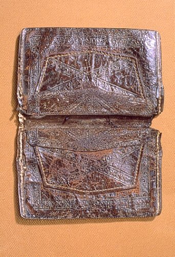 Plånbok av mörkbrunt läder, eventuellt ödleskinn, med pressad dekor. Lagad med tråd på flera ställen.