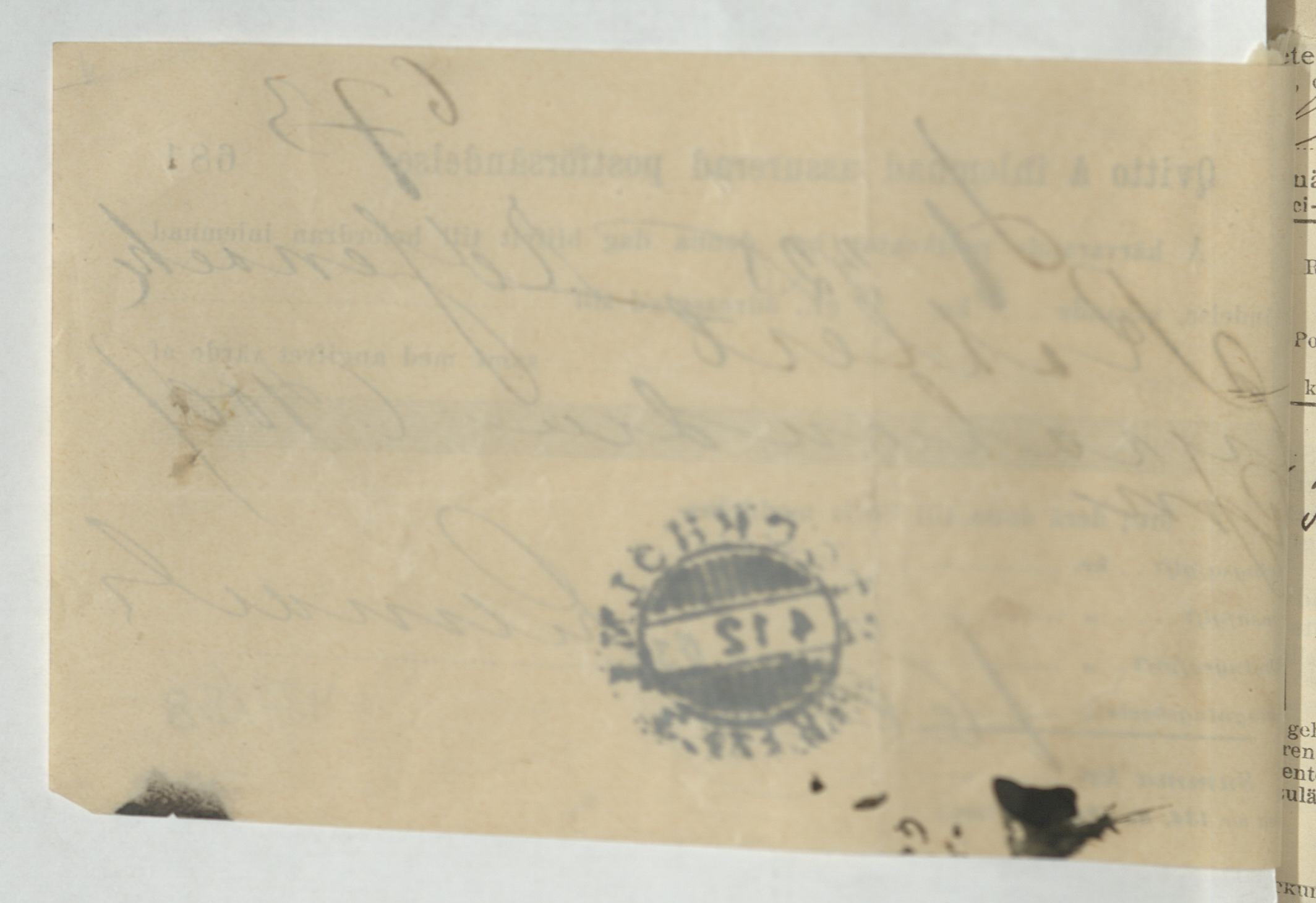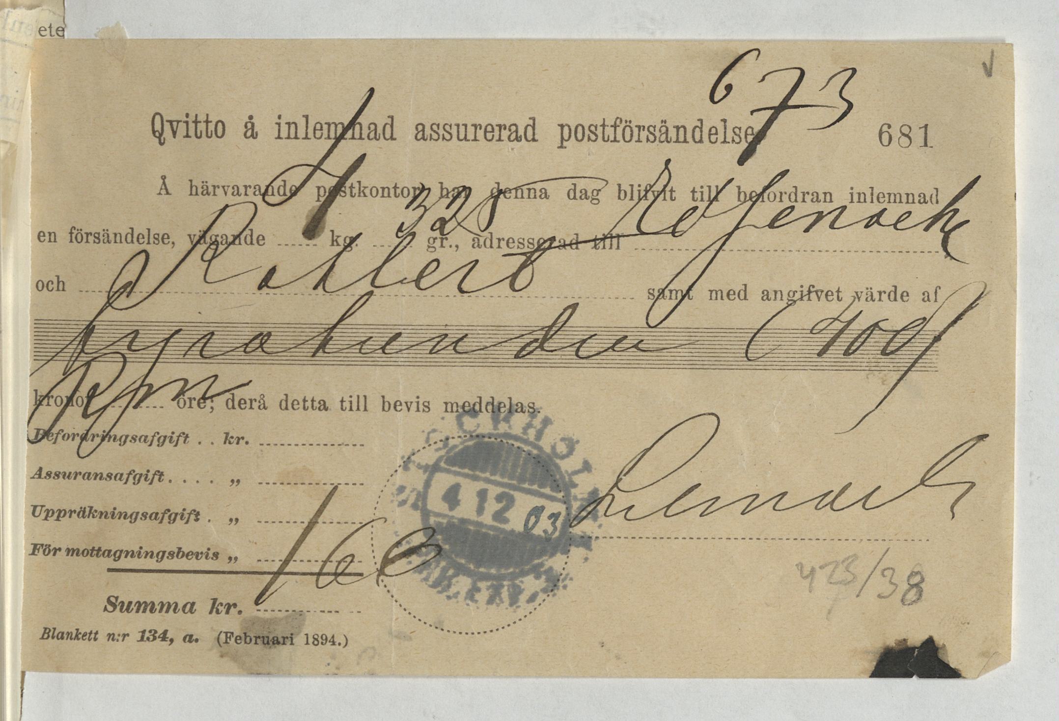 Kvitto på inlämnad assurerad postförsändelse gällande Eduard Kahlert. Stockholm, 1903.