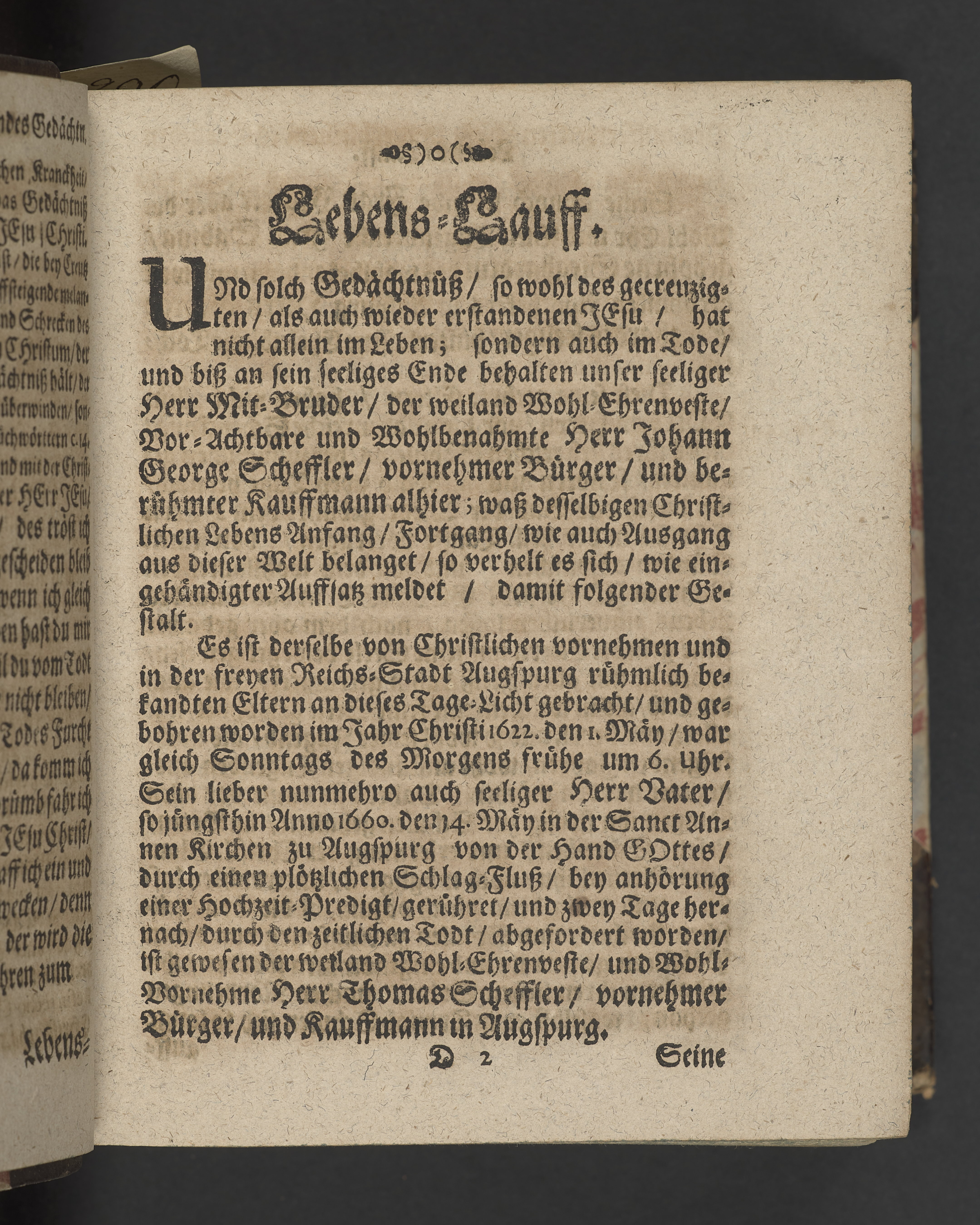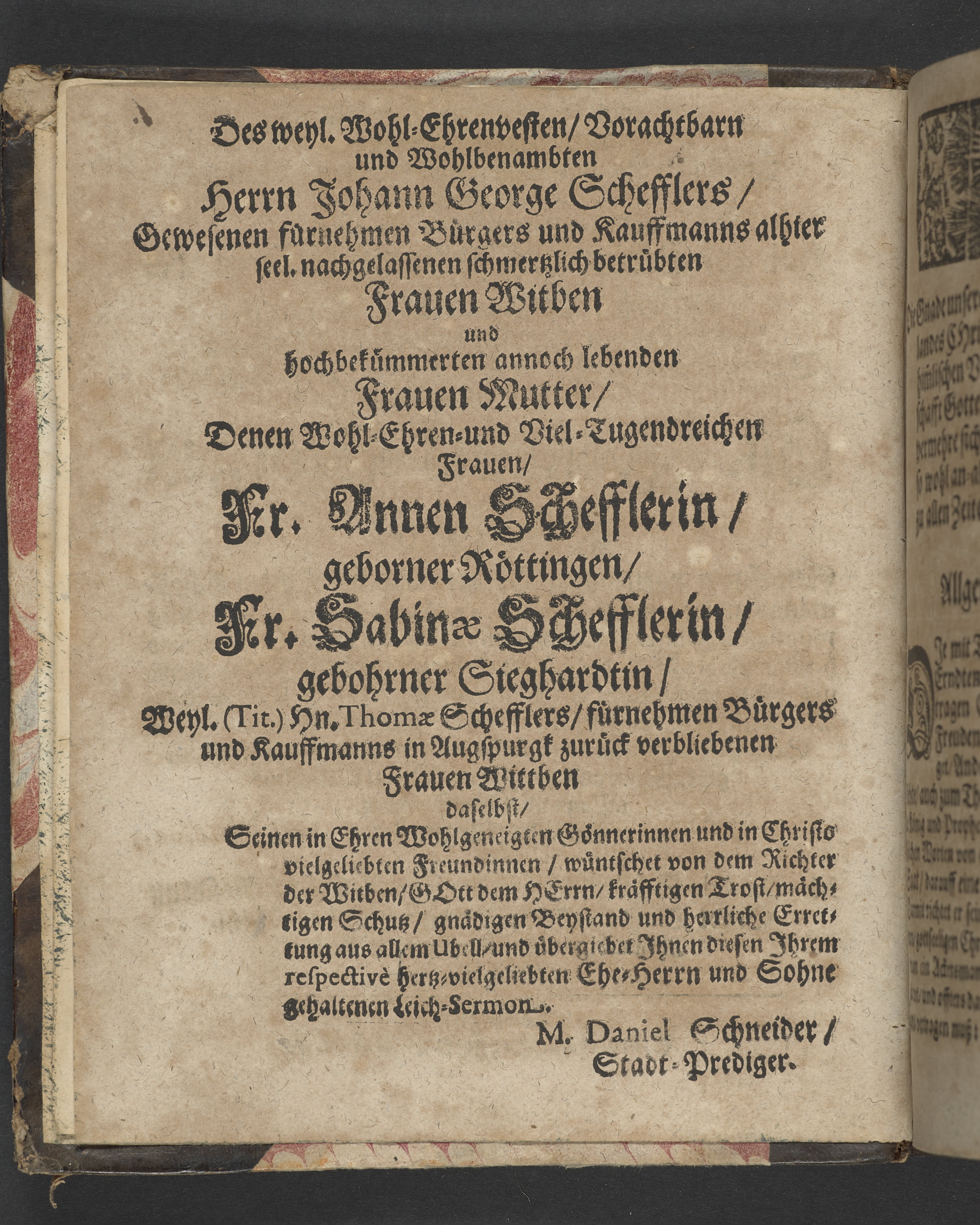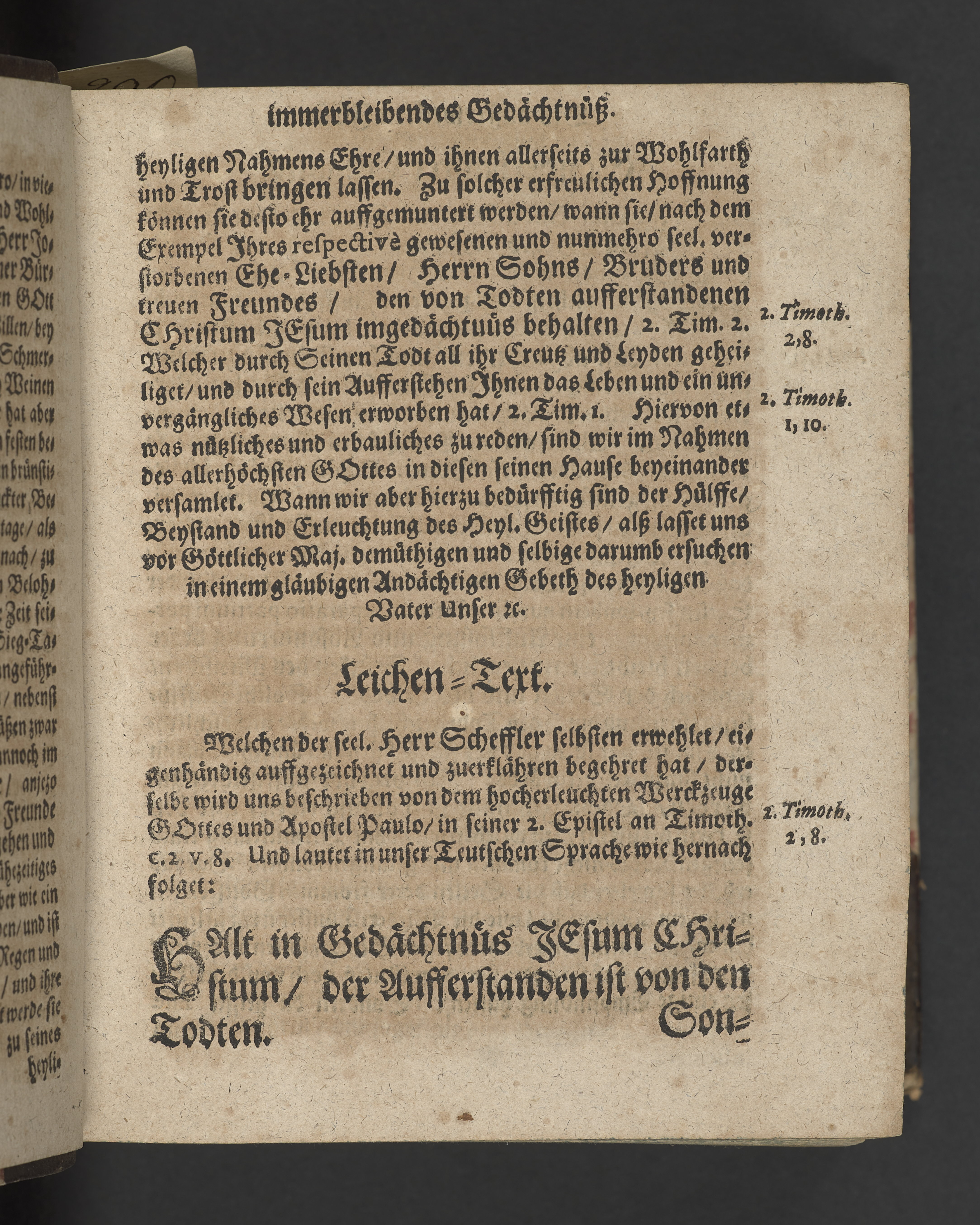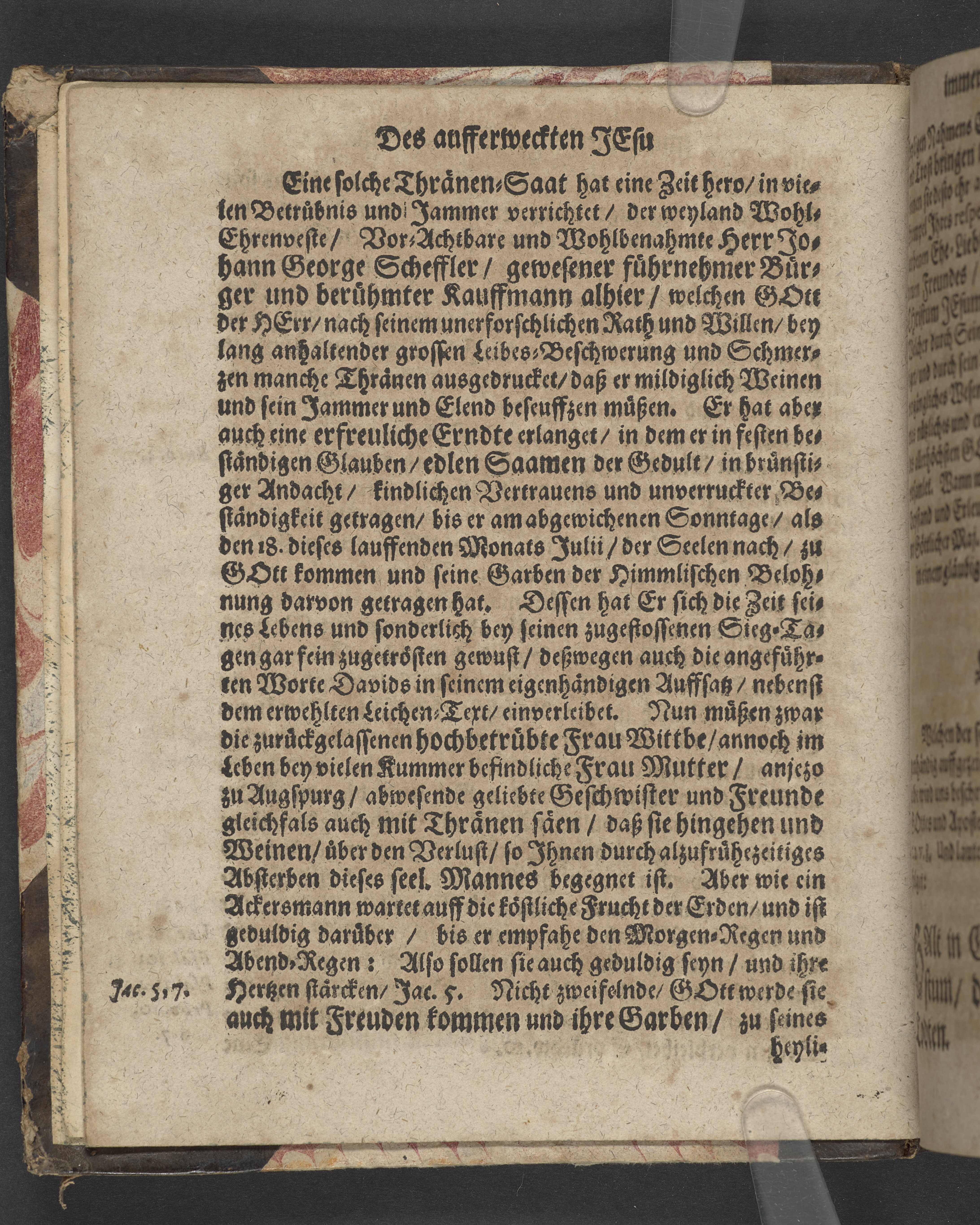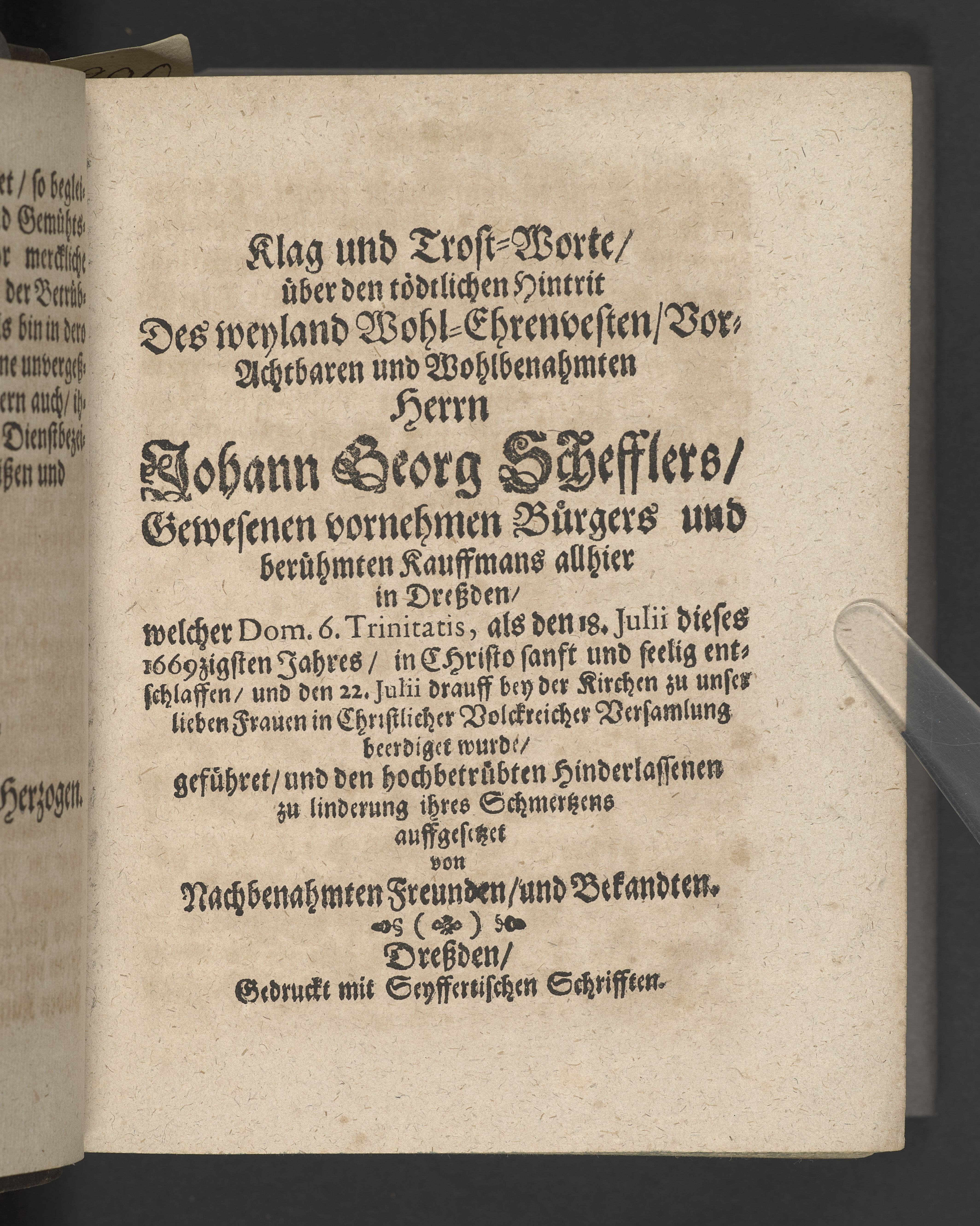 Des aufferweckten Jesu immerbleibendes Gedächtnüß, Wie es 1. ein Nothwendiges, 2. Herrliches, und 3. Nützliches Gedächtnüß, Auß denen Worten Pauli 2. Tim. 2. v. 8. ... Bey beschehener Christlicher Leichen-Bestattung Des ... Hn. Johannis Georgen Schefflers, Gewesenen vornehmen Bürgers und berühmten Kauffmanns alhier, welcher ... den 18. Julii dieses 1669zigsten Jahres ... wie ein Liecht verloschen ...