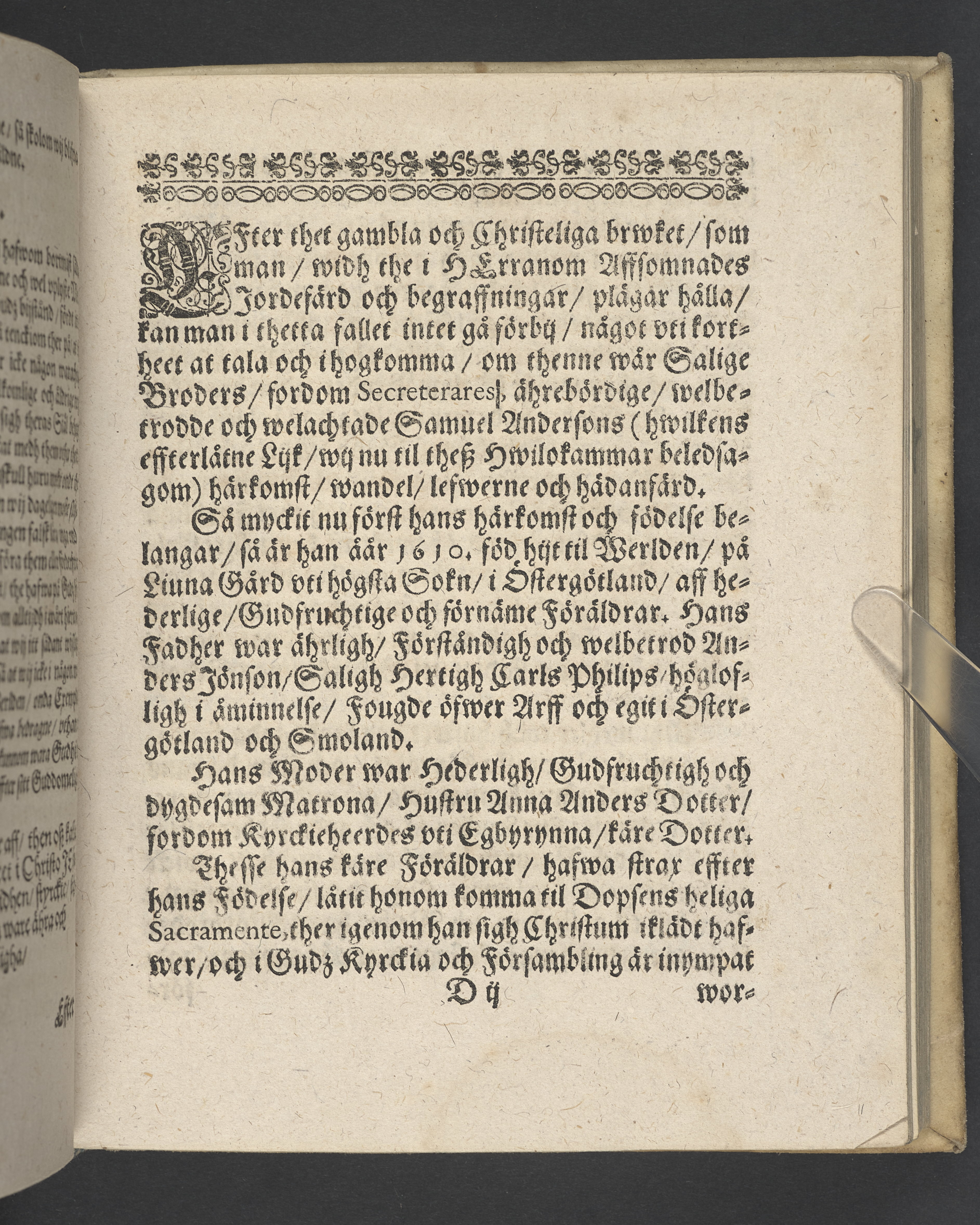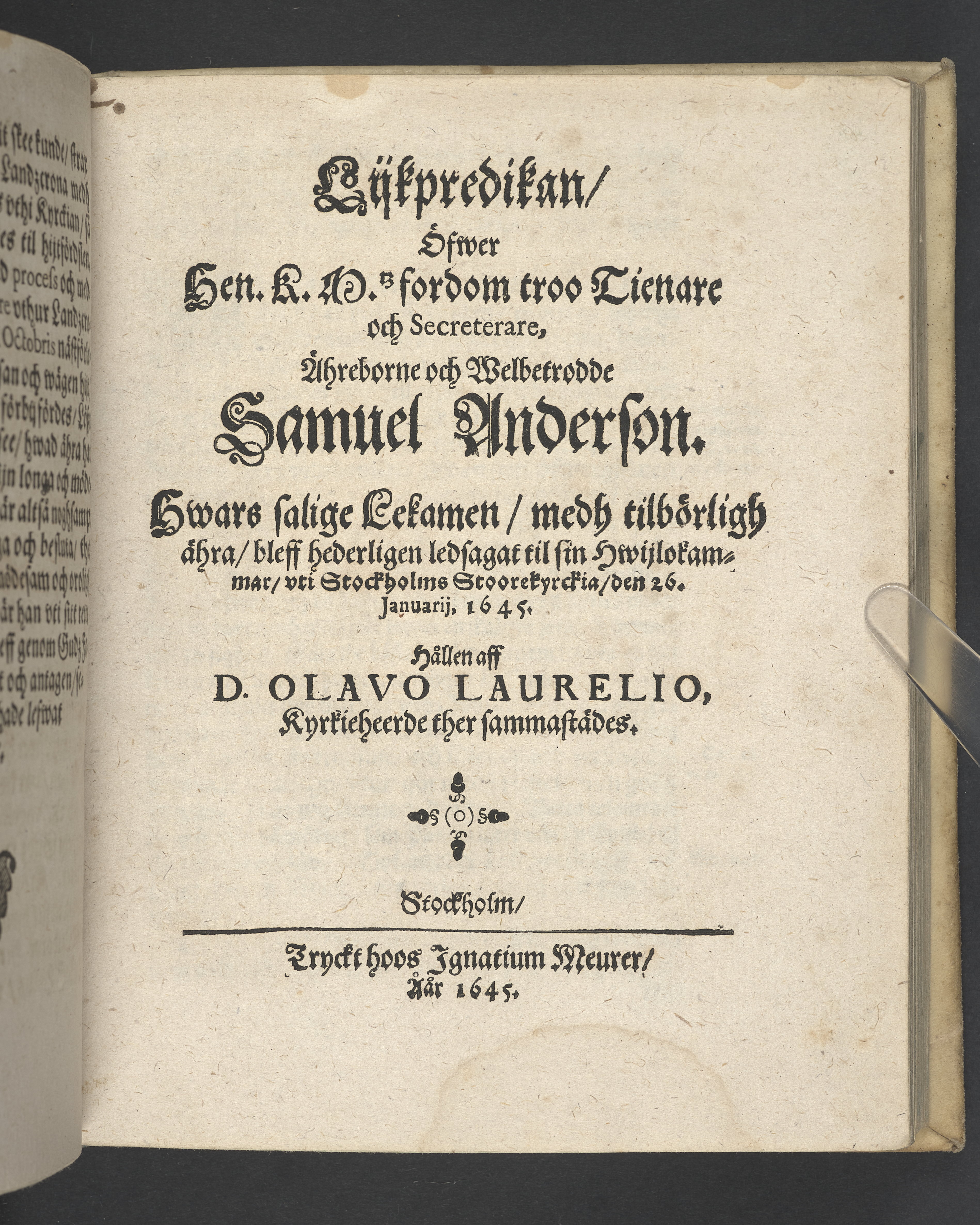 Lijkredikan, öfwer... Secreterare... Samuel Anderson... uti Stockholms stoorekyrckia, den 26. januarii. 1645... Stockholm, tryckt hoos Ignatium Meurer, åår 1645.
