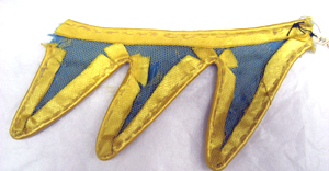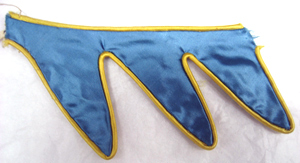 Fragmentariskt sporrläder av mellanblå sidenatlas försett med tre snedskurna flikar. Flikarna kantas av gult sidenband.