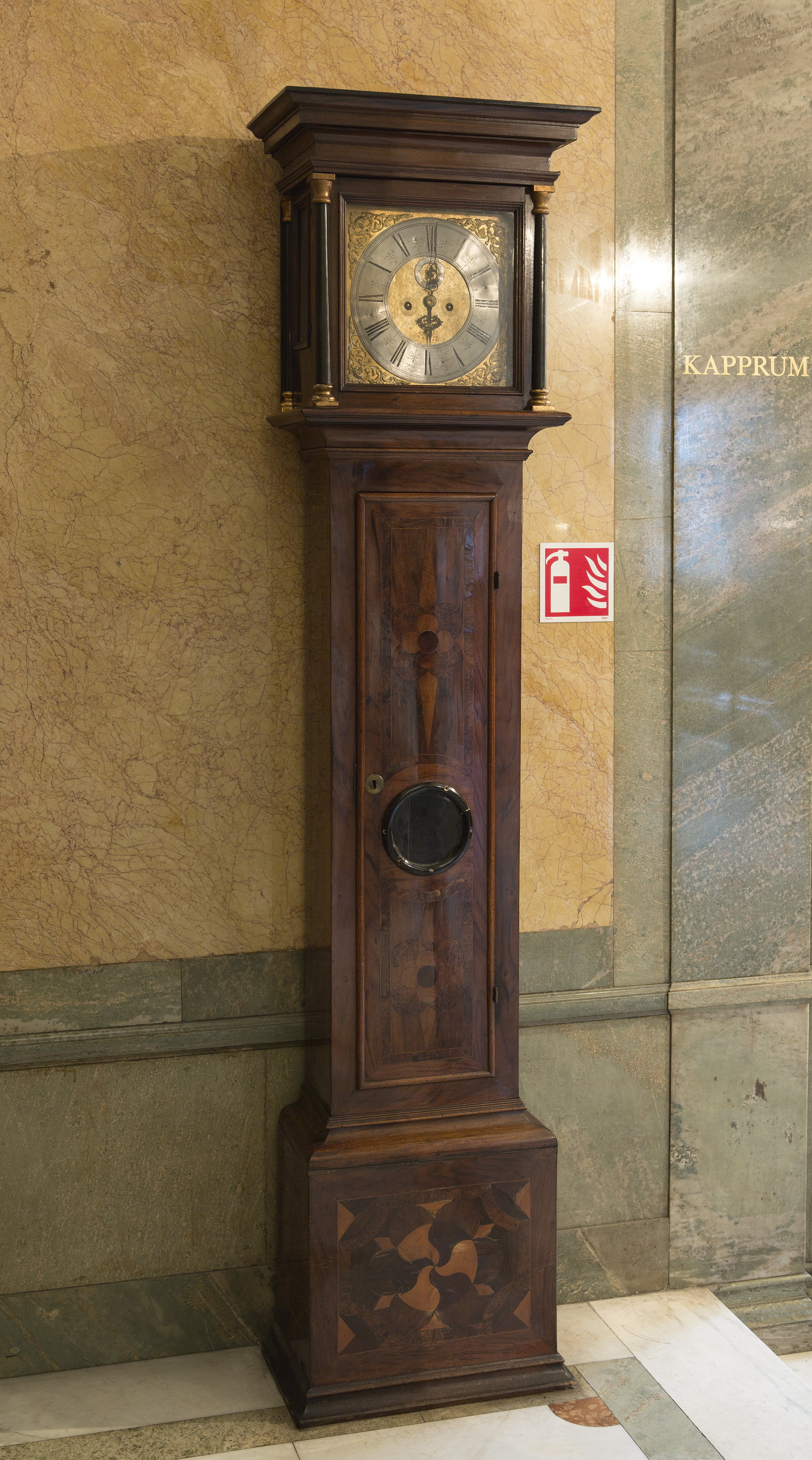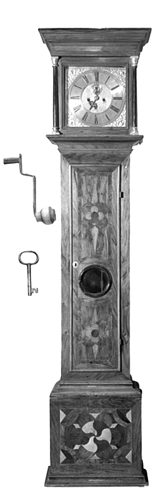 - Foder i valnötsträ med flere träslag, urtafla af förgylld järnplåt samt verk af järn och annan metall, med pendelgång och slagverk. Foder högt, fyrsidigt, mellersta delen starkt indragen. Faneradt på blindträ af furu, med inläggningar i ljust och mörkt samt poleradt. Nedre delen låg, starkt utskjutande från mellersta delens lif. Å framsidan i midten en sexflikig rund rosett med svängda spetsiga flikar med böjda, mot midten vända spetsar, hvarannan flik i buxbom, hvarannan i jakaranda; utanför rosetten vid hvarje flik ett halfrundt fält i valnötsträ, mellan dessa i svicklarna upptill och nedtill en tresidig flik, i de öfriga svicklarna en rombisk ruta; det hela inom en ramliknande bård i almrot, med insvängda hörn, utanför hvarje af dessa ett tredeladt triangulärt falt med en af delarna i jakaranda, en i valnötsträ och en i buxbom; kring ytterkanterna en bred fris, längs hvars inkant en smal åder i ljust. Sidosidorna med stående rektangulärt midtfält, omgifvet af en ramliknande bård i jakaranda mellan två smala ådror i ljust, kring kanterna en fris som å framsidan. Nederst en utstående hålkälslist; upptill en utåtfallande karnisformig list. Mellersta delen å framsidan med en dörr på gångjärn vid högra sidan; i dörren något nedanför midten ett rundt hål med glas, på utsidan omgifvet af en stafformig ram; ofvanför och nedanför glaset en fyrflikig rosett med rundade flikar i alm och rundt midtfält i jakaranda, rosetten omgifven af fyra stora halfrunda flikar i almrot, mellan två af dessa utgående uppåt och nedåt i midten en kilformig spets i alm, de i öfre rosetten längre, hvardera rosetten inom en ramliknande bård i almrot mellan två smala ådror i ljust, kring kanterna å hela dörren en bred fris samt utanför denna å ytterkanterna en pålagd stafformig täcklist, äfven bildande anslag för dörren; inom listen vid framkanten en rund slät nyckelskylt af mässing; å dörrens insida vid framkanten ett infälldt lås af järn, med snedkolf. Sidosidorna hvardera med ett längdgående midt-falt med en öfver hörn ställd midtruta i jakaranda, omgifven af en smal åder i ljust; kring fältet en ramliknande bård i jakaranda mellan två smala ådror i ljust; kring kanterna Huf lös, påskjutes från framsidan; hufven liksom nedre delen starkt utskjutande från mellersta delens lif samt hvilande på listen upptill kring fodret; å framsidan och hvar-dera sidosidan en slät glasram med glas, den å framsidan bredare och på pinnhäng, de å sidosidorna på gångjärn, alla ramar kring innerkanterna med en något utstående profilerad list, ramen å framsidan dessutom vid hvardera sidokanten med en kolonn i svart, afsmalnande uppåt, med bas och kapitäl profilerade samt med fyrsidiga plattor, liksom de förra förgyllda med bladguld; vid bakkanten å hvardera sidosidan en kvartkolonn, liknande kolonnerna. Öfverst ett högt listverk i form af entablement, till synes uppburet af kolonnerna; nedtill en utstående stafformig list. Baksidan utgöres af fodrets uppskjutande baksida. Hufven jämte glasramen å framsidan fasthållen medels en inuti fodret ofvanför dörren befintlig skjutregel af järn, gripande i en från glasramen genom hufven inskjutande krampa och fasthållande det hela, då regeln uppskjutes i kramp Urtafla kvadratisk, förgylld med bladguld samt med pålagd sifferring af bly, hvarå med svart massa fyllda insänkta romerska timsiffror och arabiska minutsiffror, som läsas inifrån, minutsiffrorna angifna endast vid hvarje timsiffra; mellan sifferringarna inom två smala ränder minutstreck, inom timsifferringen mellan två smala ränder kvartstreck, det i midten mellan timsiffrorna längre samt med ytterändan afslutad mellan två frånvända bladornerade bågar. Taflan inom timsifferringen grofpunsad, å densamma där något nedanför visartappen två runda hål för uppdragningstapparna, hvartdera hålet omgifvet af fiere koncentriska ringar; nedanför timsiffran XII en pålagd sekundsifferring af bly med graverade arabiska siffror, fyllda med svart massa samt angifna endast för hvar femte sekund, kring ringens inkant en fas med sekundstreck; ofvanför timsiffran VI ett fyrsidigt hål för datumsiffror, graverade å en på taflans baksida liggande ring, som föres rundt af urets gång, så att en siffra för hvarje dygn blir synlig i h Visare tre, af stål, blåanlöpta; timvisaren med två bladornerade, symmetriskt genombrutna halfrunda utsprång, mellan hvilka utgående en lansettformig spets; minutvisaren med ett genombrutet stiliseradt S-formadt ornament, från hvilket utgående en lång rak smal rundstafvig spets; sekundvisaren smal, slät, med en skifformig rund utvidgning för tappen. Verk med runda lod af bly, hvartdera med en rundstafvig koppelhake af järn; snören af s. k. tarmsträng (sensträng), å hvartdera en blocktrissa af trä, med rundstafvig bygel af järn, hvari lodet hänger. Pendel med rundstafvig stång af järn samt kupig skifva af mässing, å hvars baksida en påsmält blytyngd. Slagverk med en hammare, slående endast heltimmar; hammaren slående på en skål af s. k. klockmetall, fäst på en bågformig arm. Å timsifferringen nedtill graveradt signering: ^ Å tvärbrädan under verket i svart reparationsnummer (s. k. ristnummer): Höjd: 2.21 m.; bredd: 0.54 m.; djup: 0.305 m. Urnyckel (original): Af järn, i form af en vef med vinkelböjdt platt mellanstycke, handtag af trä, svarfvadt, med stafformigt utsvälld ytterända på kort hals samt rörligt på en från mellanstycket utböjd ten; rör jämngroft, med fyrsidigt tvärsnitt. Längd: 9.8 cm. Handtag, längd: 2.5 cm. Rör, längd: 2.2 cm. Dörrnyckel (original): Af järn, med liggande oval ögla och slätt jämngroft skaft. Längd: 6.1 cm.; bredd: 2.1 cm. Svenskt arbete, Stockholm, från 1700-talets böijan; urmakaren Zackarias Besck d. ä., blef borgare i Stockholm 16 Februari 1697, d. 5 Mars 1727. Se Elis Sidenbladh : »