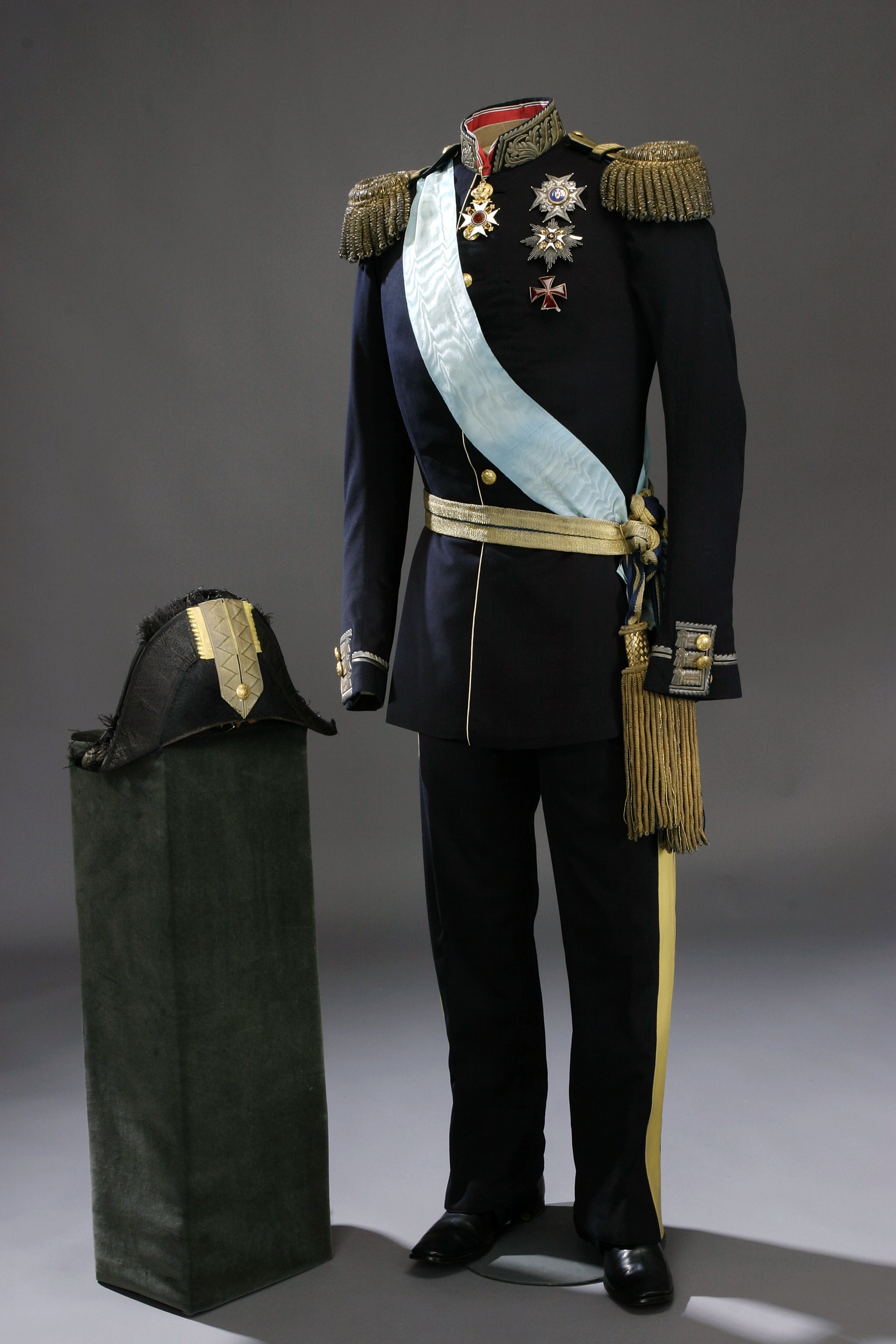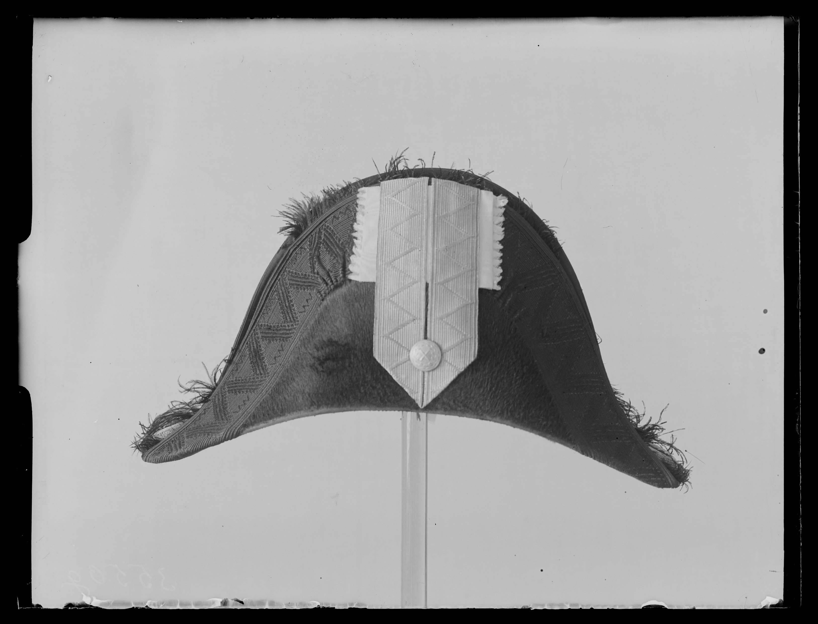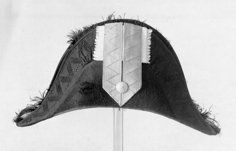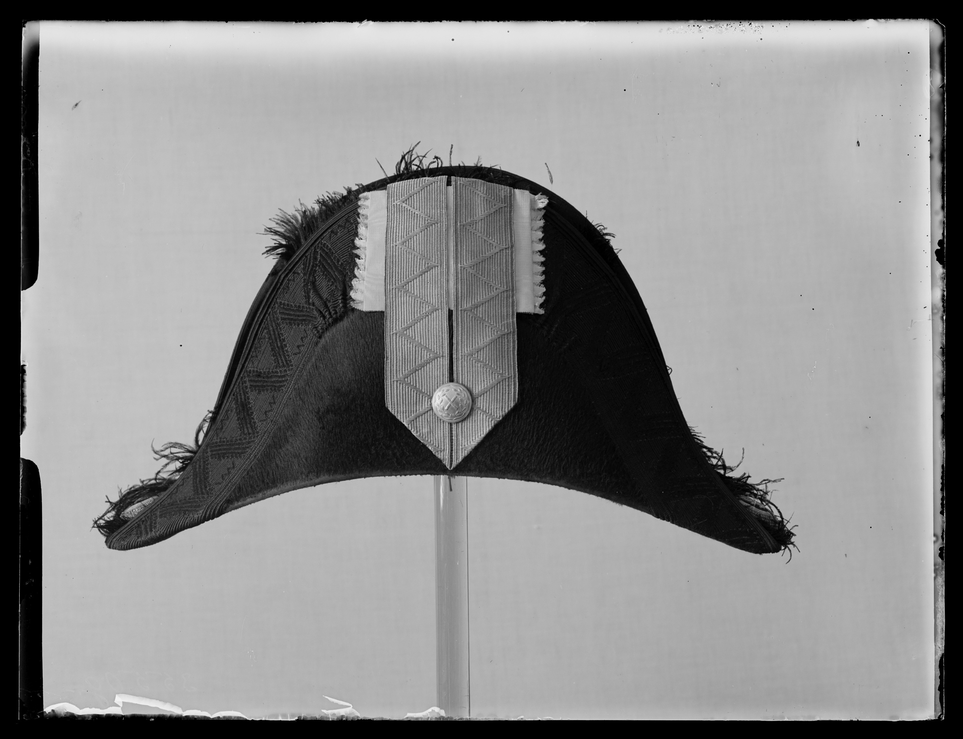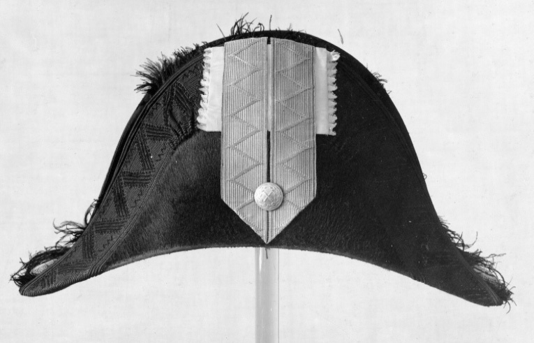Bikorn av svart silkesfelb, kantad med svart, vävd galon och svart plymet av struts. Gult vikt sidenband med galon samt generalstabsknapp. Svettrem 55 mm bred av gulvitt skinn. Foder av vitt siden. Hakrem av svart lackskinn. I kullen firmaetikett: " A. Ericsson & Co // No 16 // Drottn. Gt // Prisbelönte v Pariser Expo // 1855."