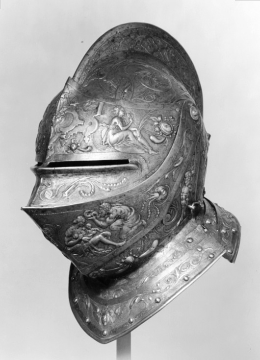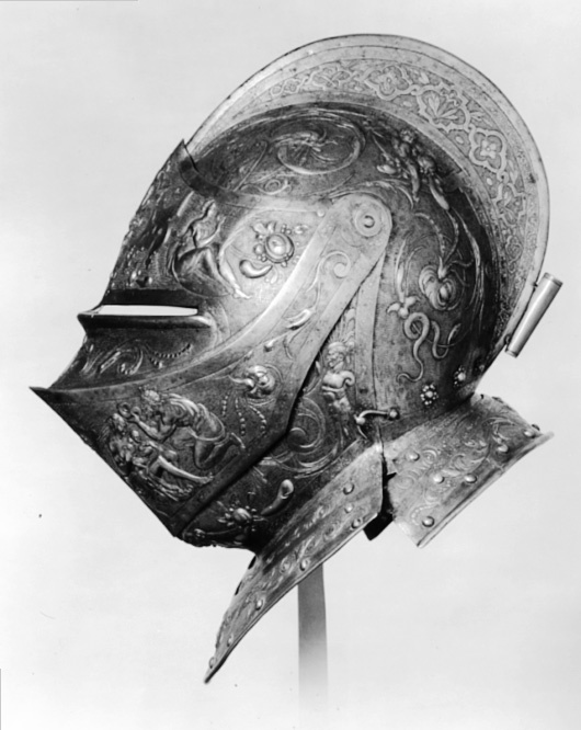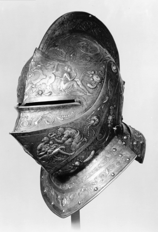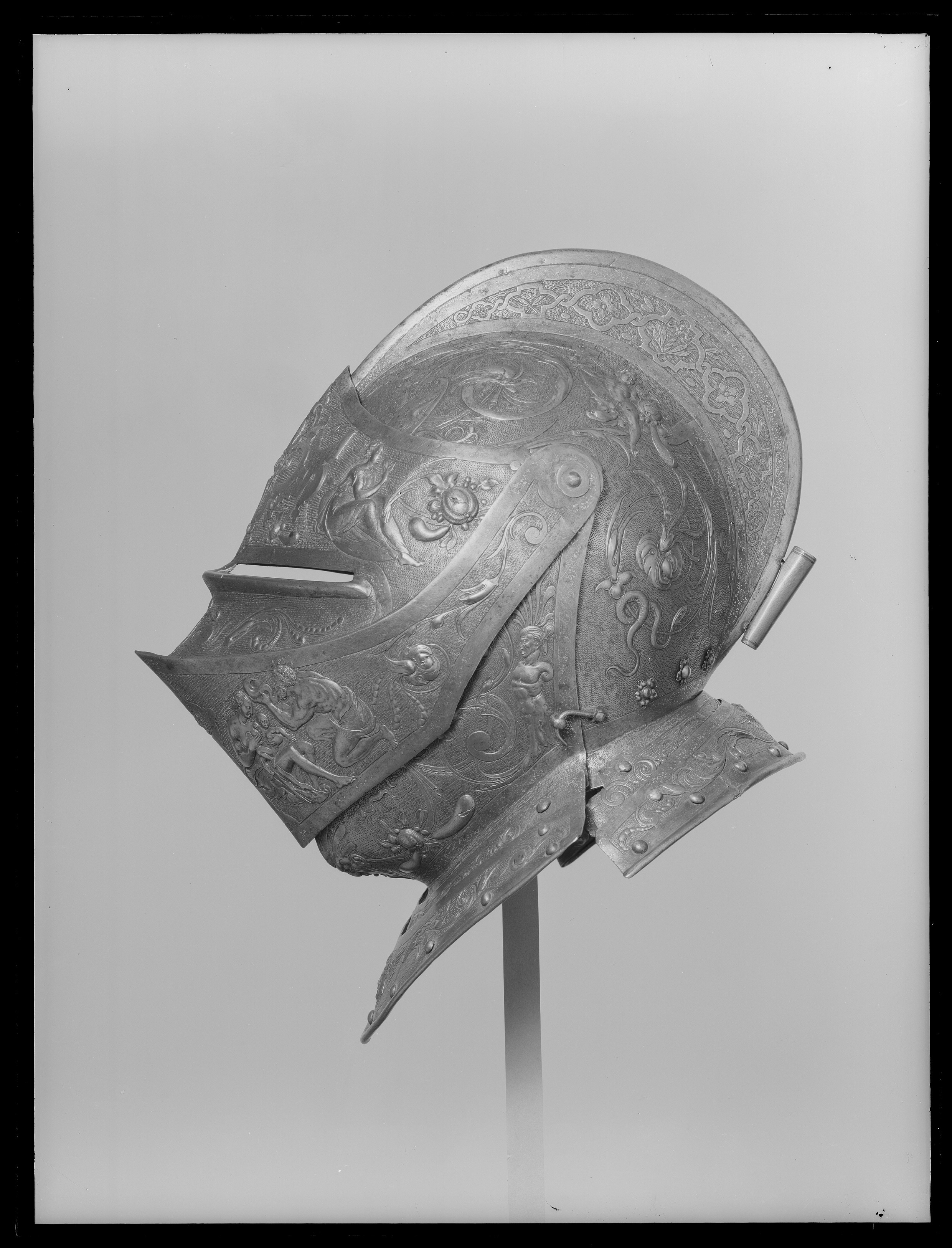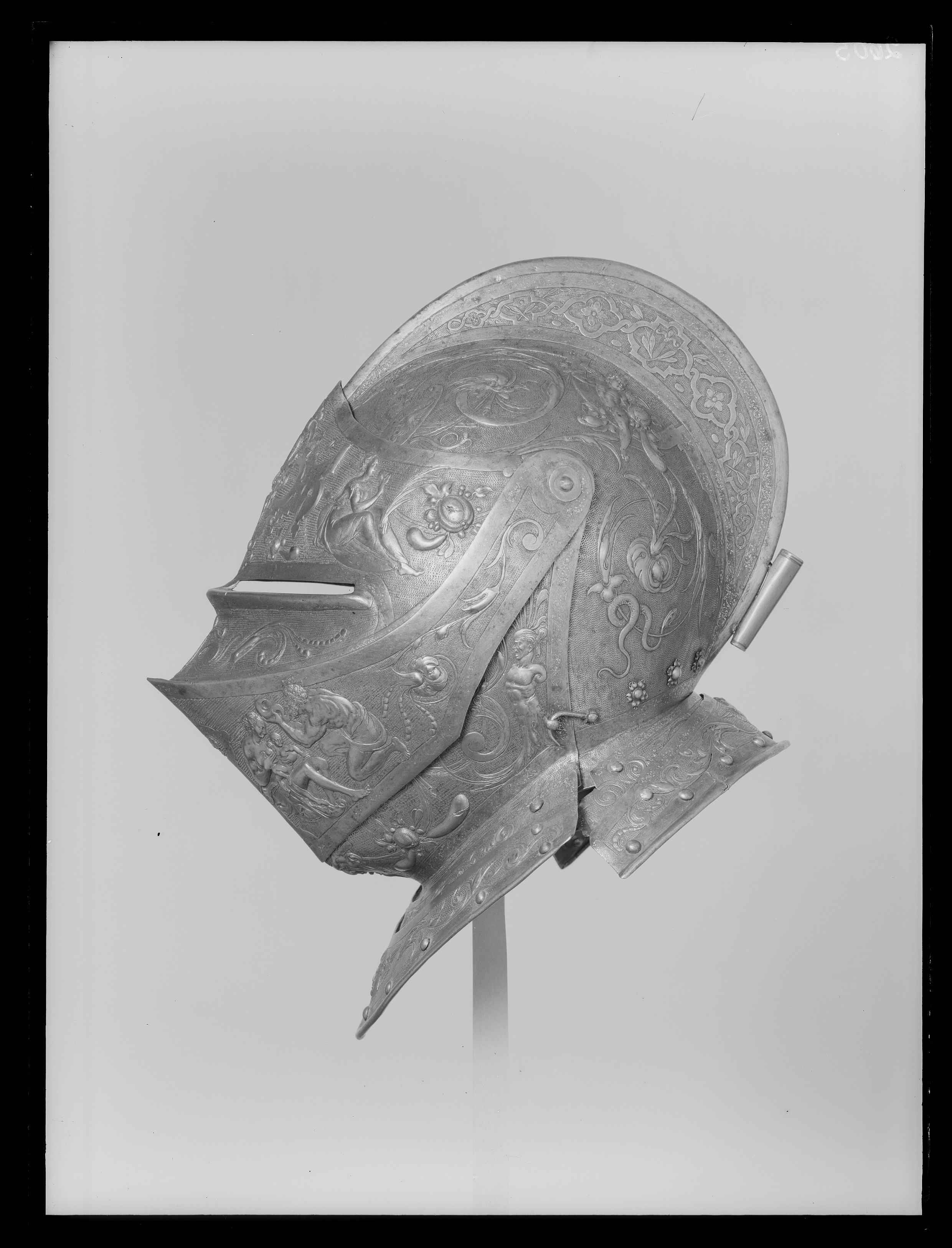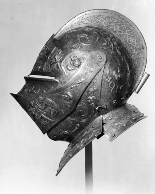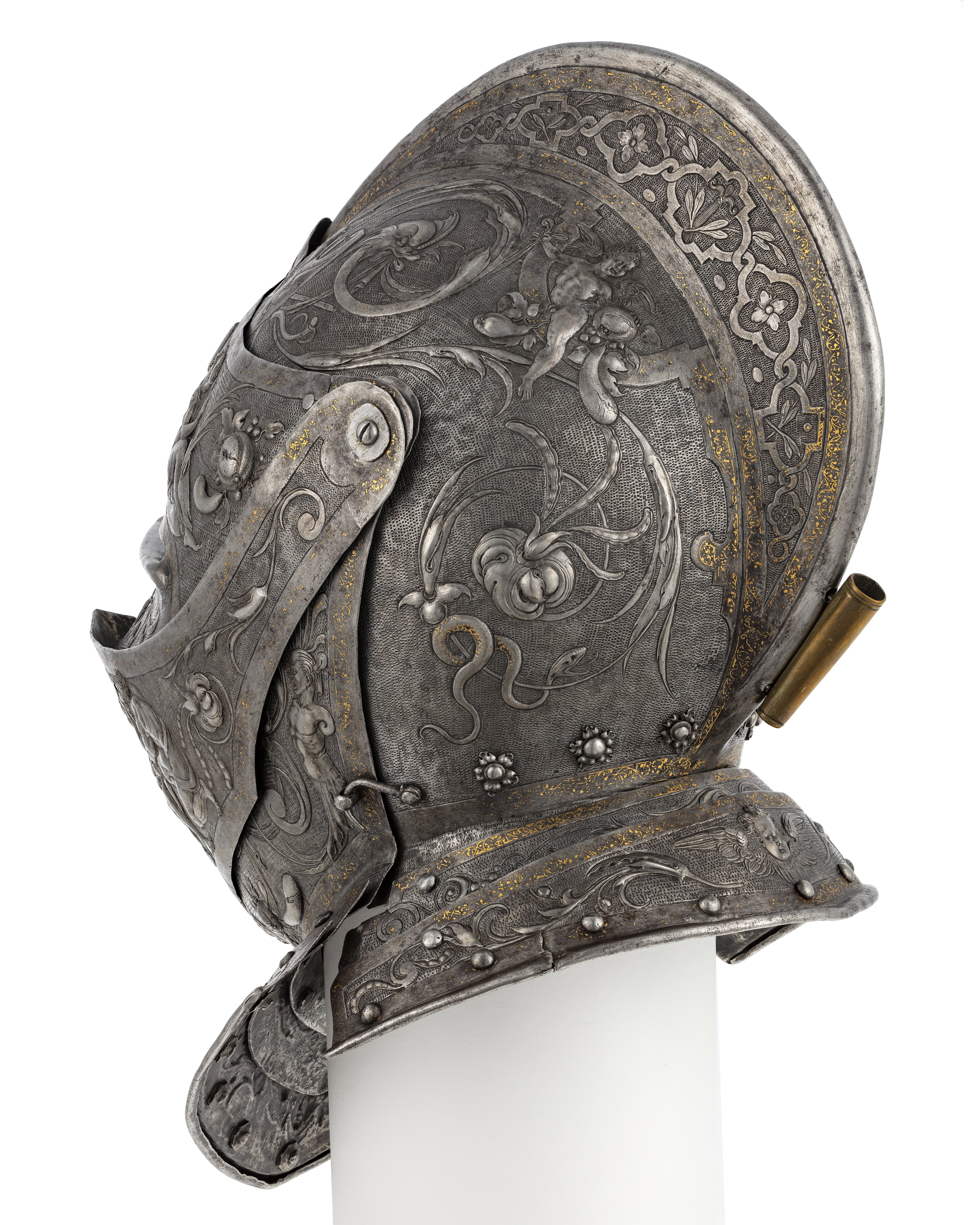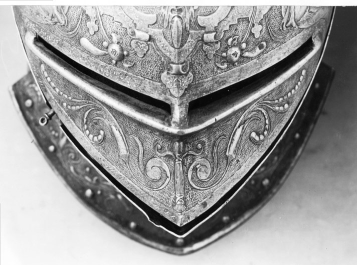 Visirhjälm av driven och punsad stålplåt, tillhörig Erik XIV:s paradrustning.