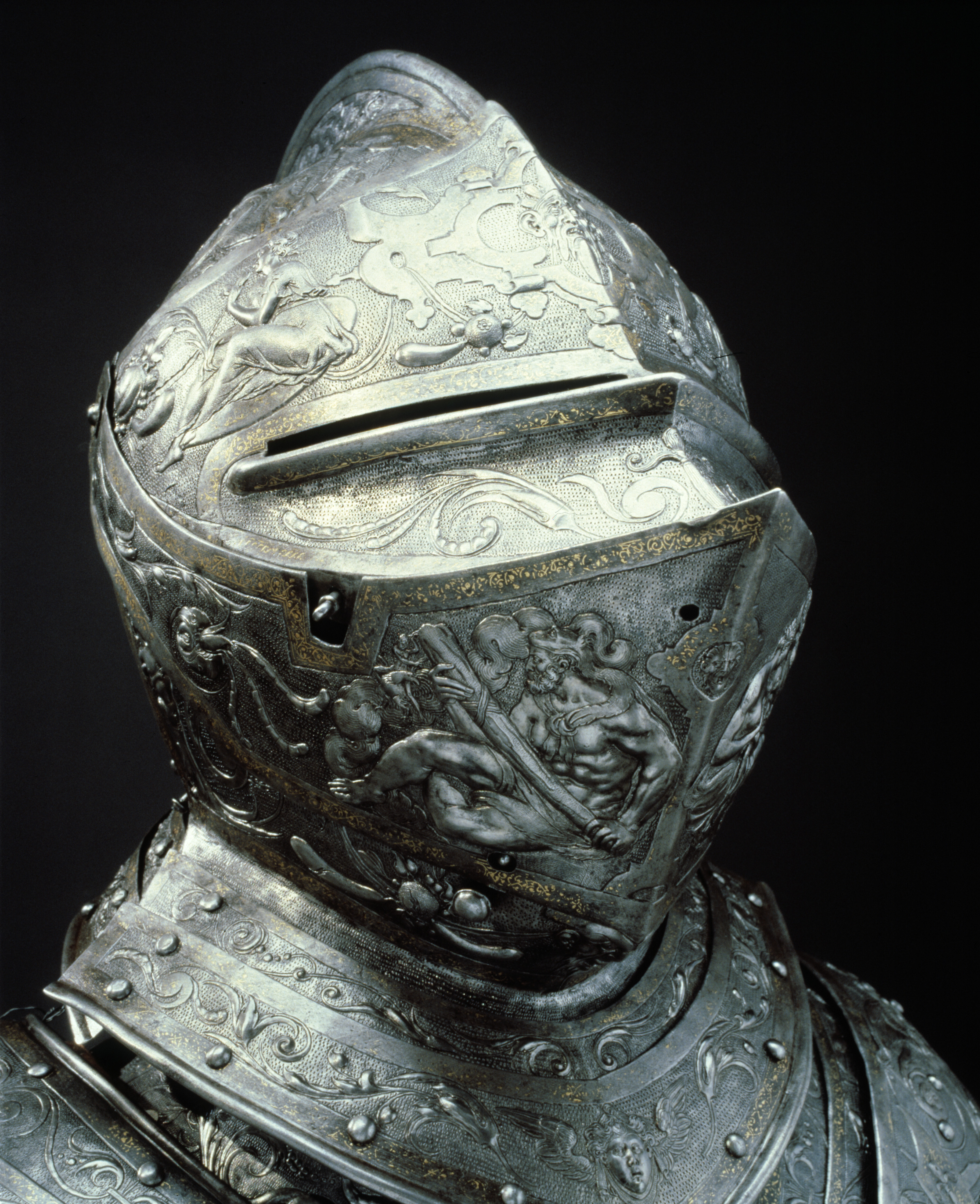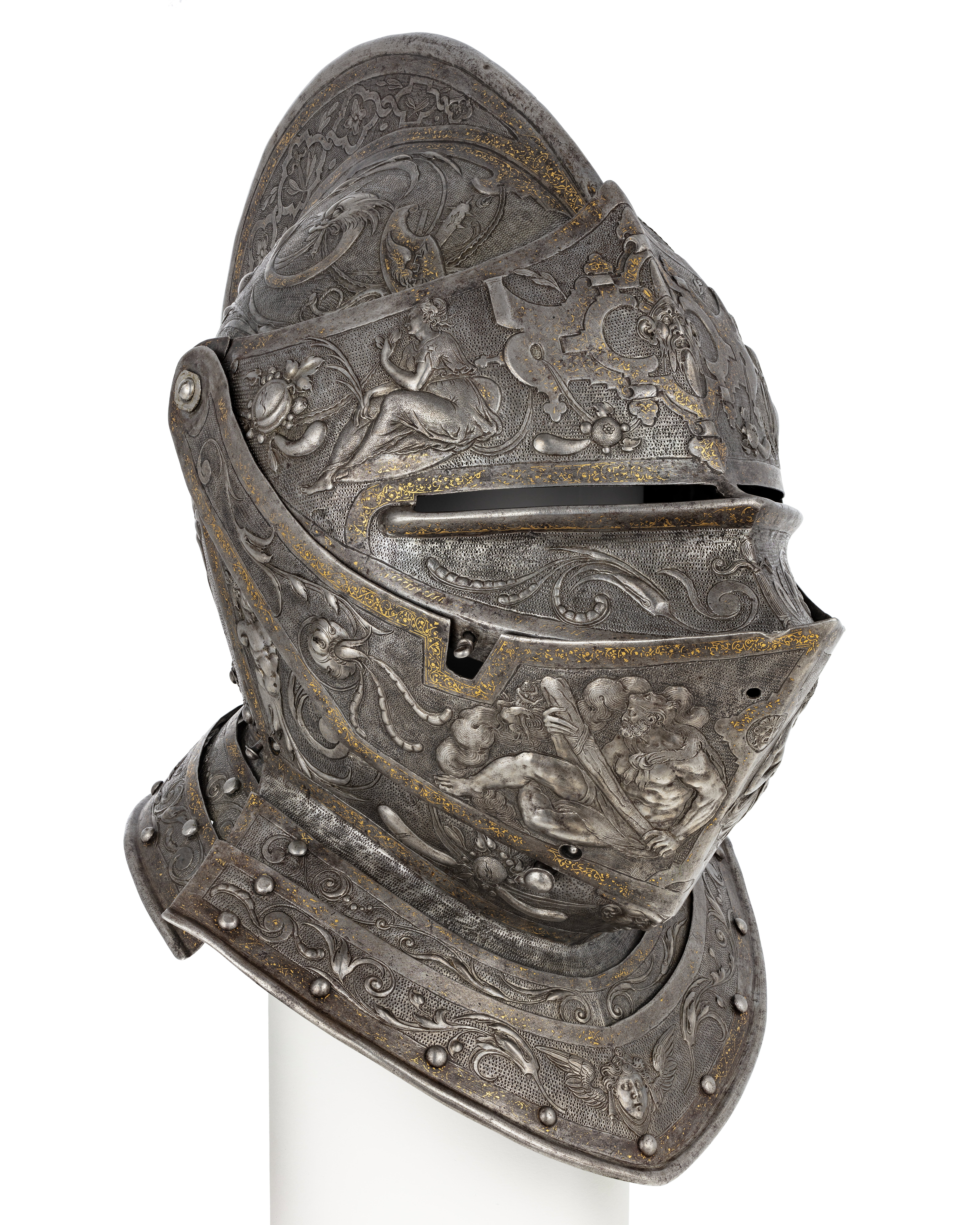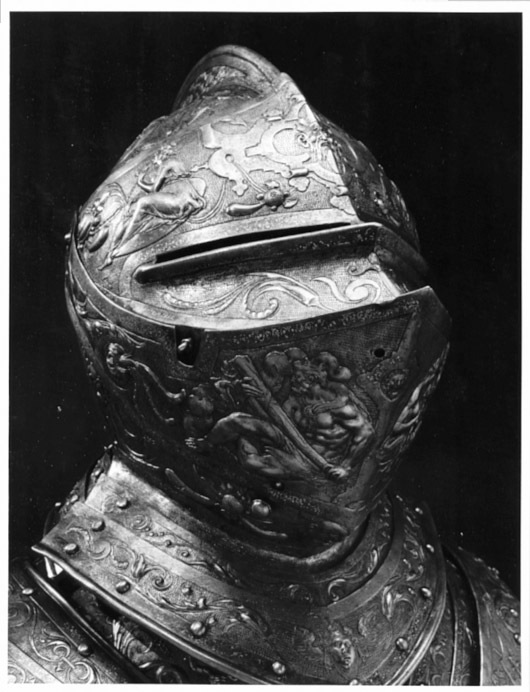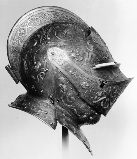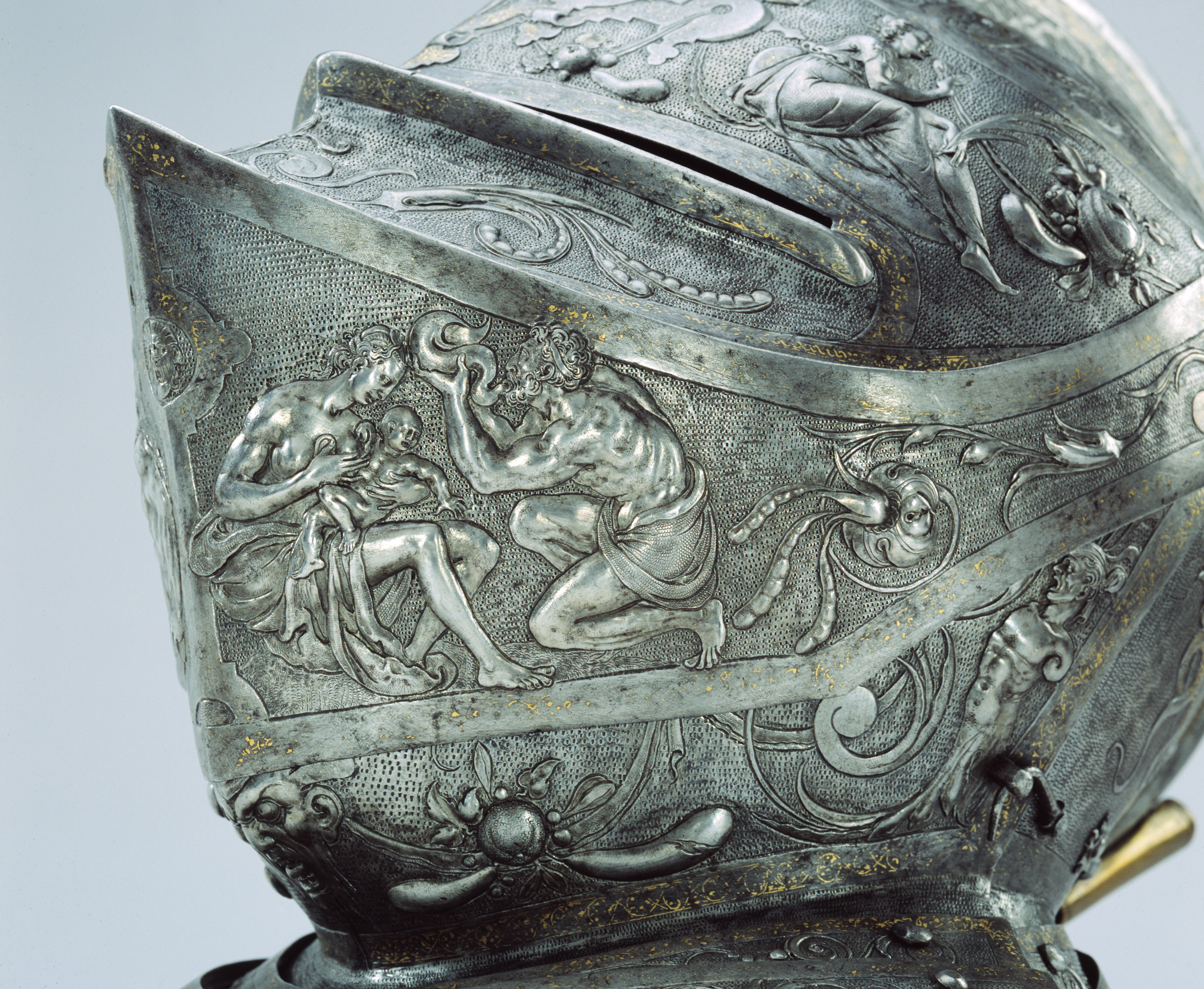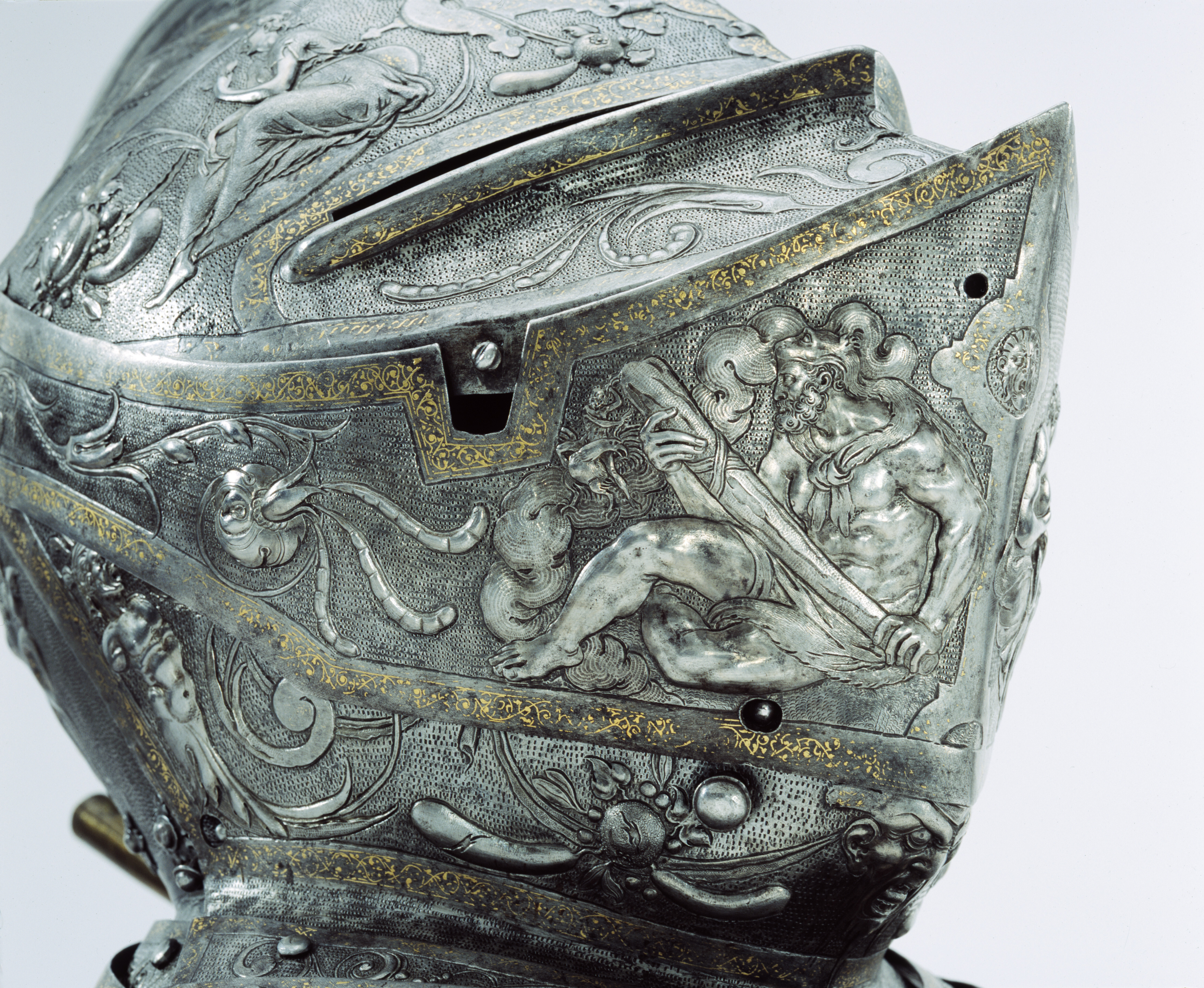 Visirhjälm av driven och punsad stålplåt, tillhörig Erik XIV:s paradrustning.