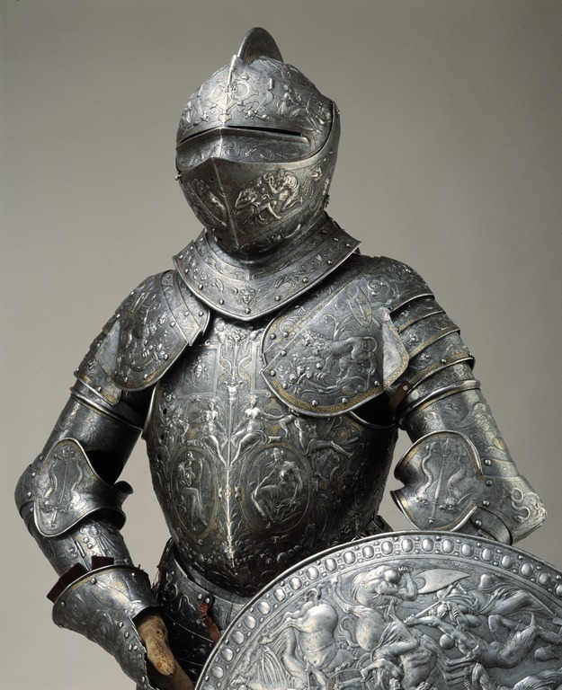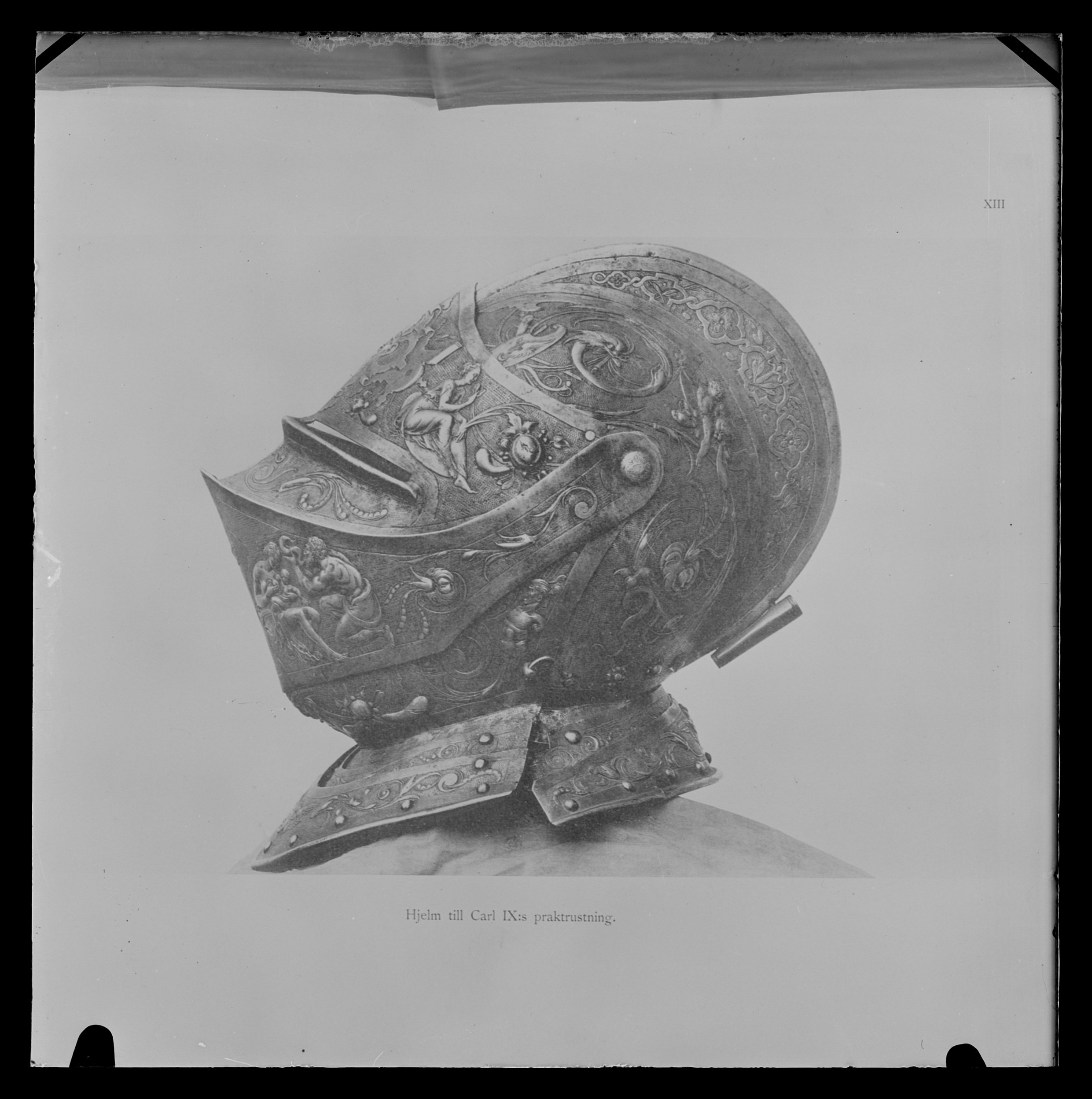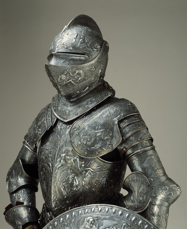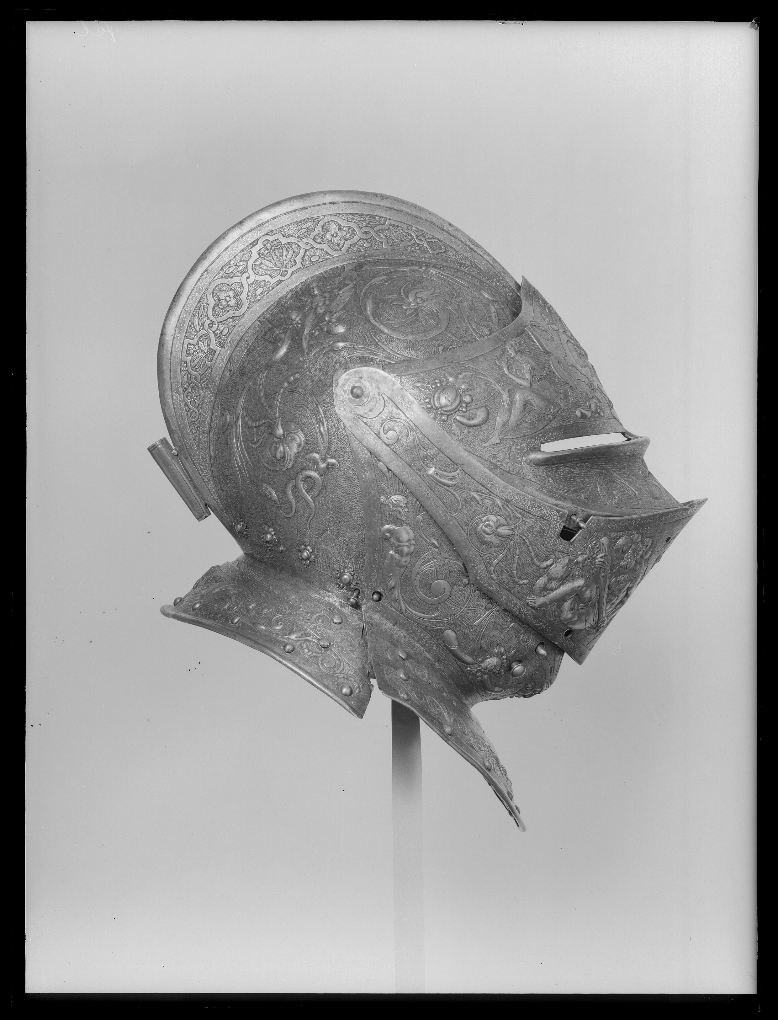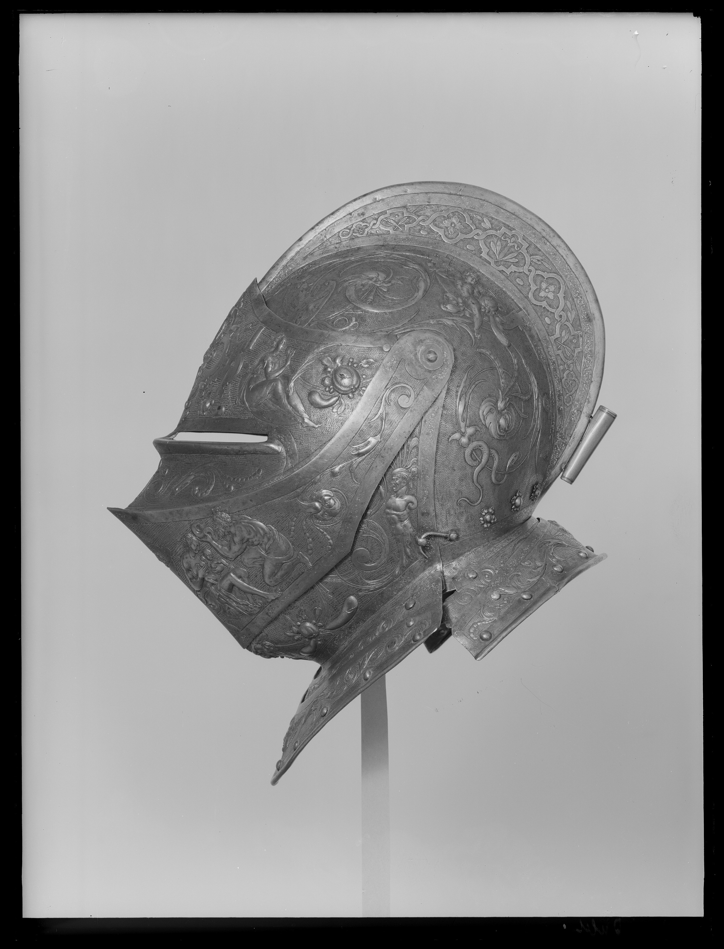 Visirhjälm av driven och punsad stålplåt, tillhörig Erik XIV:s paradrustning.