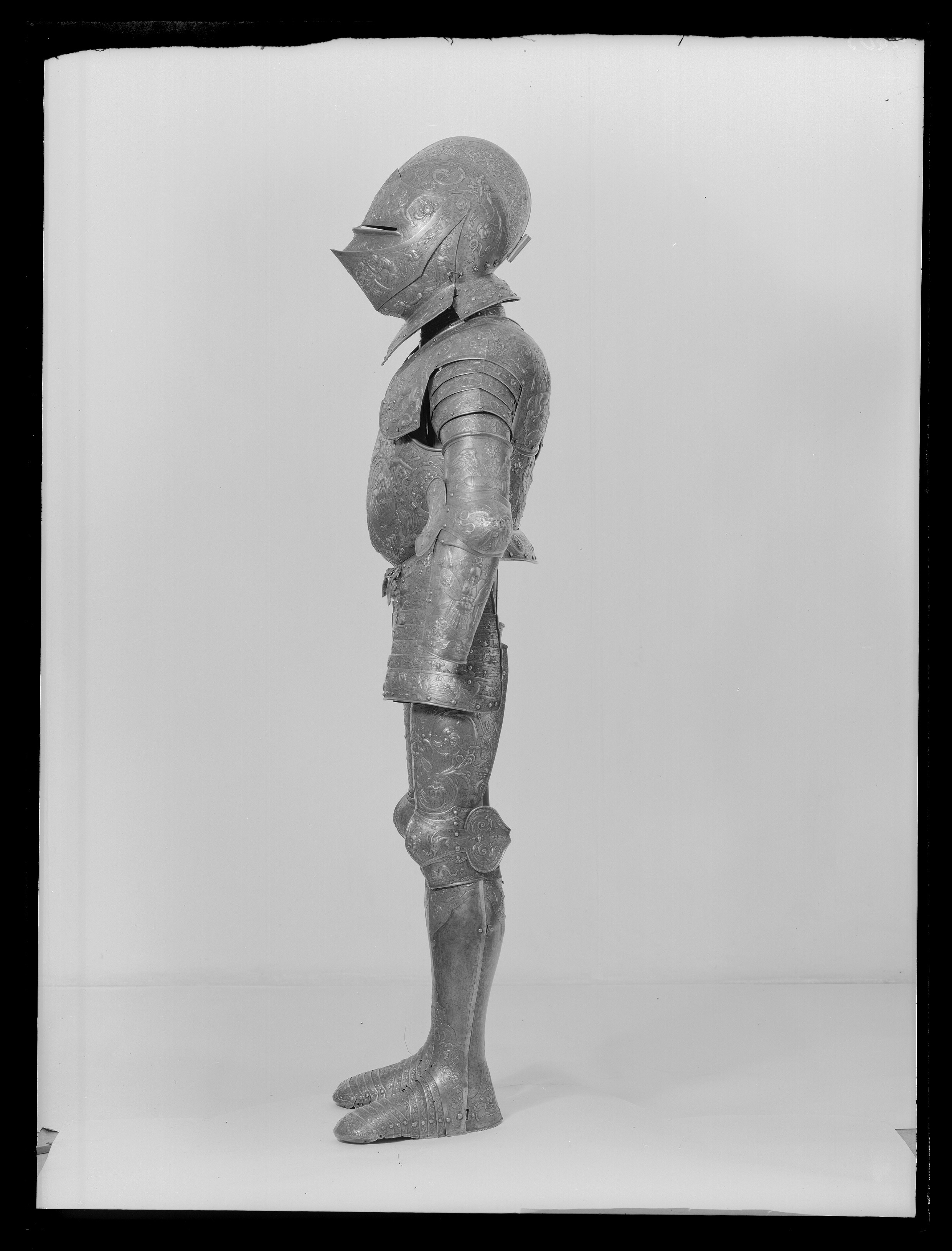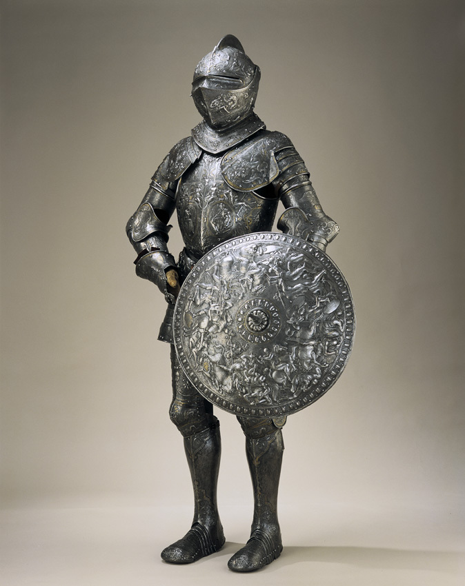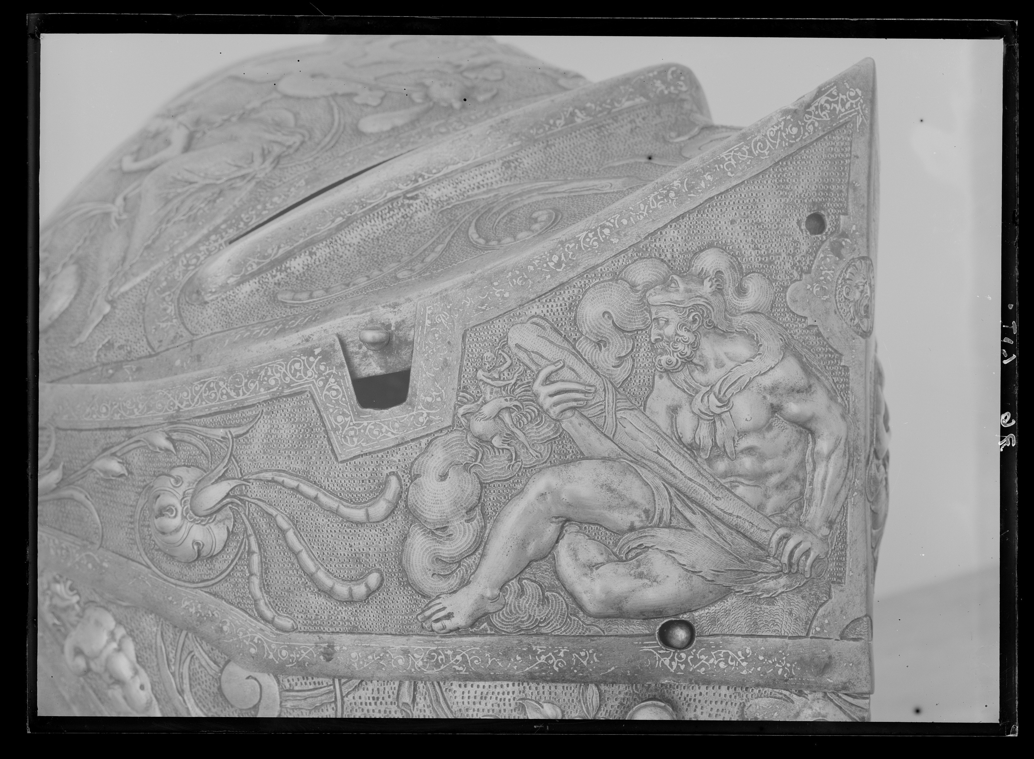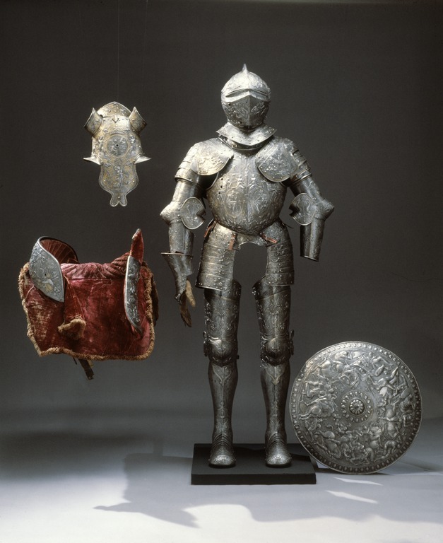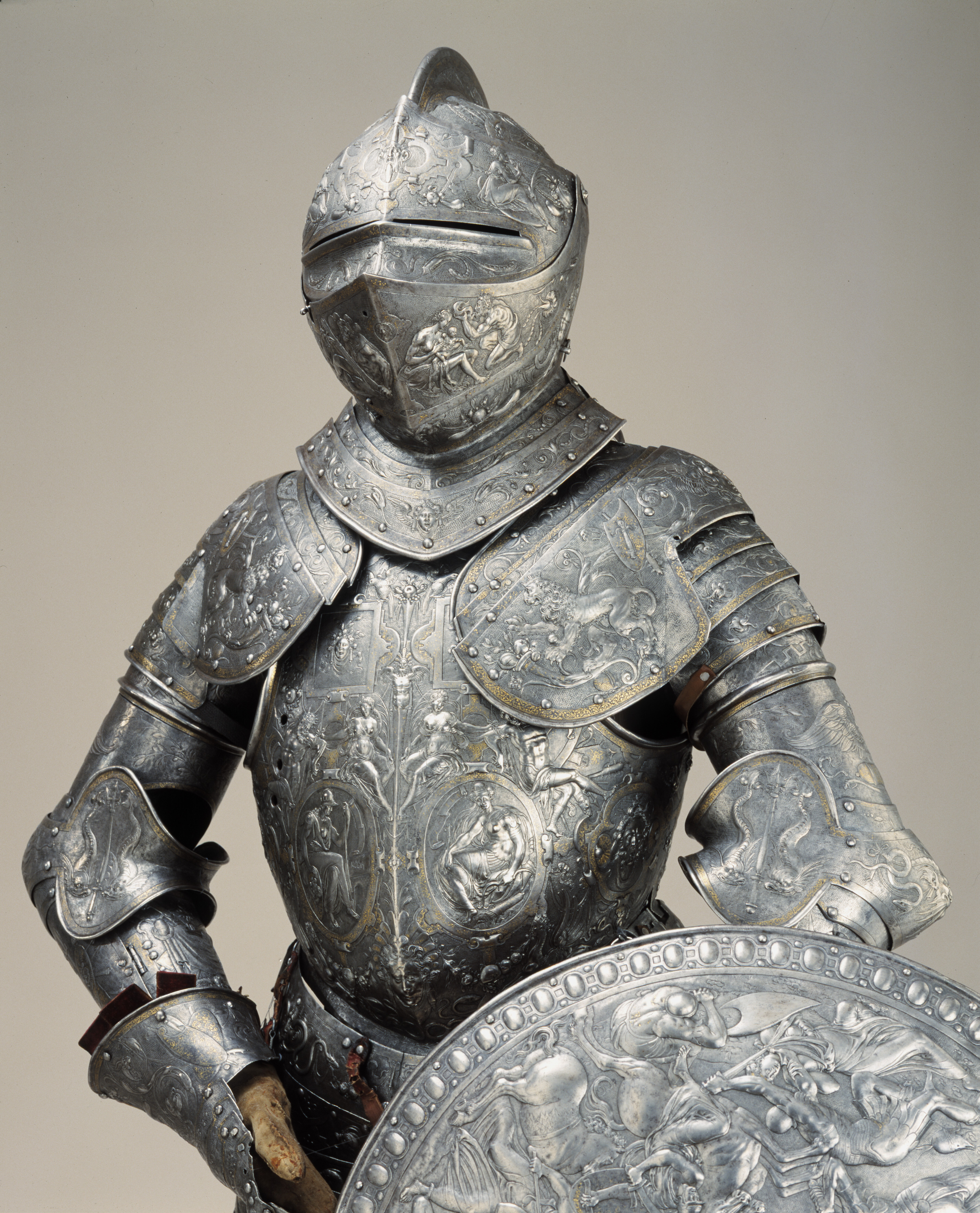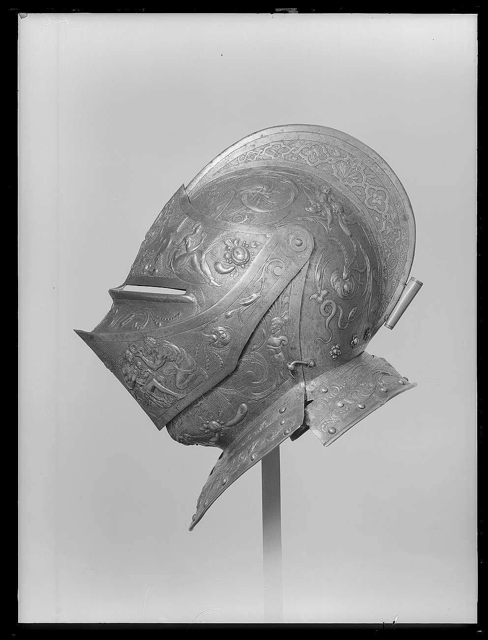Visirhjälm av driven och punsad stålplåt, tillhörig Erik XIV:s paradrustning.