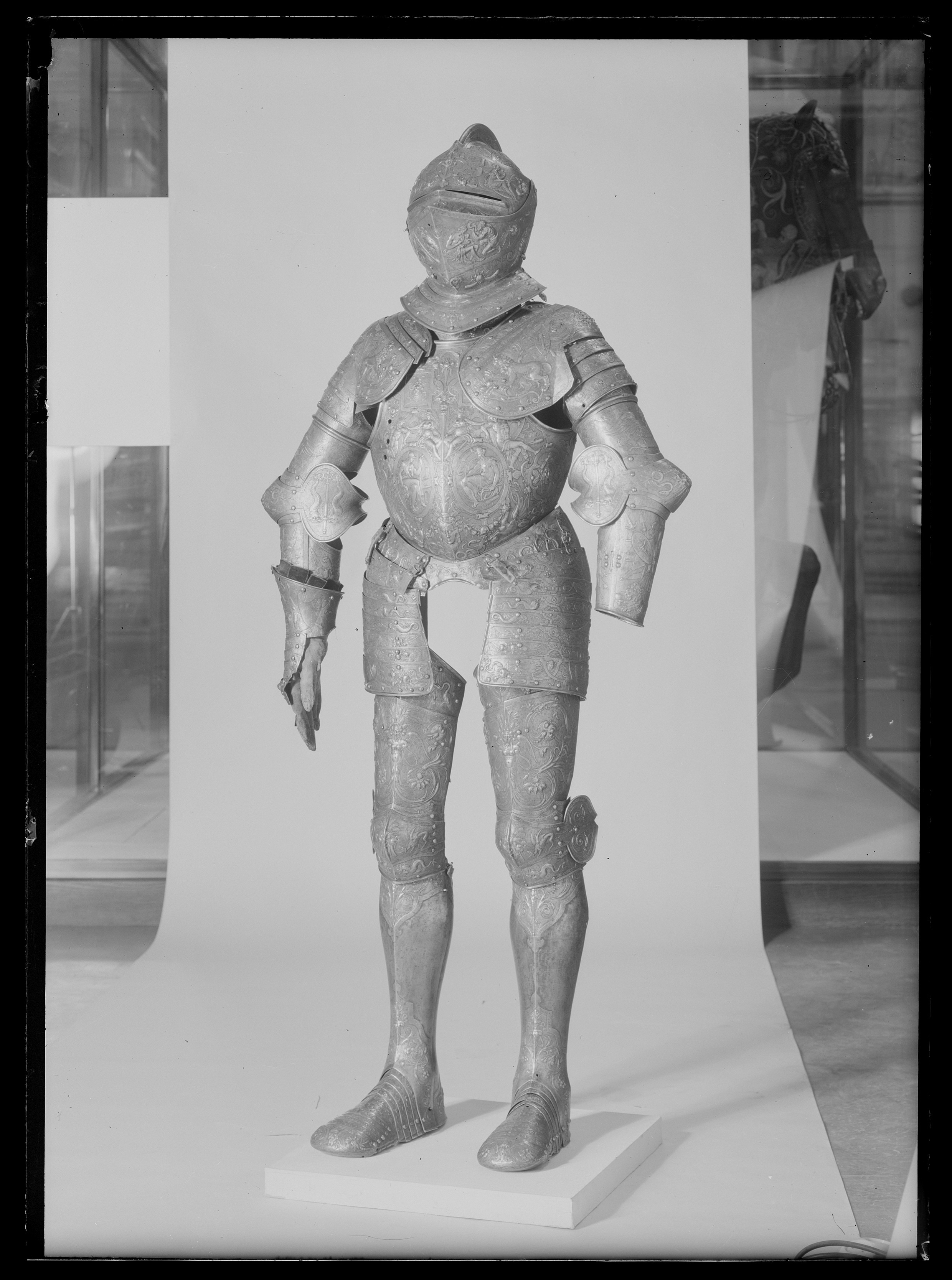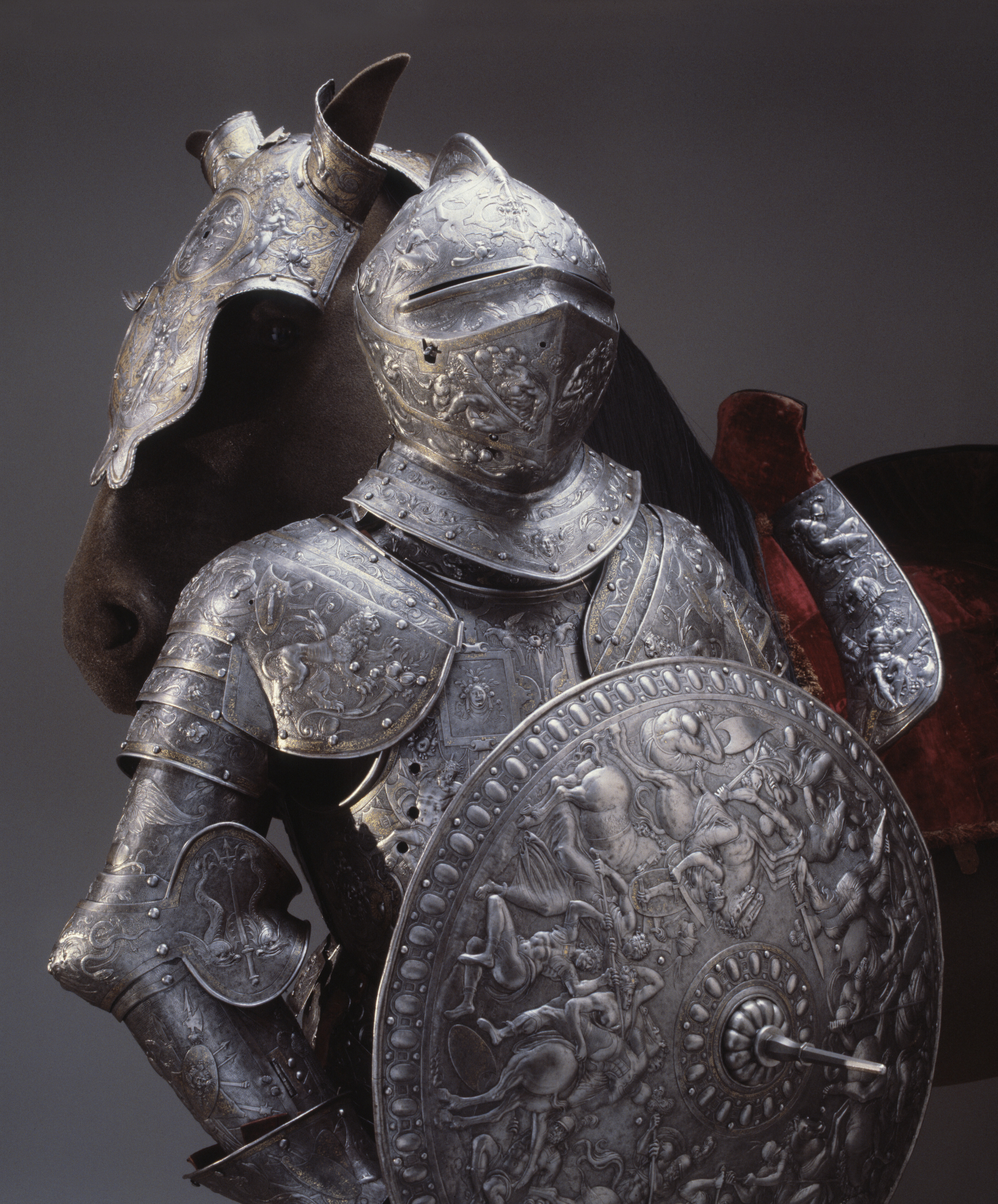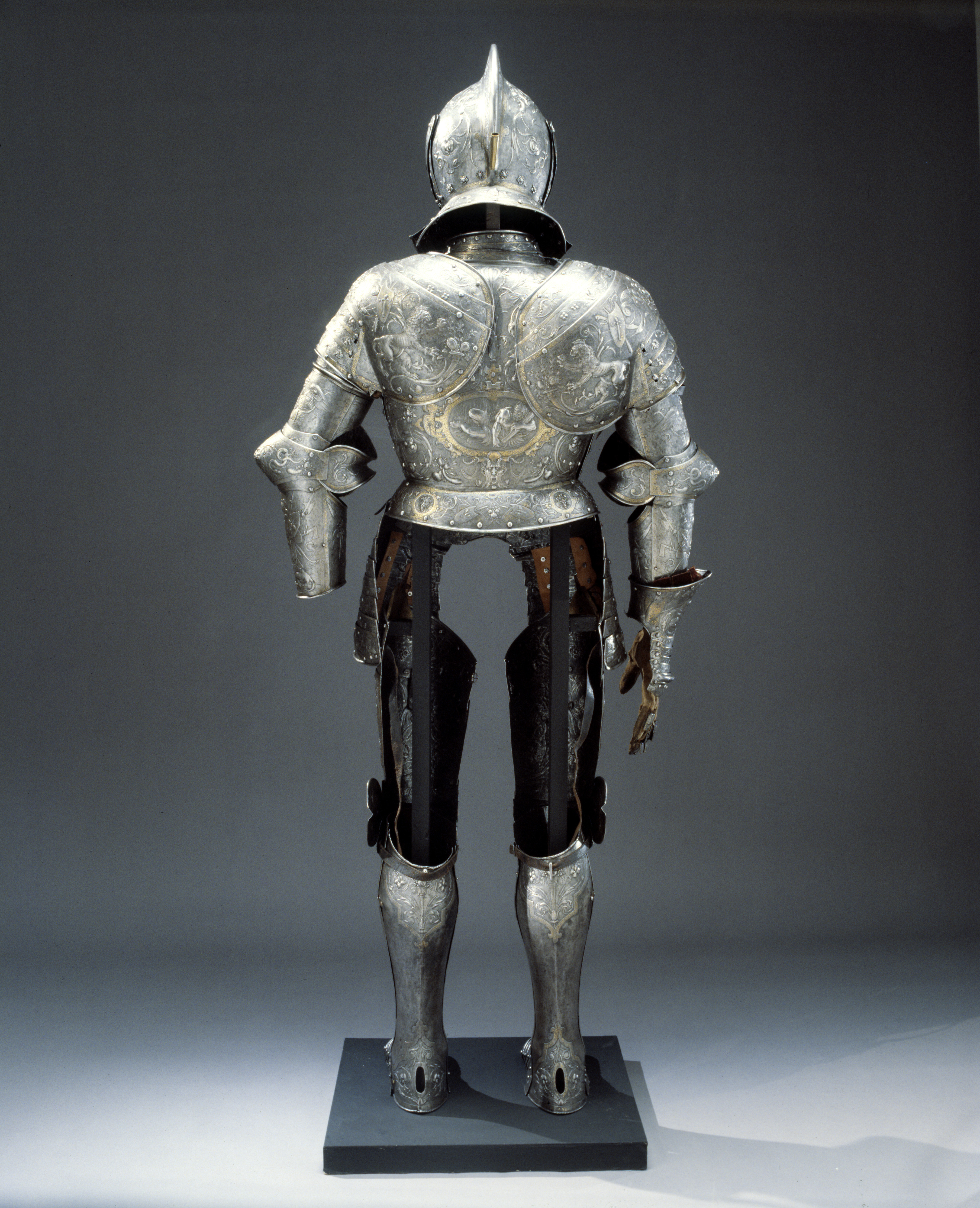 Sluten hjälm med kam, hjälmklocka, visir och hjälmkrage av två lameller. Baktill en plymhållare. Hjälmen kännetecknas framförallt av sin mycket rika dekor, som rustningens övriga delar. Hela ytan är täckt av figurer i höjd relief, hela bakrundens yta är täckt av punsad dekor. De olika fälten delas av med en bård i guld. På hjälmens kam samt på visir och hjälmklocka förekommer även beslagsornamentik. Vissa av skruvarna är av nyare datum.