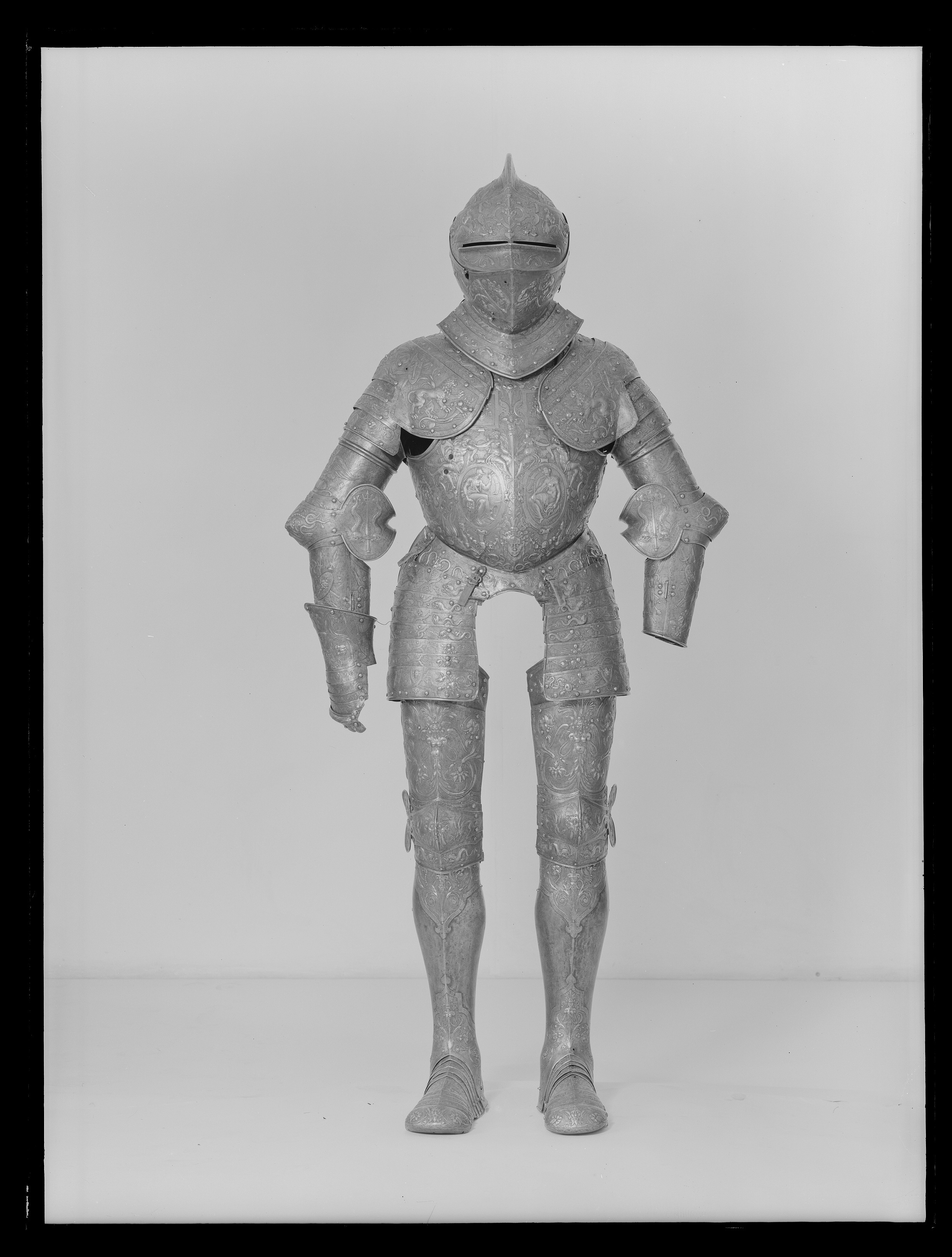 Sluten hjälm med kam, hjälmklocka, visir och hjälmkrage av två lameller. Baktill en plymhållare. Hjälmen kännetecknas framförallt av sin mycket rika dekor, som rustningens övriga delar. Hela ytan är täckt av figurer i höjd relief, hela bakrundens yta är täckt av punsad dekor. De olika fälten delas av med en bård i guld. På hjälmens kam samt på visir och hjälmklocka förekommer även beslagsornamentik. Vissa av skruvarna är av nyare datum. Rustningen består av 18 delar, enligt nuvarande numrering, levererades till Erik XIV 1562. Materialet är stål med etsad och driven dekor samt pålagt guld. Tillverkad vid Arbogas vapenfaktori och dekorerad i Antverpen av guldsmeden Eliseus Libaerts efter förlagor från den franske konstnären Etienne Delaune. Hela garnityret är dekorerat med mytologiska gestalter, fjättrade fångar, stridsscener och trofégrupper samt Vasavapnet, det lilla riksvapnet och Folkungalejonet. Rustningen kan tex ha använts vid något av de många festtåg som kungen arrangerade, både av krigisk och fredlig art. Ett av dessa ägde rum efter fälttåget mot Danmark 1564 då Erik red in i Stockholm "i stor triumf". Han medförde både troféer och krigsfångar som utgjorde en levande illustration till rustningsgarnityrets dekor. Häststjärnan levererades ett år senare 1563 och har en annan dekor, den sändes som ett varuprov på dekor och Erik beställde ytterligare minst en rustning från Antwerpen. När Libaerts personligen skulle leverera den nya rustningen blev både han och rustningen tillfångatagna i Danmark, under pågående krig, Erik försökte få rustning och Libaerts fria men misslyckades. Guldsmeden David Cnoep som var verksam vid det danska hovet blev ägare till rustningen. Cnoeps son sålde den till Christian II av Sachsen. Rustningen finns idag i Historisches Museum i Dresden och är dekorerad med Vasavapnet och det lilla riksvapnet.