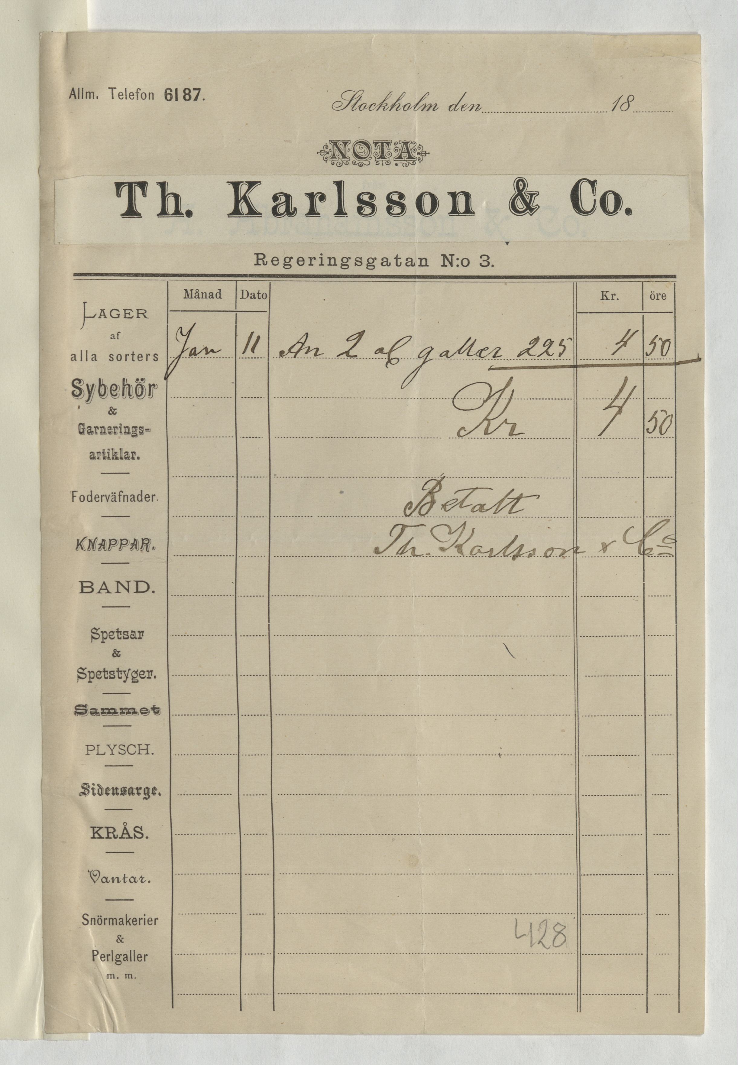 Kvitto från Th. Karlsson & Co. Stockholm.