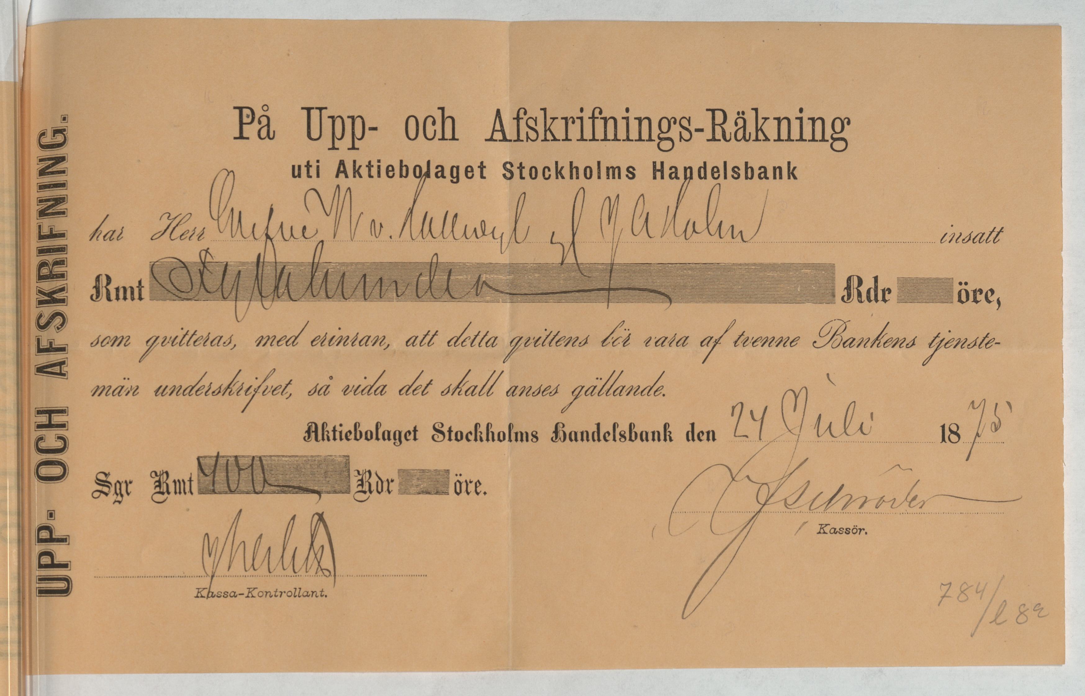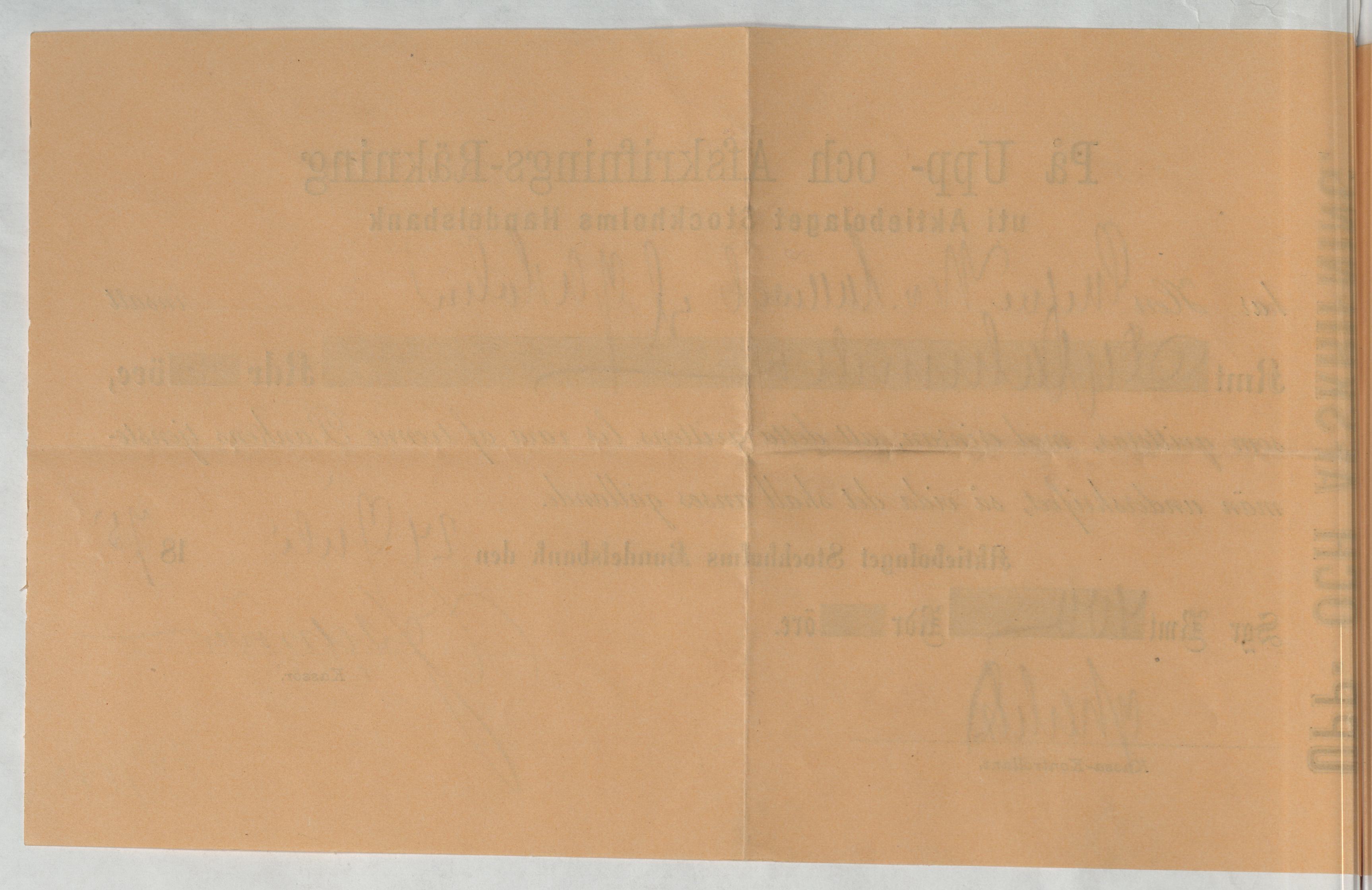 Kvitto från Aktiebolaget Stockholms Handelsbank rörande Upp- och Afskrifnings-Räkning