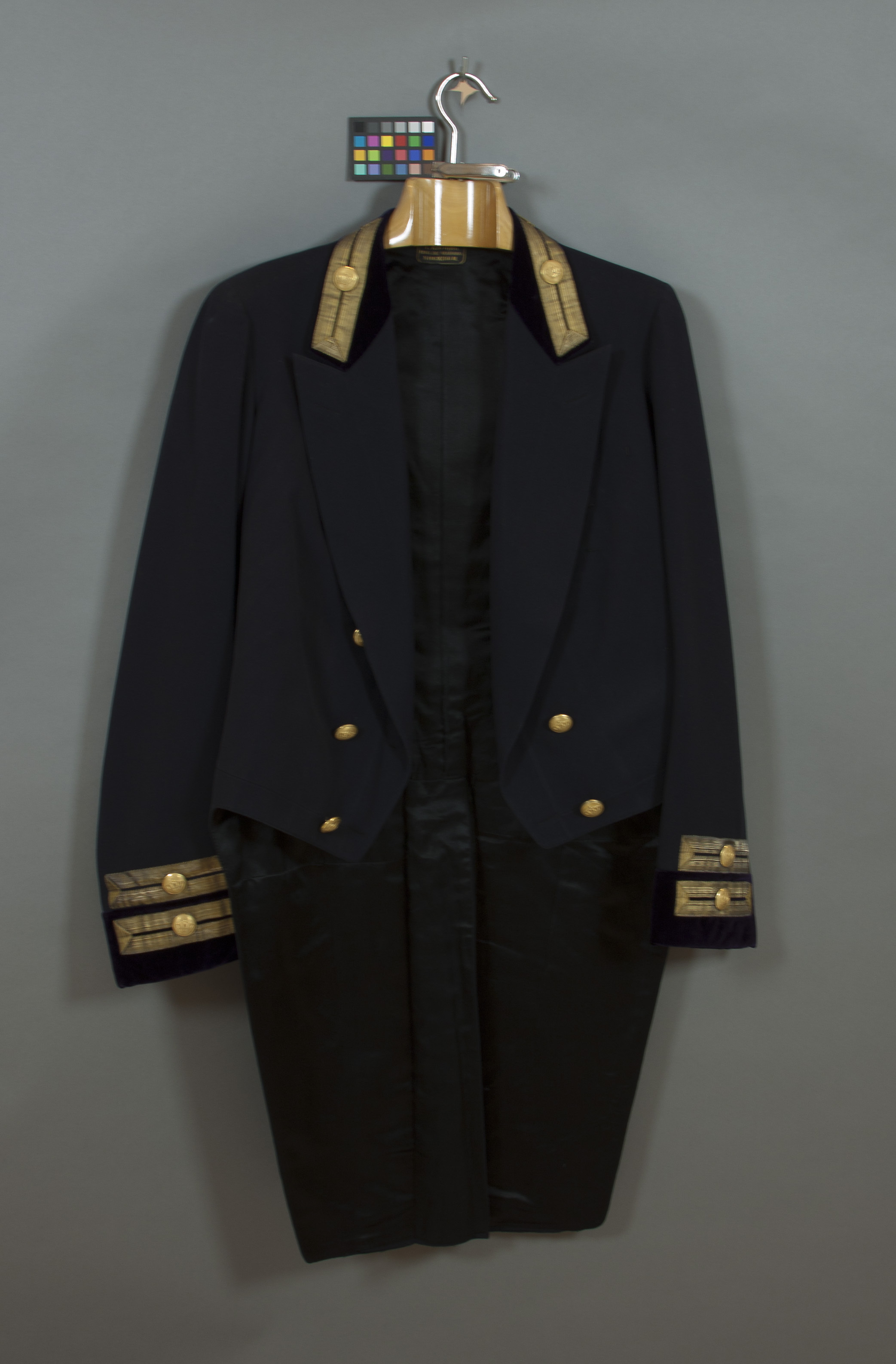 Frack av mörkblått kläde med fällkrage och slag. Kragens övre del klädd med lila sammet samt knapphål av guldgalon. Tvåradig med tre knappar i varje rad av förgylld mässing med kunglig krona i relief. På baksidan firmamärke "M. PETTERSON STOCKHOLM, ÅR1854". Nedtill på ärmarna 75 mm brett uppslag av lila sammet med två knapphål av guldgalon varav det ena är placerat ovanför uppslaget. Skört med en dold ficka på vardera sidan om sprundet, två knappar i livsömmen. På var sida om dessa två ficklock med vardera tre guldgaloner samt tre knappar till hälften dolda av locken. I livsömmen ovanför h. ficklock, två hål (för mycket). Foder av svart siden. Invid kragen firmamärke: "F. KAEDING )) KONGL HOF-SKRÄDDARE )) STOCKHOLM". Ärmfoder av vitt siden, en innerficka.