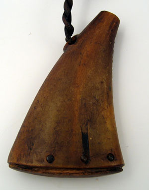 Av bruntmelerat flatpressat kohorn med svängd, uppåt avsmalnande form . Nertill botten av träplatta, långsmal med rundade kanter. Fäst i sidorna med ursprungligen sju metallnitar. I ryggen upptill en utskuren flack ögla. I denna fäst en tvinnad läderrem knuten i en mässingsring på kruttyget.