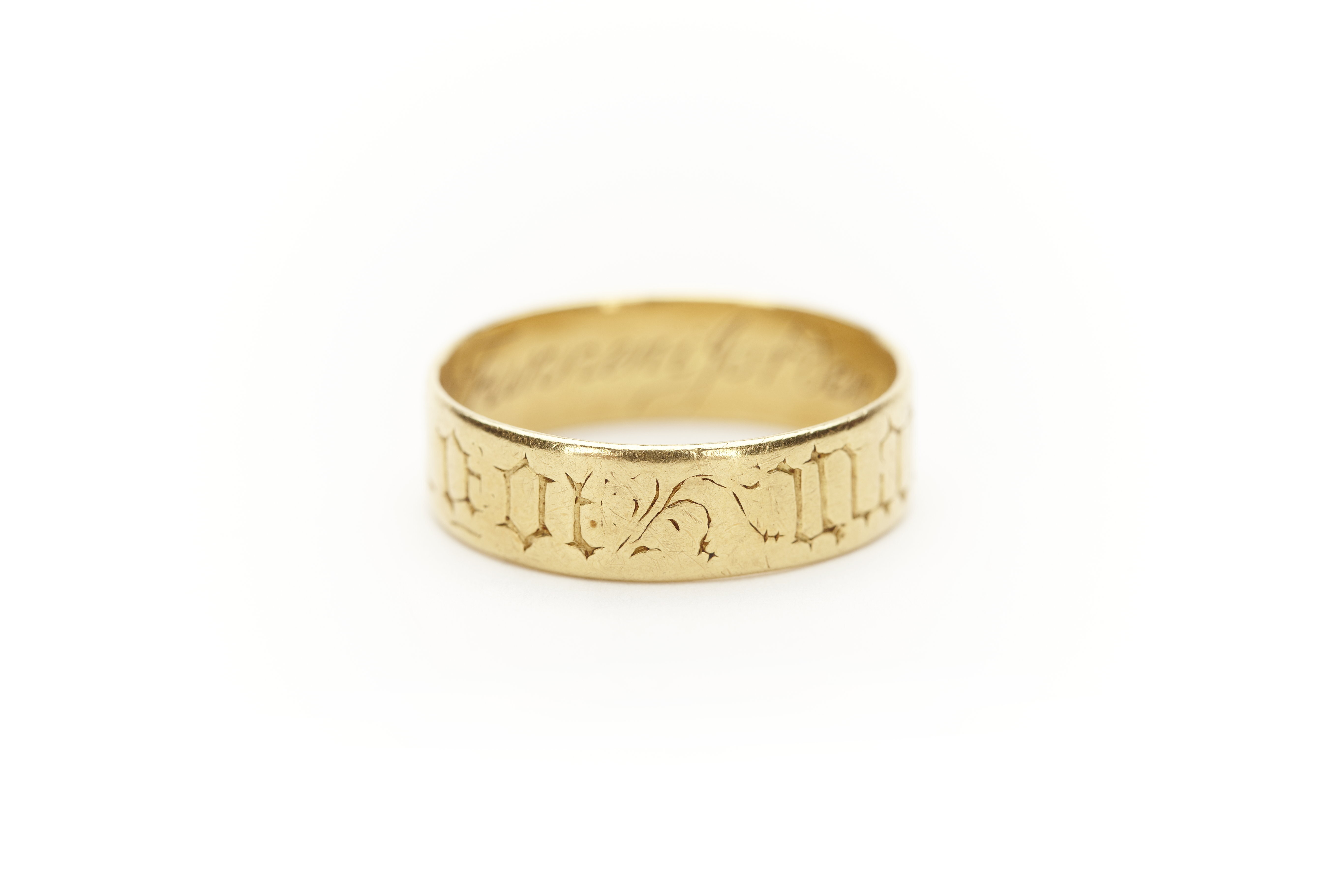 Tillverkad: Skandinavien, 1300-1400-tal. Guld, utvändigt graverad "help Maria". Inuti ringen graverat "Funnen i Jorden vid Wexio År 1783".