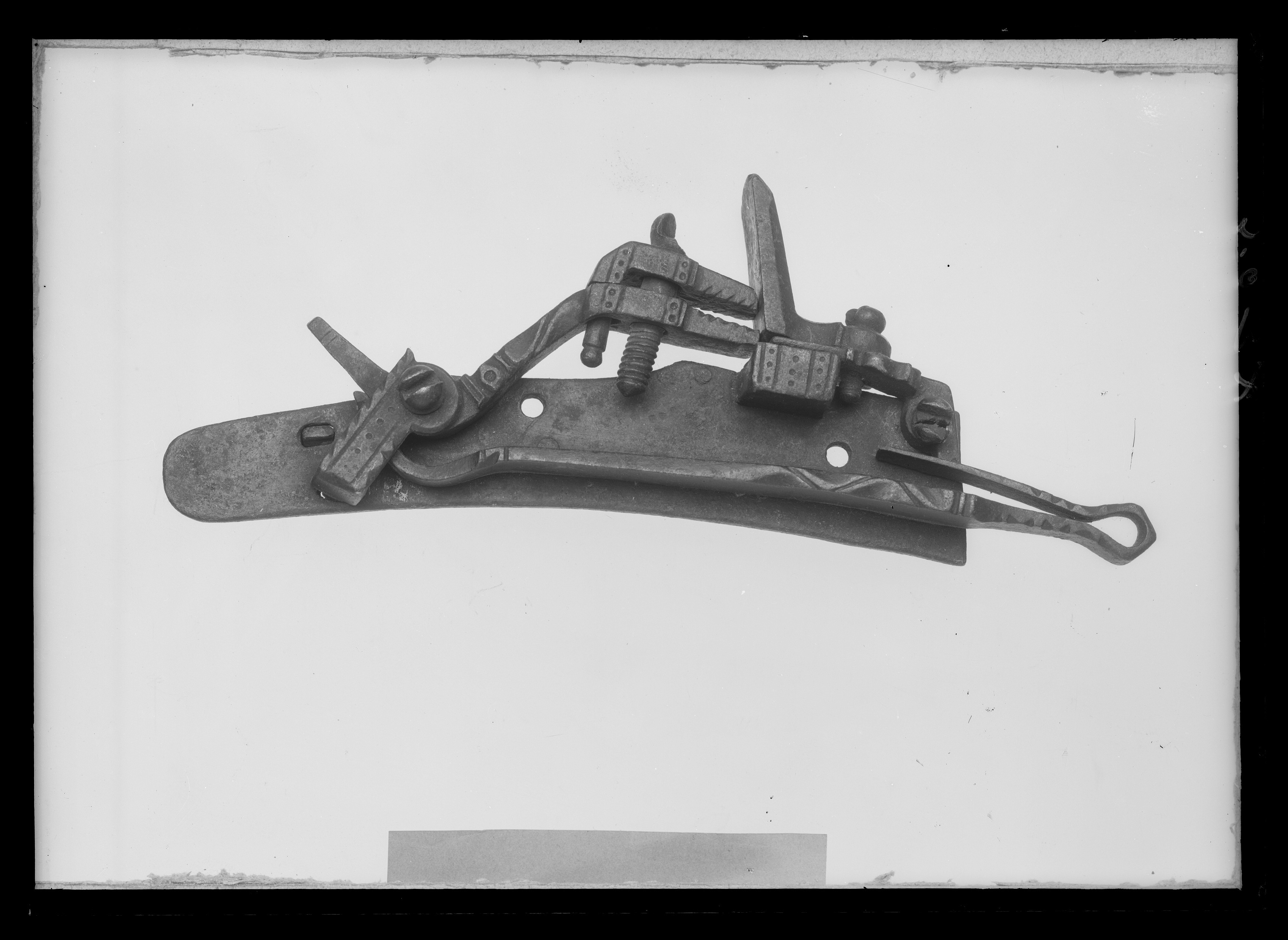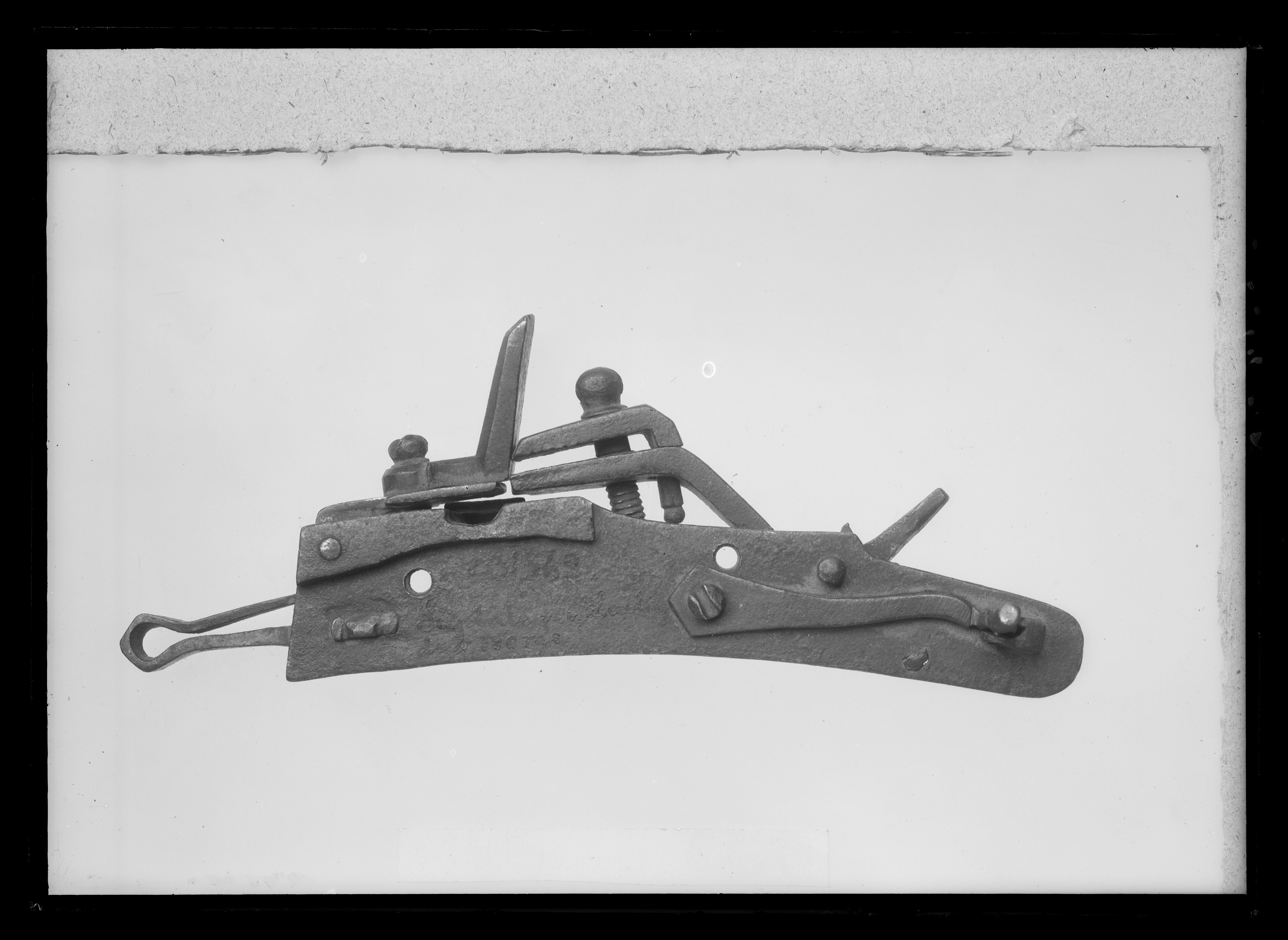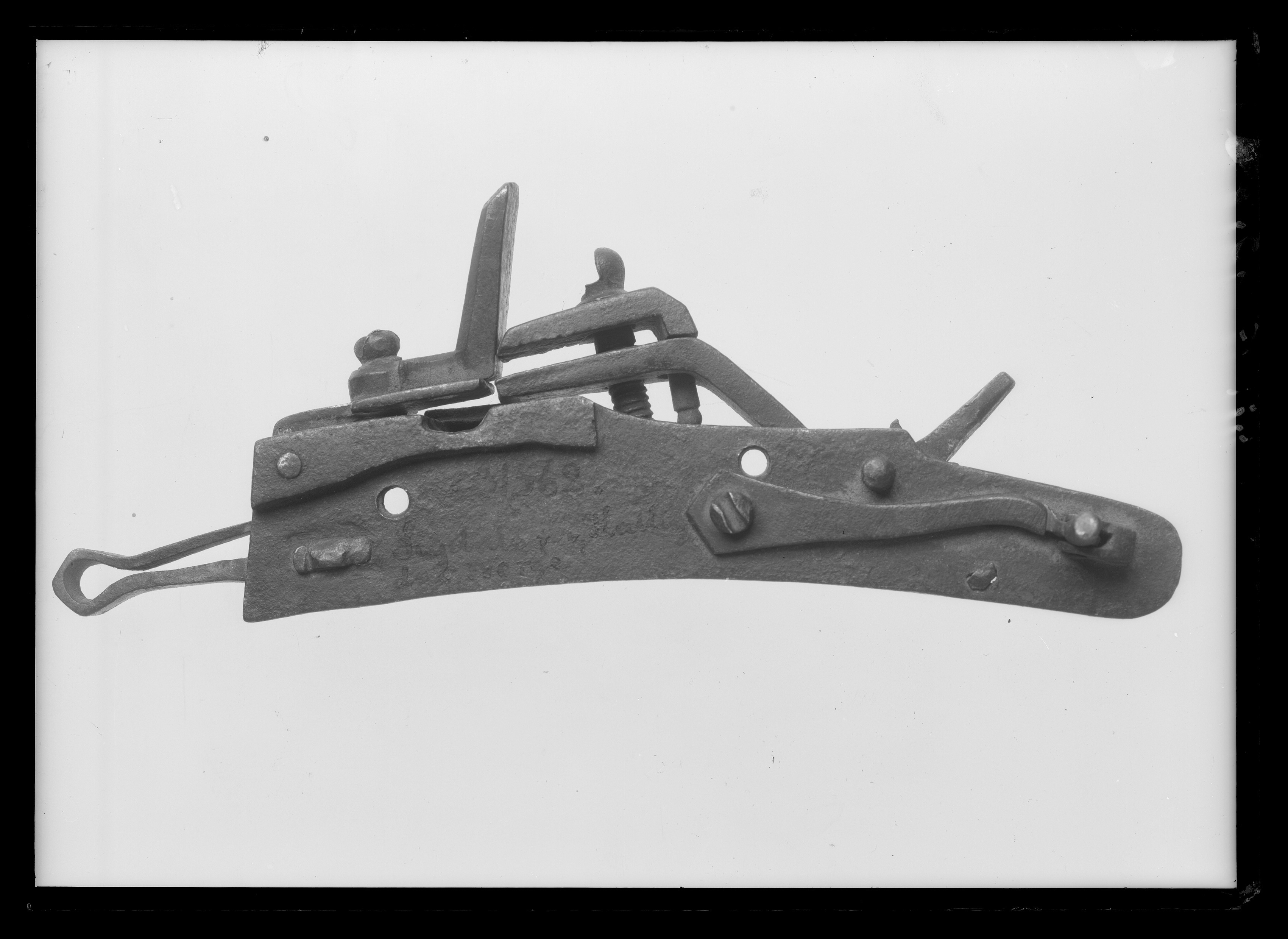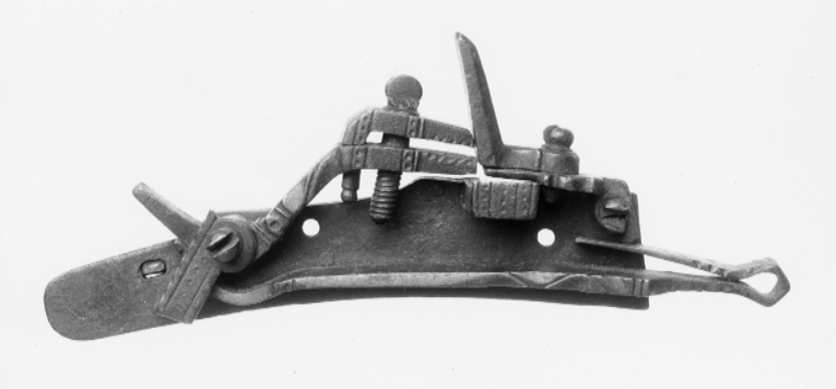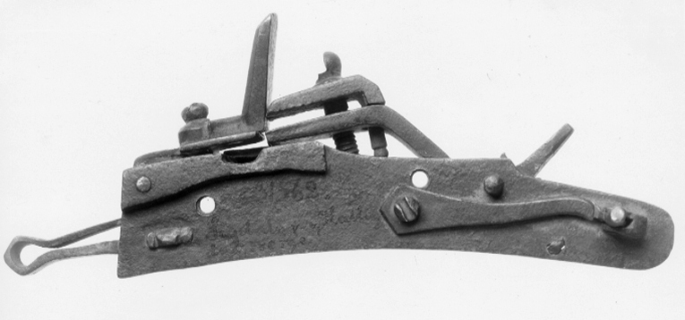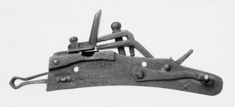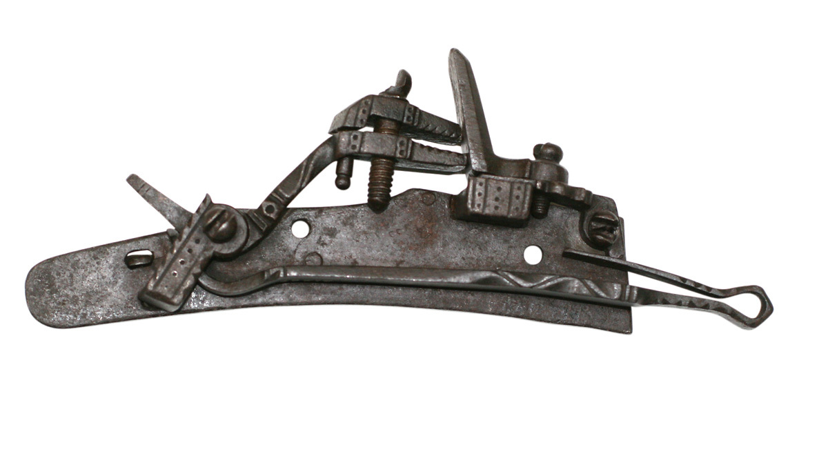 Snapplås med plant låsbleck, främre änden tvärt avskuren, bakänden rundad. S-formig hane med profilerad hals, lös överkäke, tappad genom underkäken, punsad dekor på käkarnas utsidor, tappens ände kulformig. Käkskruv med kulformigt, skadat huvud. Rektangulär fängpanna med streck- och punktdekor på gaveln. Fängpannelock med profilerad kant, rektangulärt omvändningseldstål med fasade kanter. Kombinerad slag- och batterifjäder med filad dekor, ringformigt utböjd i vinkeln. Hål för två låsskruvar.