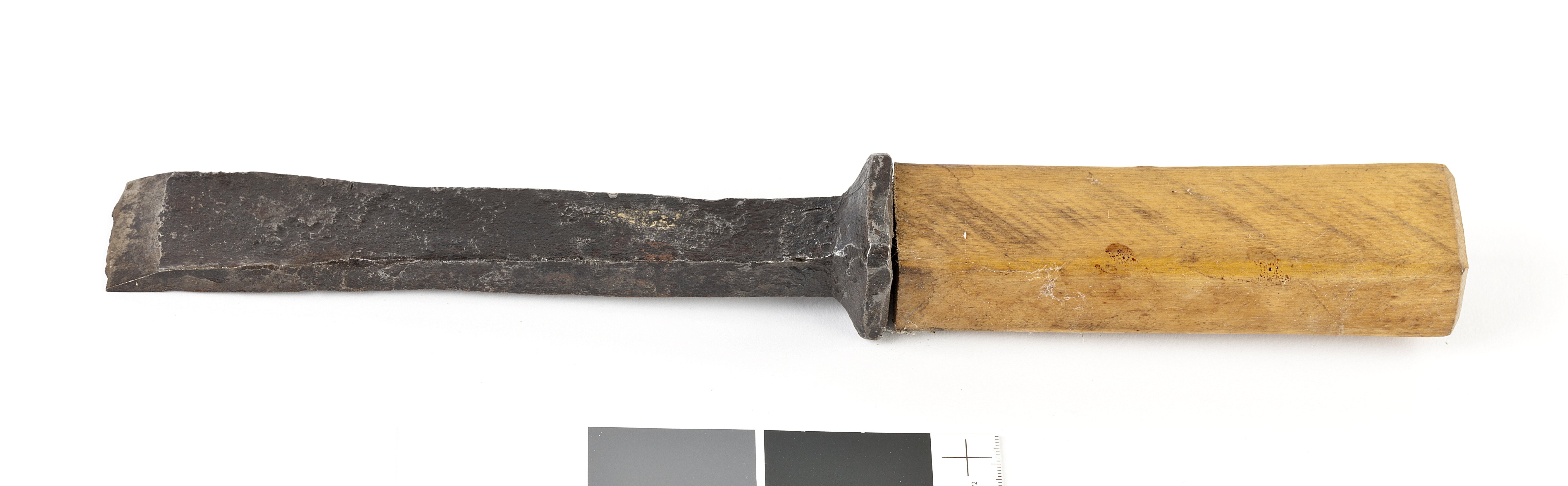 Grovt smidd klinga med rektangulär genomskärning. Rak egg, slipad från ena sidan. Vidgad bas. Nyskuret, rektangulärt skaft av buxbom.