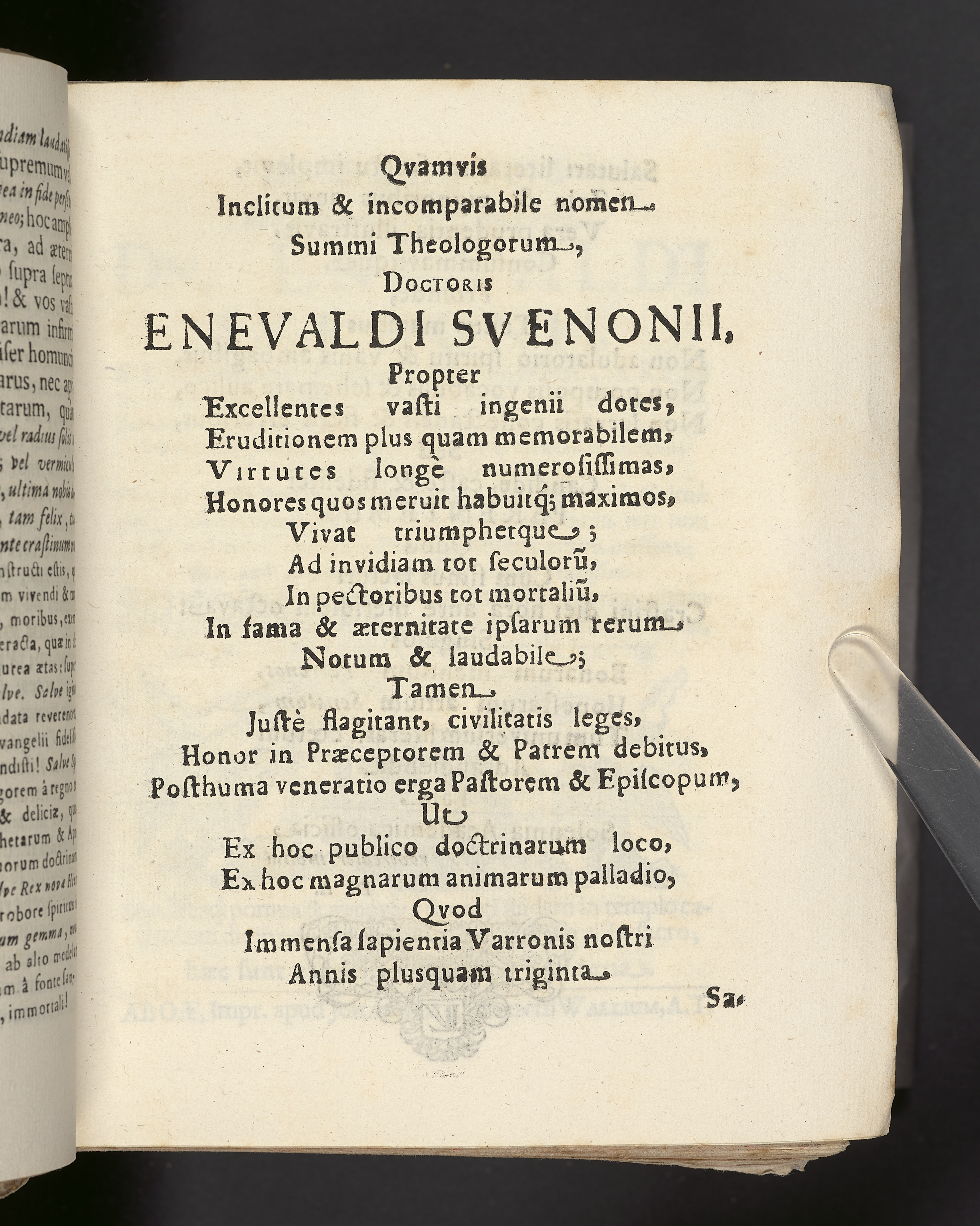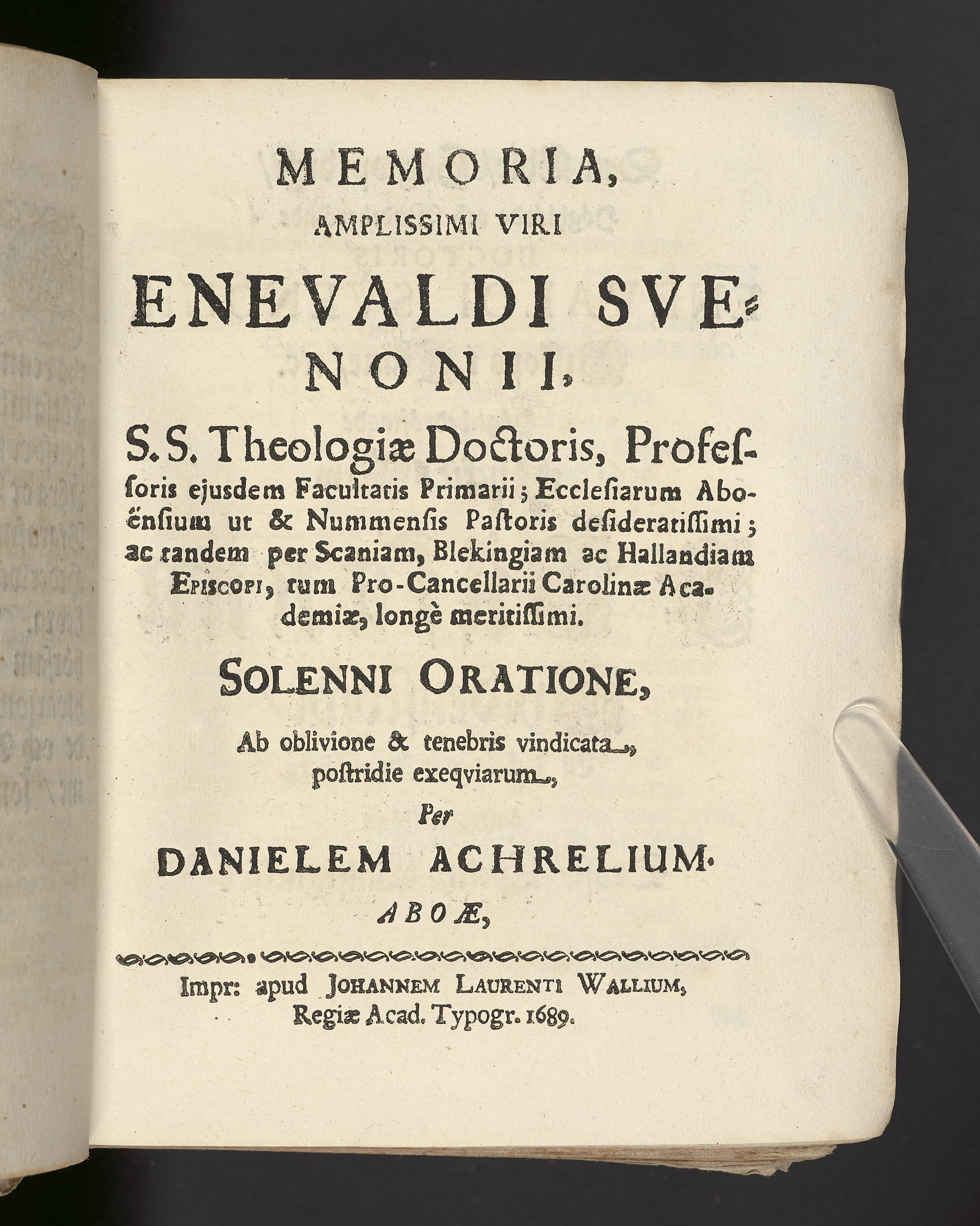 Memoria ... Enevaldi Svenonii ... solenni oratione ... per Danielem Achrelium. Aboæ. Impr: apud Johannem Laurenti wallium ... 1689.
