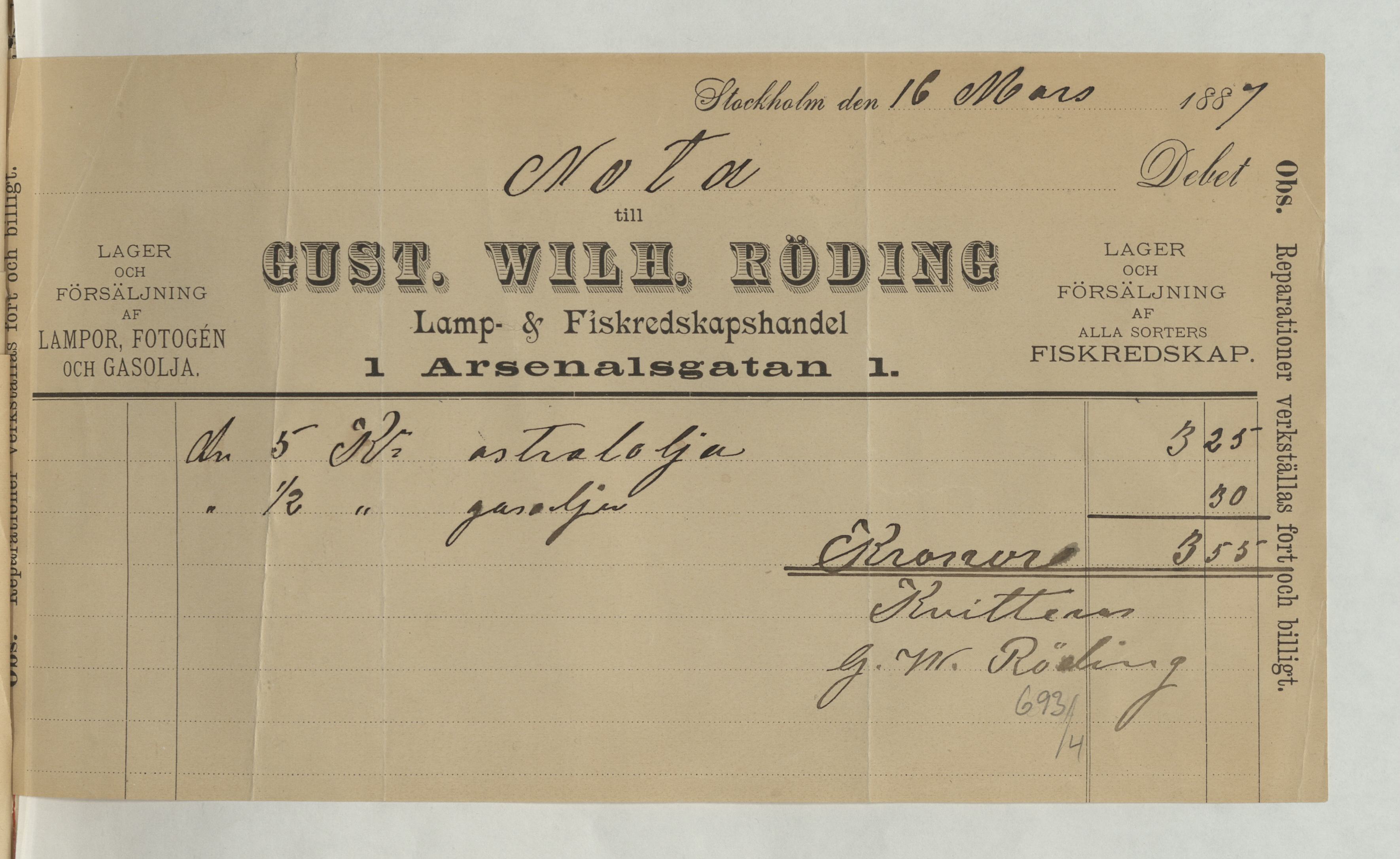 Kvitto från Gust. Wilh. Röding, Lamp- och Fiskeredskapshandel, på en summa av 3:55Kr. Stockholm 16 mars 1887.