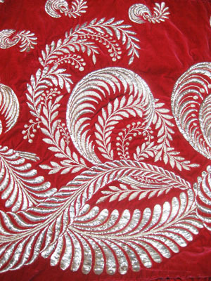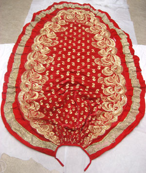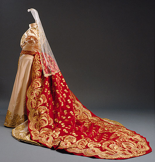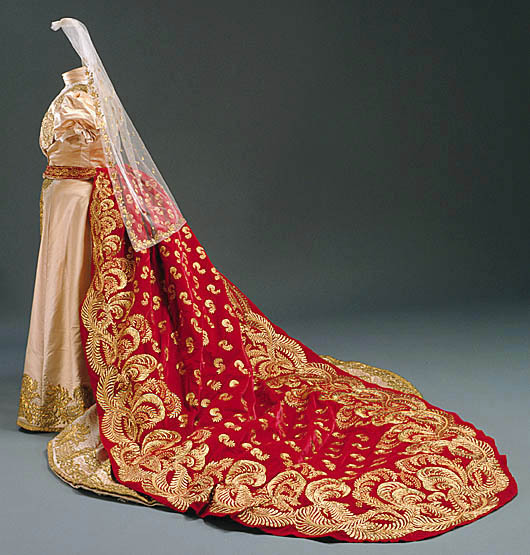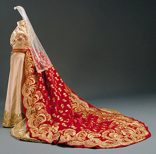 Troligen tillverkat för den franska kejsarinnan Joséphine (1763-1814) i början av 1800-talet. Släp av röd sammet i tre stycken. Rundad avslutning. Släpet har en rynkad volangkant runt om, bredd: 260 mm. Nio motveck upptill bak. Dekor i form av broderade växtslingor runt om samt strödda blad mitt bak, av slät, veckad och mönstrad guldlan på gul silke. Volangen dekorerad längs mitten med tyll broderad i rutor med guldlan. Tyllen har två rullar i överkant, klädda i guldlan. Linning i röd sammet fodrad med söd sidenatlas, bredd: 18 mm. Linningen fortsätter fram i två band, längd: 135 mm. Det vänstra bandet har en metallring i änden, tränsad med vinröd silke. Det högra bandet har en hake i vit metall. Mitt bak finns en gul sicksacksöm. Foder i gul sidenatlas. Mellanfoder av stärkt benvit tunn textil. Volangen fodrad i röd sidenatlas. Volangen förstärkt i ytterkanten med ett hårt böjbart material. Längs volangfodrets ytterkant finns fyra hällor i röd sidenatlas samt en hälla mitt bak vid volangens övre söm, bredd: 16 mm, längd: 145 mm. Ytterligare en hälla av gul sidenatlas, på högra baksidan, mot volangens foder, bredd: 20 mm, längd: 170 mm. Drottning Sofia och Oscar II gifte sig den 6:e juni 1857 och firade sin guldbröllopsdag femtio år senare, 1907. Senare detta år, i december avled kungen.