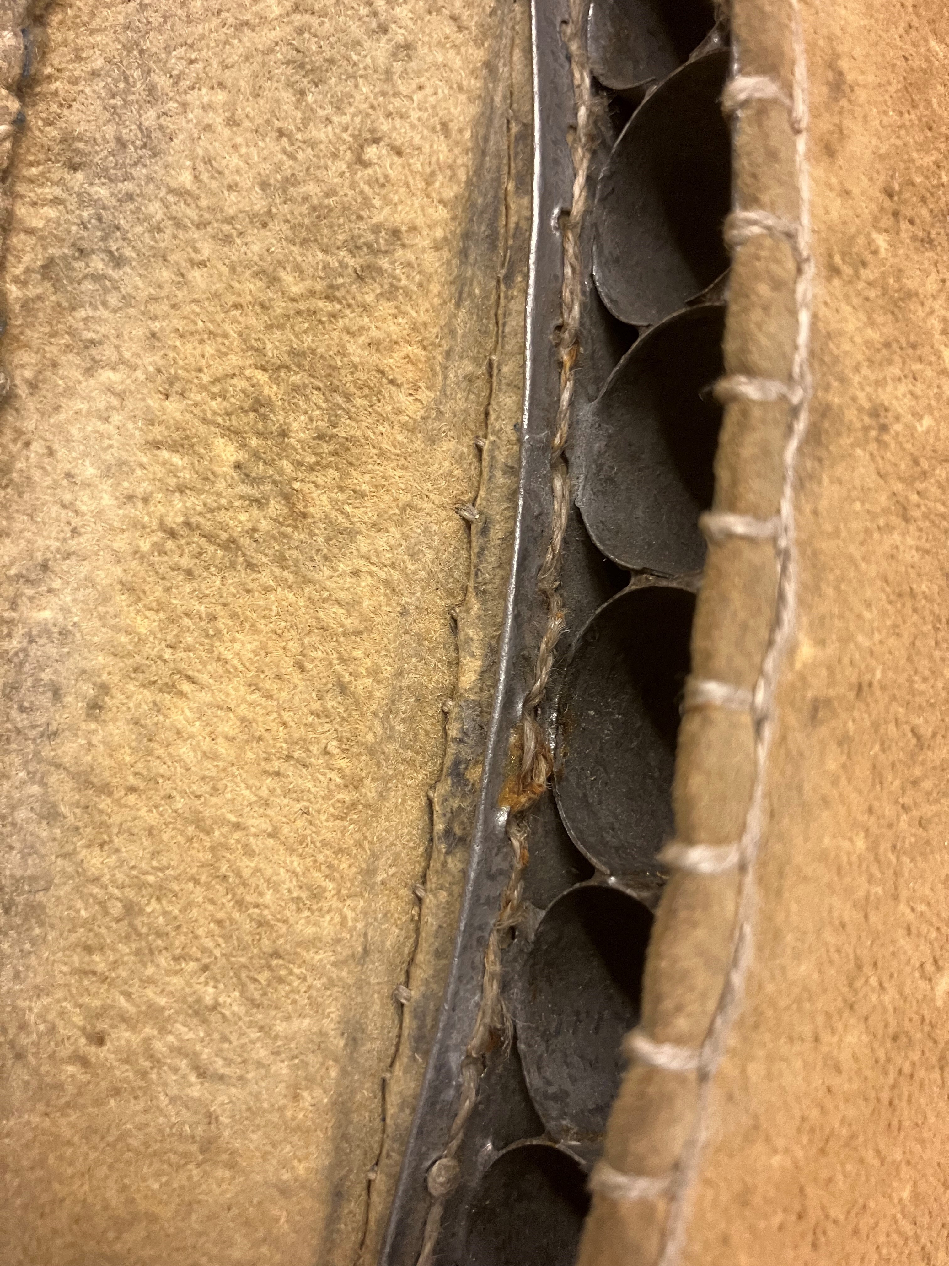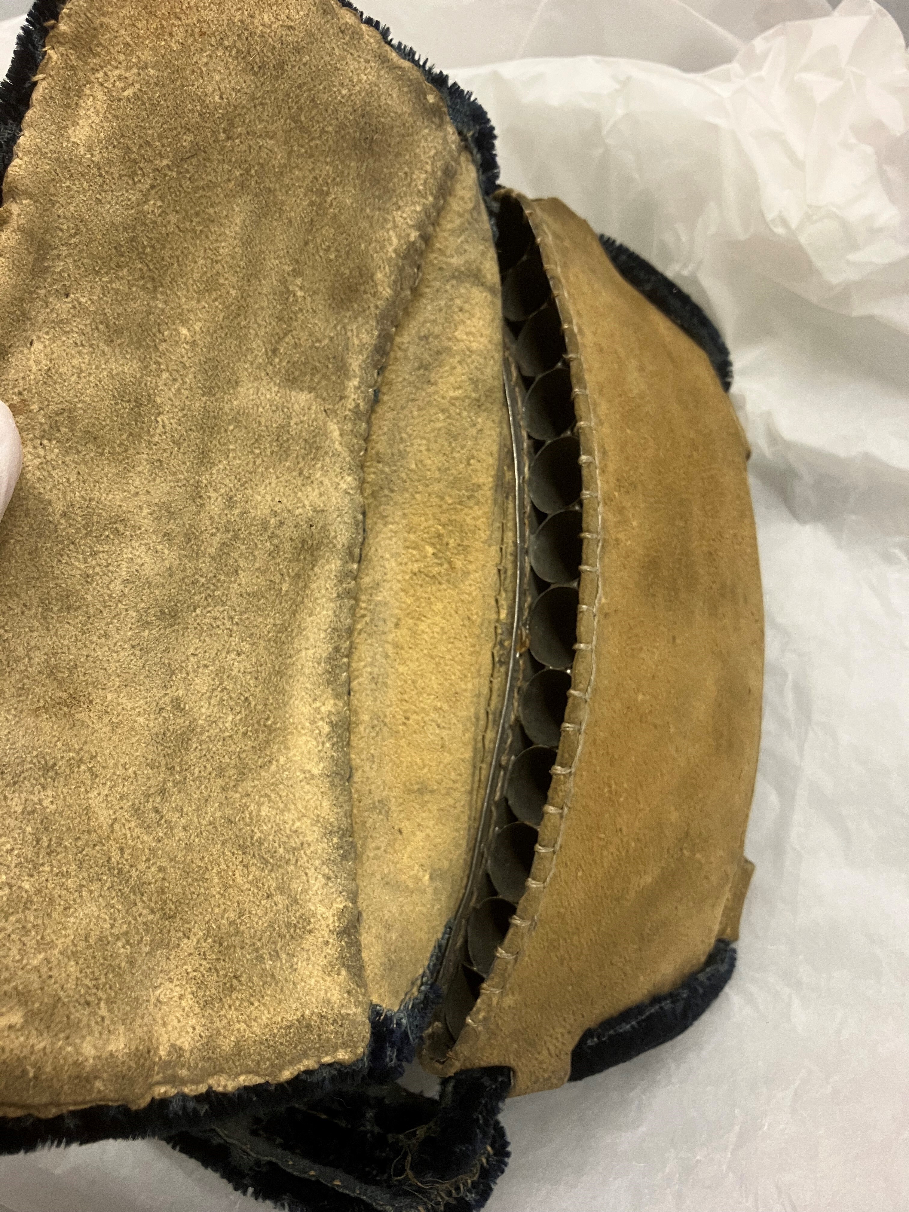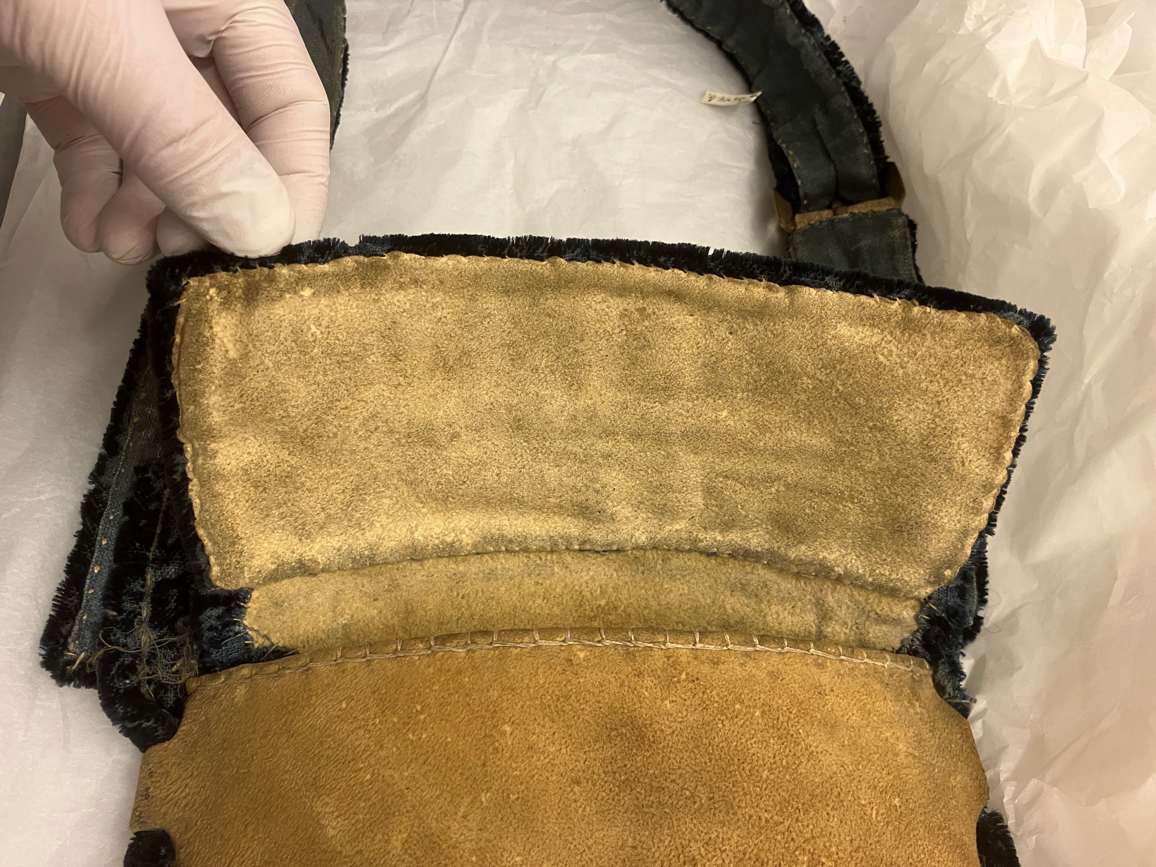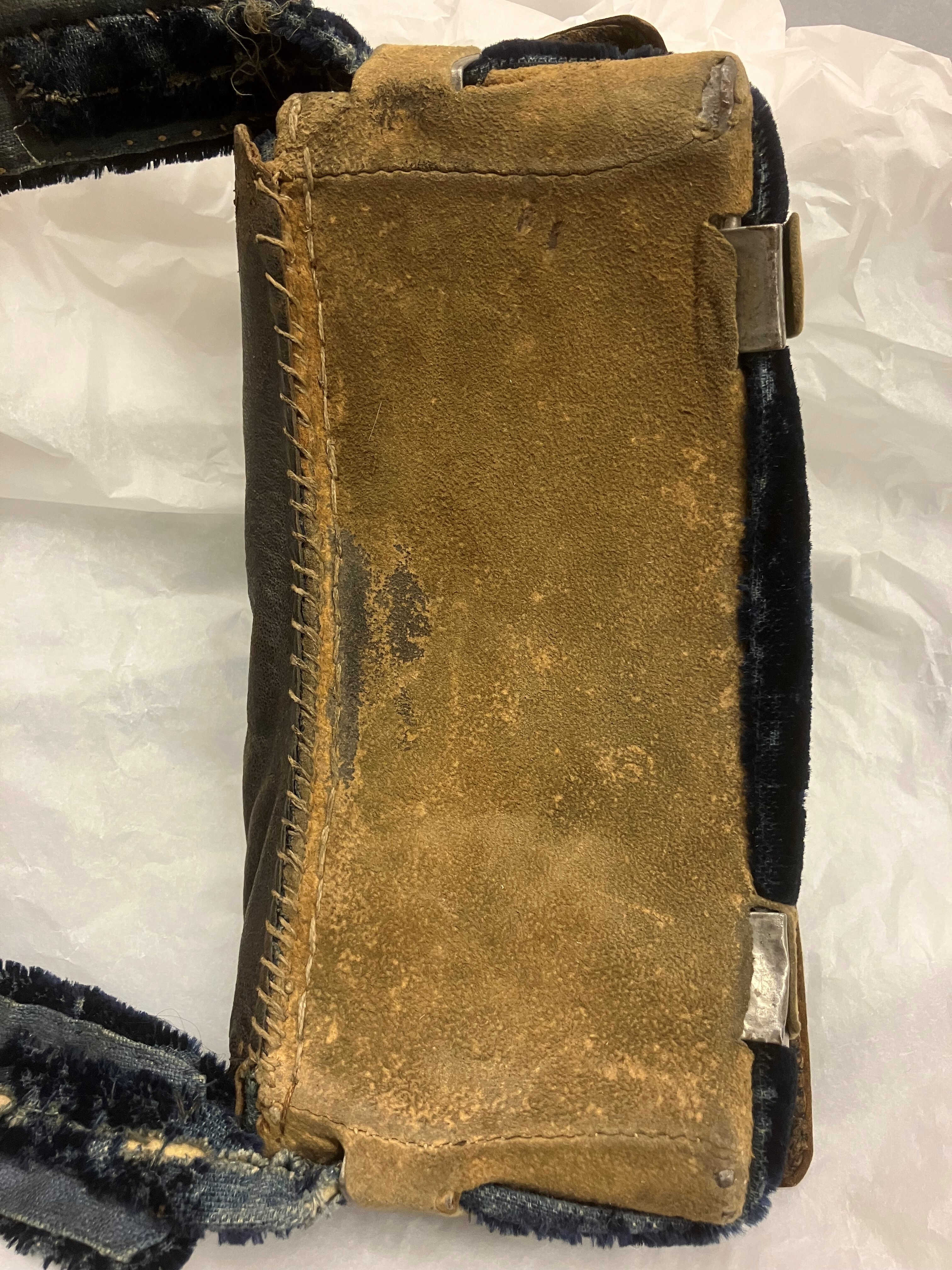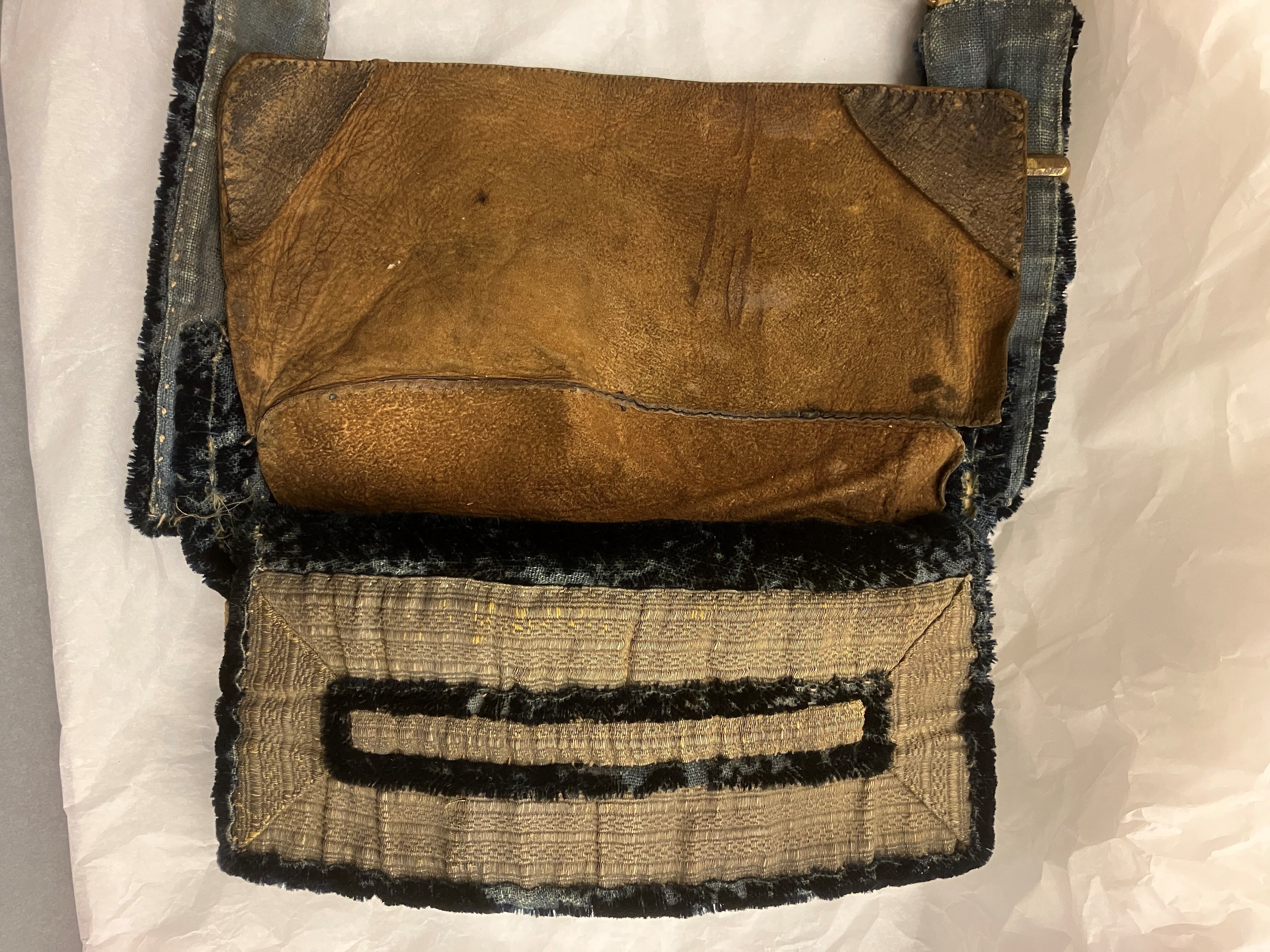 Tillägg: Väskans axelrem framstår som fastsydd i två avskurna smalare remmar, klädda i schagg. Detta antyder att väskan skulle kunna ha varit försedd med en smalare rem tidigare.