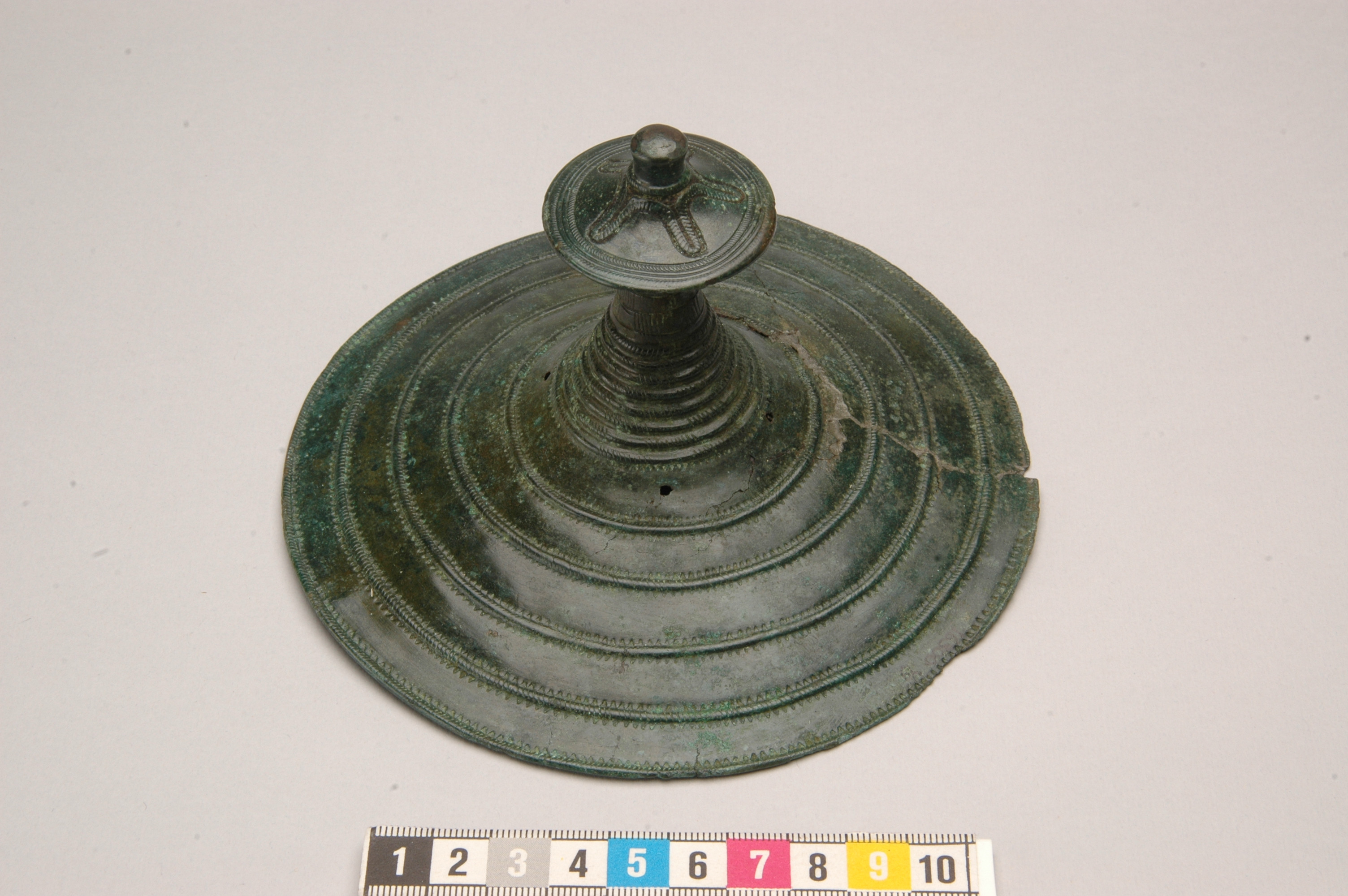 Bälteplatta av brons med upphöjda ränder, vilka ornerats med inpunsade streck. De upphöjda ränderna begränsas av instämplade trekanter. Hatten har ett fördjupat stjärnmönster.