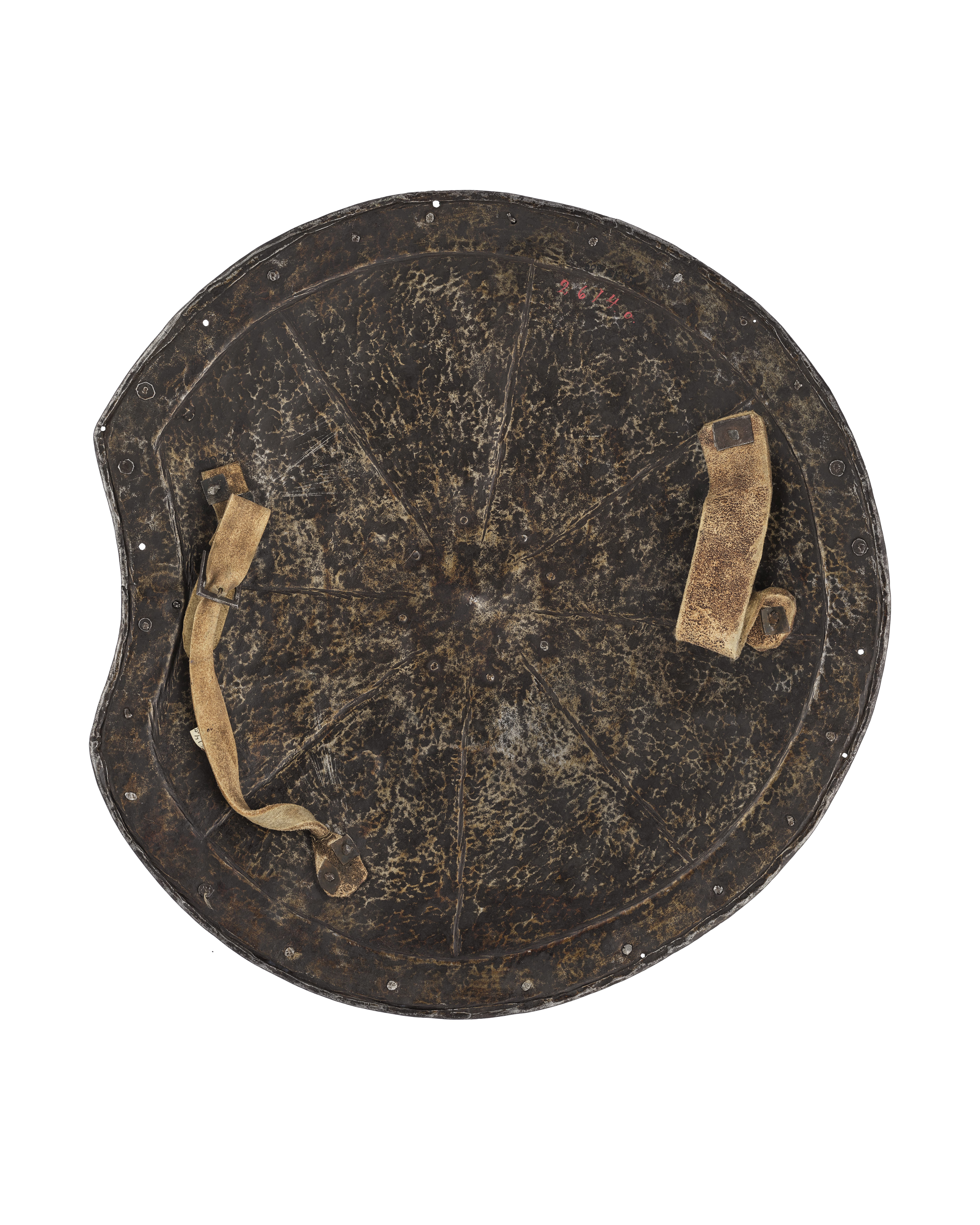 Rund sköld av dubbel stålplåt, ett segment avtaget på ena sidan, svängd kantlinje. Kantvulst med repstavsdekor, därinnanför en försänkt bård, b: ca 30 mm, i bården 26 nitar (3 saknas), dessutom fem hål i ytterkanten. Rund mittplatta, d: ca 110 mm, fäst med åtta nitar med välvda huvuden, konturerad kant i form av åtta bågar. Plattan i mitten uppdragen i spets med fyrsidigt huvud, mittspetsen flankerad av två nitar med välvda huvuden. Dessutom fästnitar för baksidans läderremmar, två enkla för handremmen och två dubbla för spännremmen. Baksidan endast grovhamrad, indelad i åtta cirkelsektorer. Handrem av läder, b: 40 mm, rest av färg. Spännrem, b: 25 mm med rektangulärt spänne av stål, en klo.