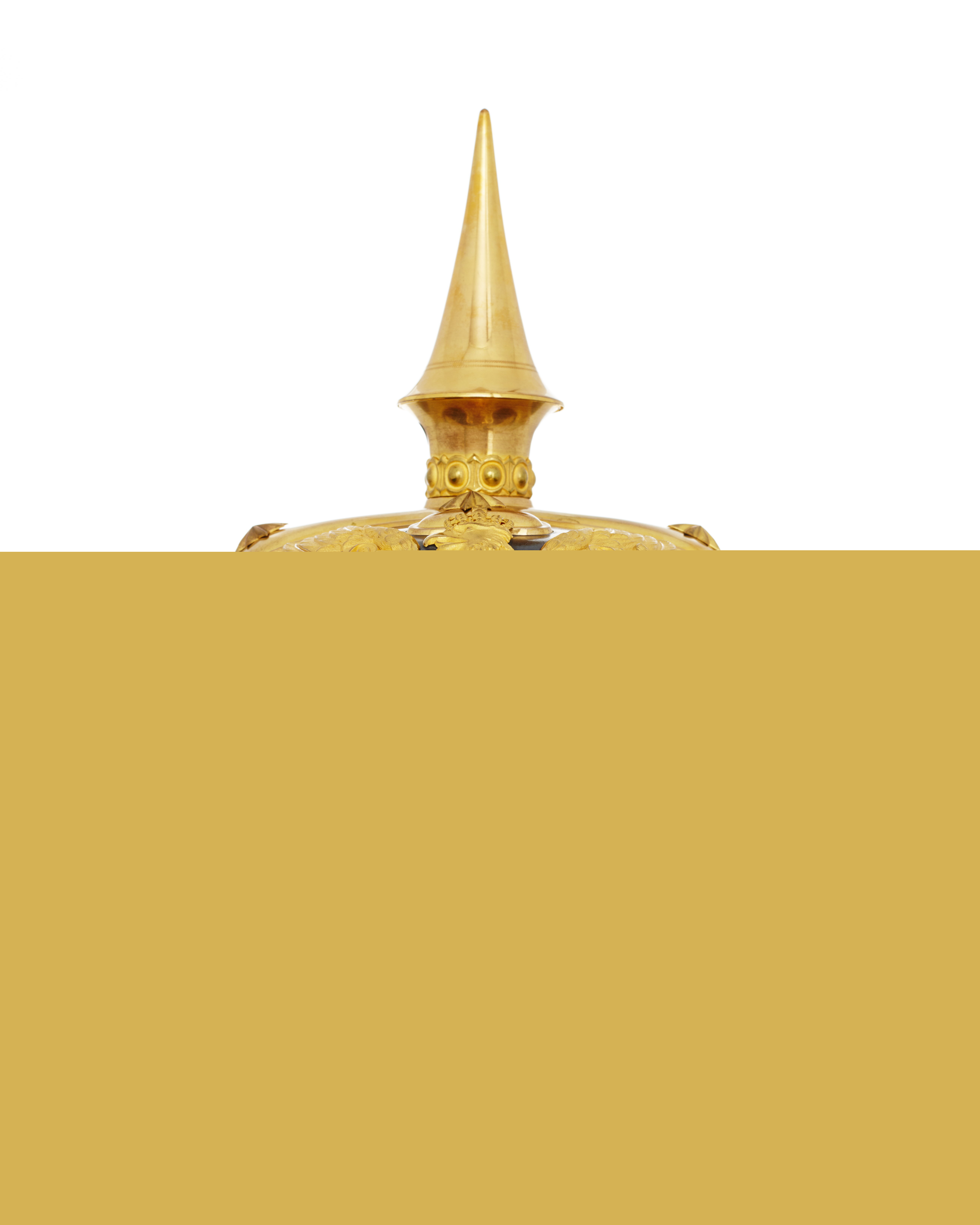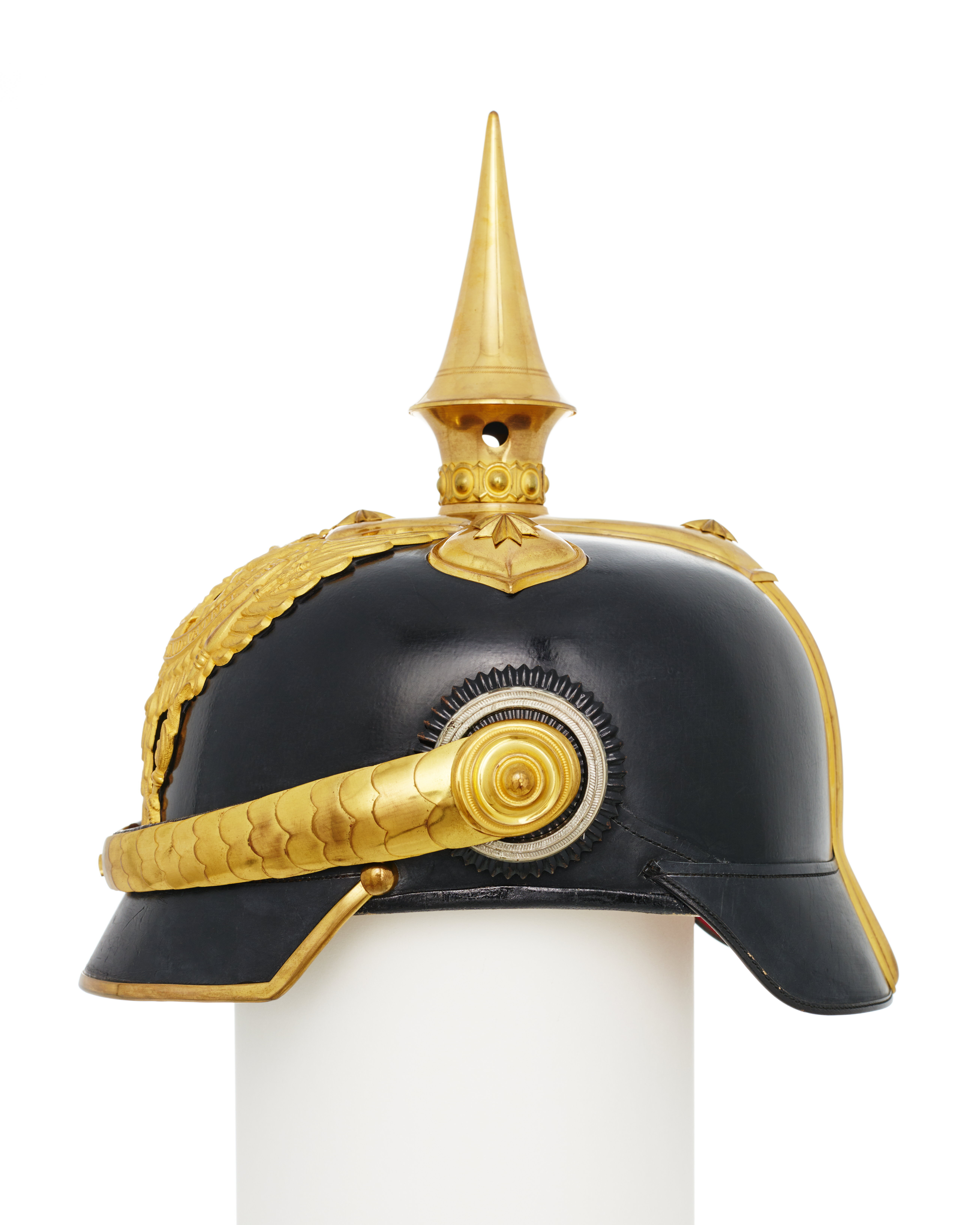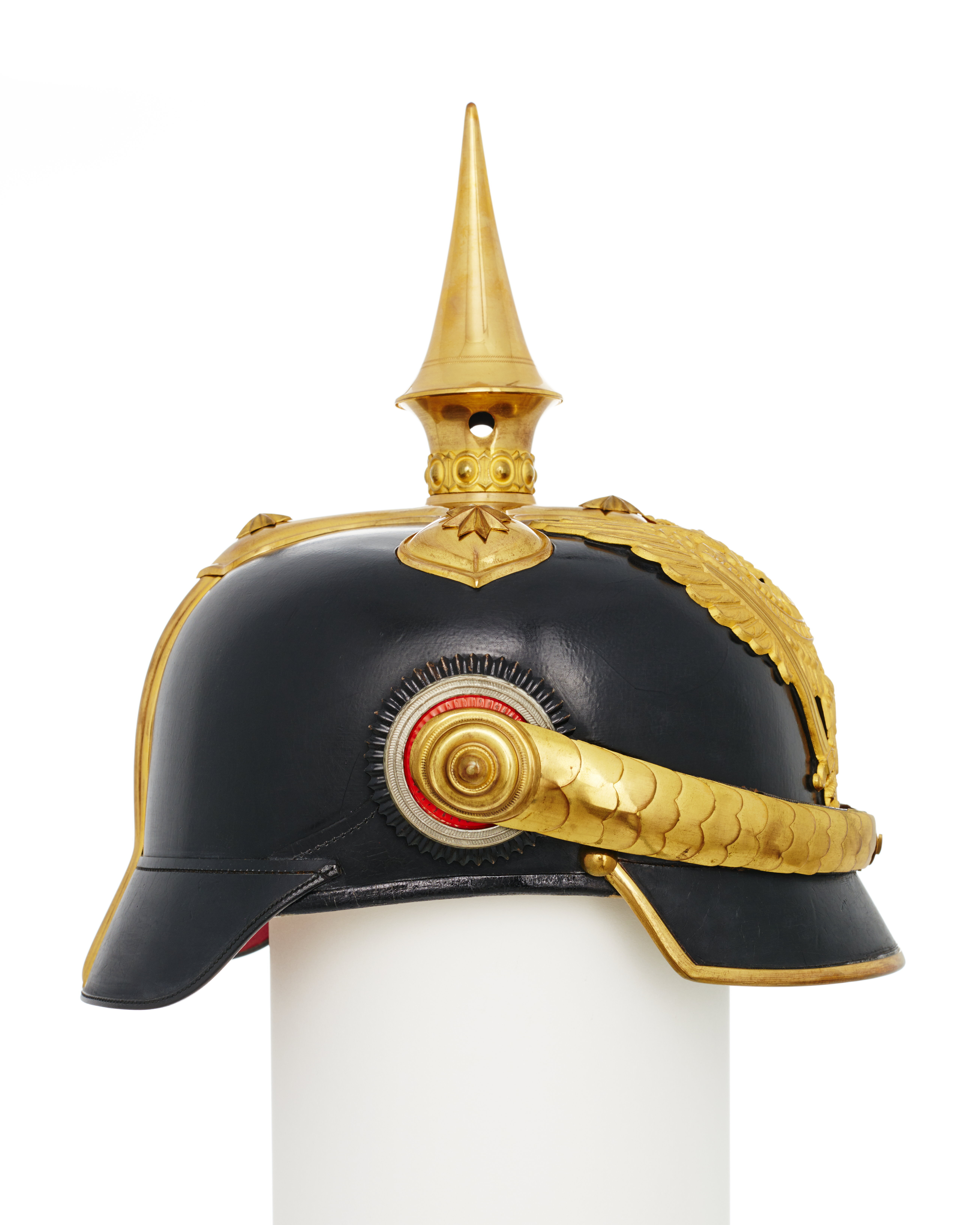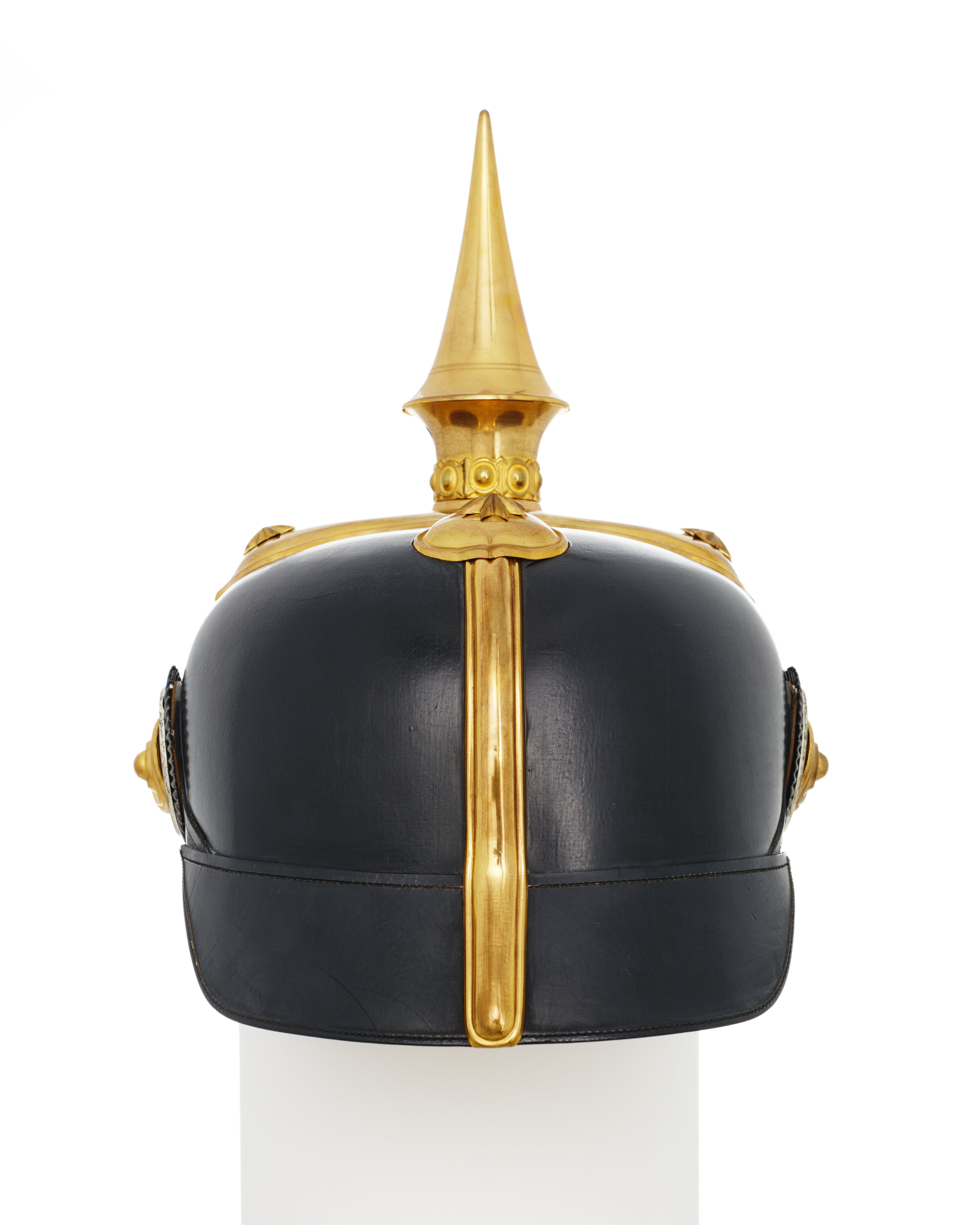Hjälm av svart läder med beslag av förgylld mässing. Plåt i form av tyska örnen med språkband: "MIT GOTT FUER KOENIG UND VATERLAND". På mitten ett fyrarmat beslag med avskruvbar 95 mm hög spets. Hakband av svart läder med fjälliknande beslag av mässing. Vid båda fästena kokard av stål, den vänstra svartlackerad med vitmetallring, den högra med rödlackerad inre cirkel. Svettrem 55 mm bred av ljust skinn med tandad kant. Foder av vit sidenrips samt i kullen firmanamn: "M. Neumann // Hoflieferant Sr Majestät des Kaisers und König und Sr Königlichen Hoheit des Prinzen Friedrich Leopold von Preussen // BERLIN W. // Friedrichstr. 79a // Kopfmass 55 1/2 // Com. -No CP // Datum 6.10.06".